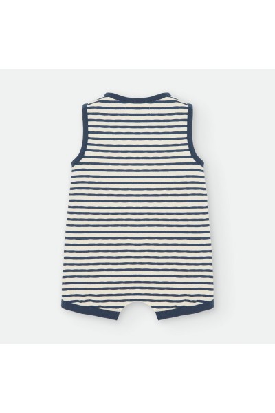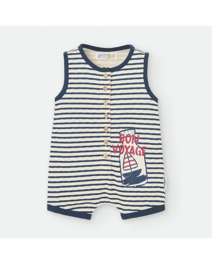 Pelele corto en estampado de rayas en tono beige y azul marino, ilustración lateral de velero con la frase «Bon Voyage». Abertura en en pecho con botones de madera y en la zona del pañal con corchetes.