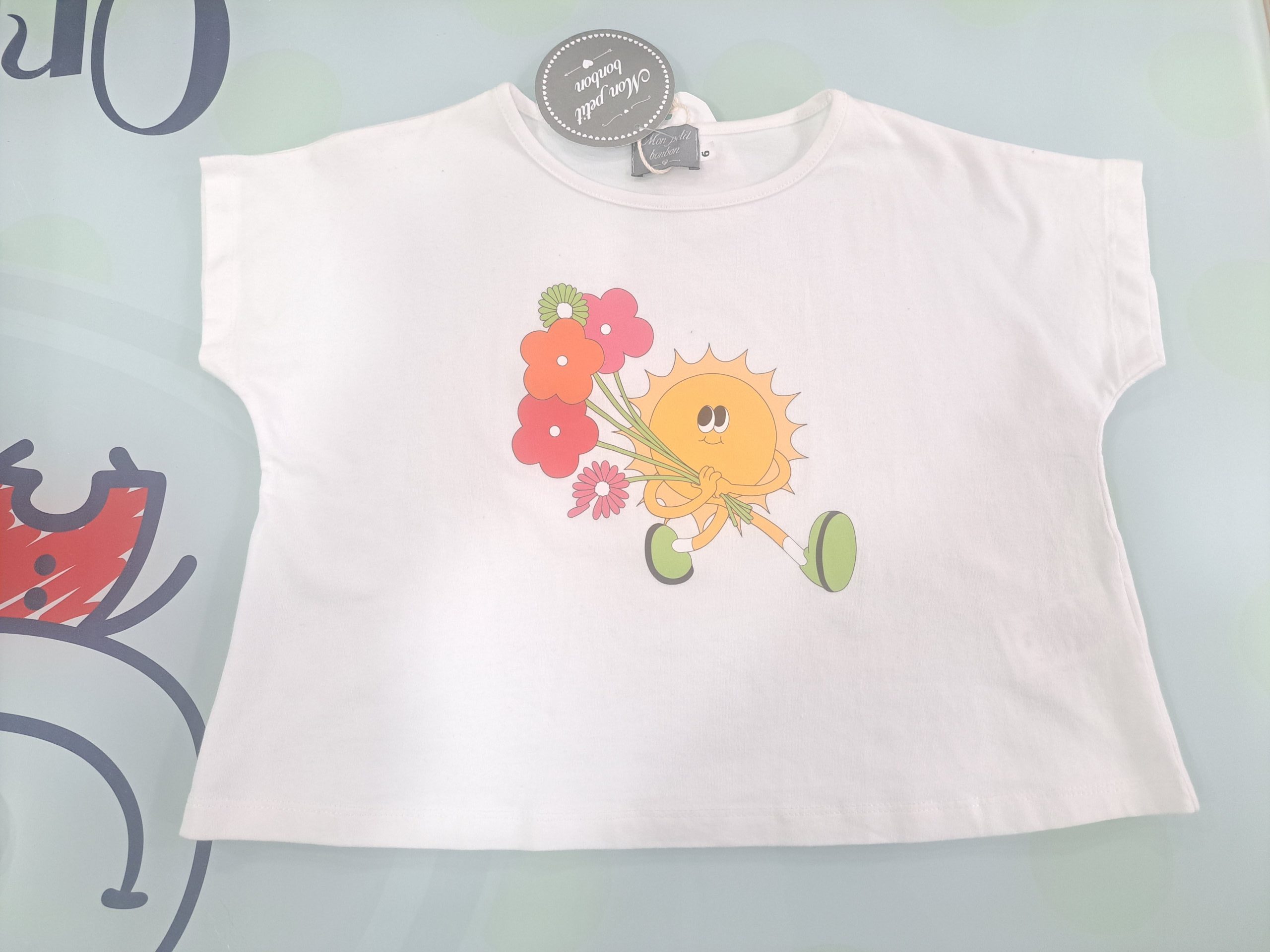 Conjunto formado por camiseta corta color blanco con ilustración de sol y flores + short en mismo color con, bolsillos laterales, cintura elástica y falso cordón.