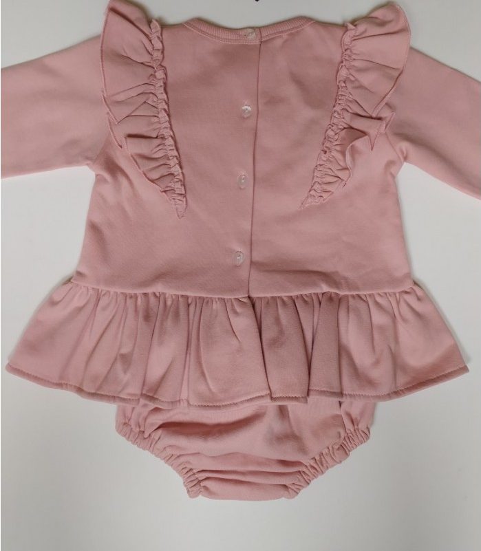 Jesusito en color rosa con ilustración de gatito jugando con un ovillo en tonos gris, rosa y mostaza. Volantes en hombros y en falda. Apertura trasera mediante botones, mangas y cuello elásticos. Afelpado por dentro.