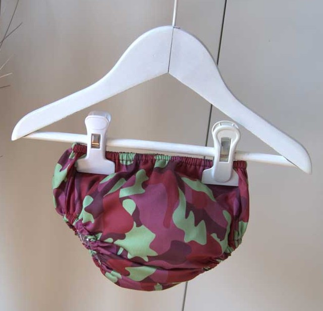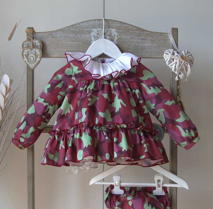 Jesusito en estampado camuflaje de la familia campanilla en tonos burdeos y verde. Cuello de volantes en color blanco y bajo acabado en volantes, ambos ribeteados en color burdeos. Cierre en espalda con cremallera. Braguita en mismo estampado.
