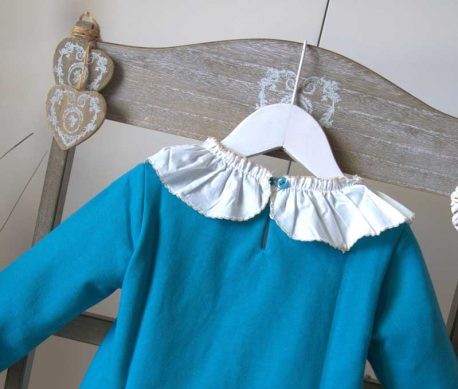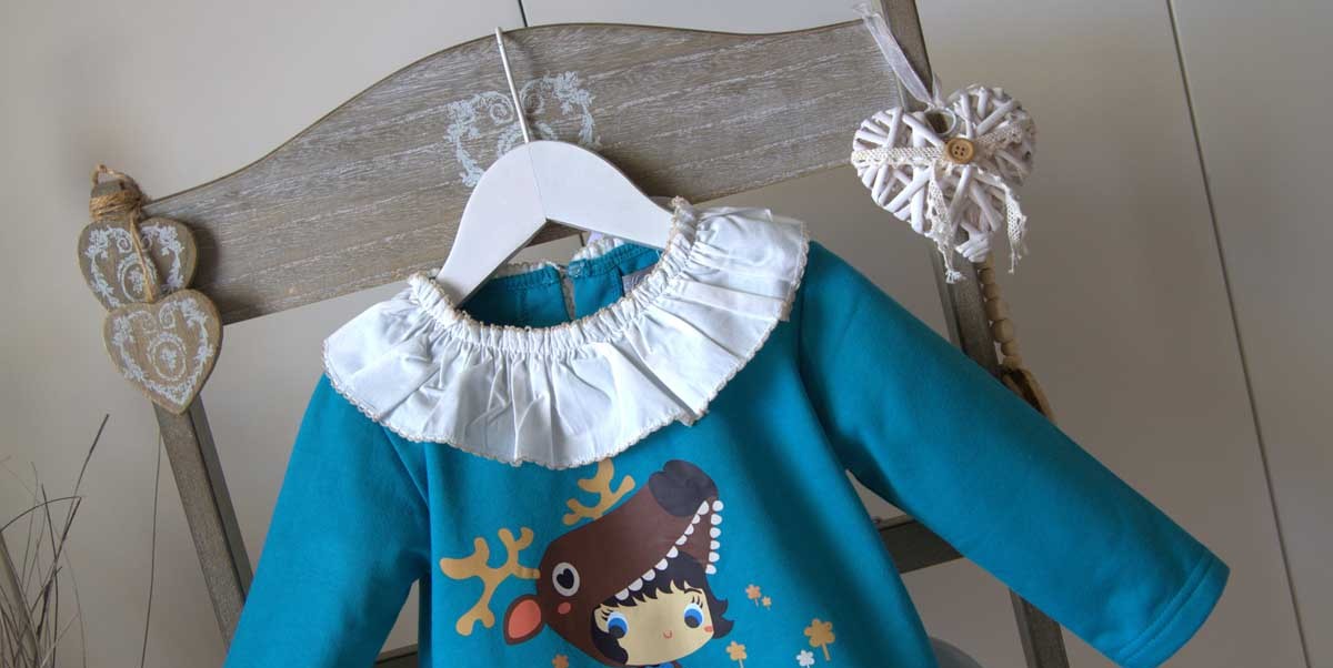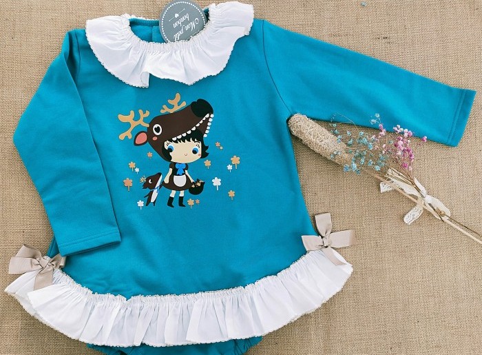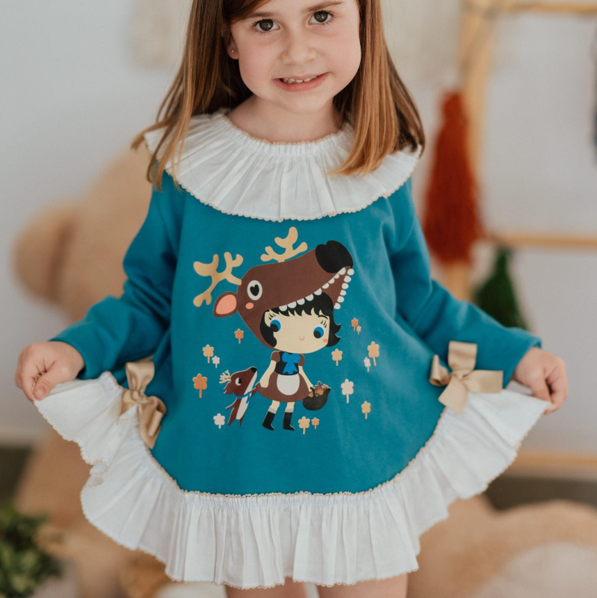 Jesusito en color turquesa, de corte evasé, ilustración central de niña ciervo, lazos laterales en color beige, cuello y bajos de volantes en color blanco. Abertura por detrás del cuello con botón y forro interior de felpa. Braguita en mismo tono.
