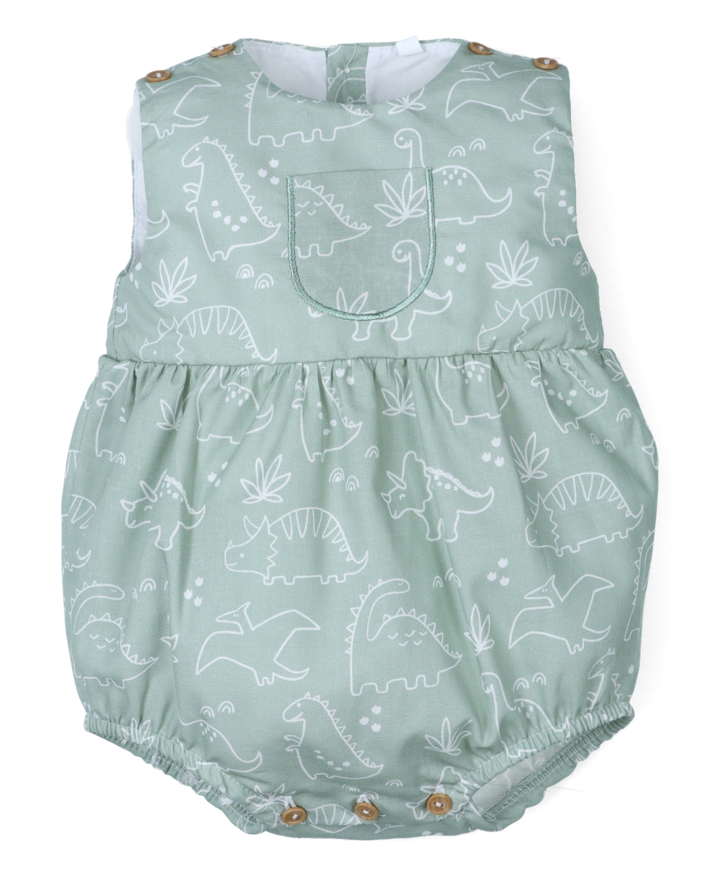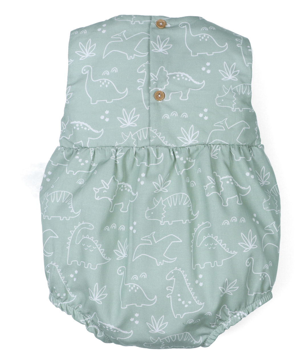 Pelele unisex color verde y estampado de dinosaurios. Bolsillo central, abertura en espalda y zona del pañal con botones.