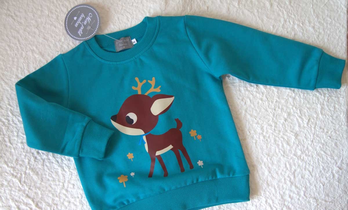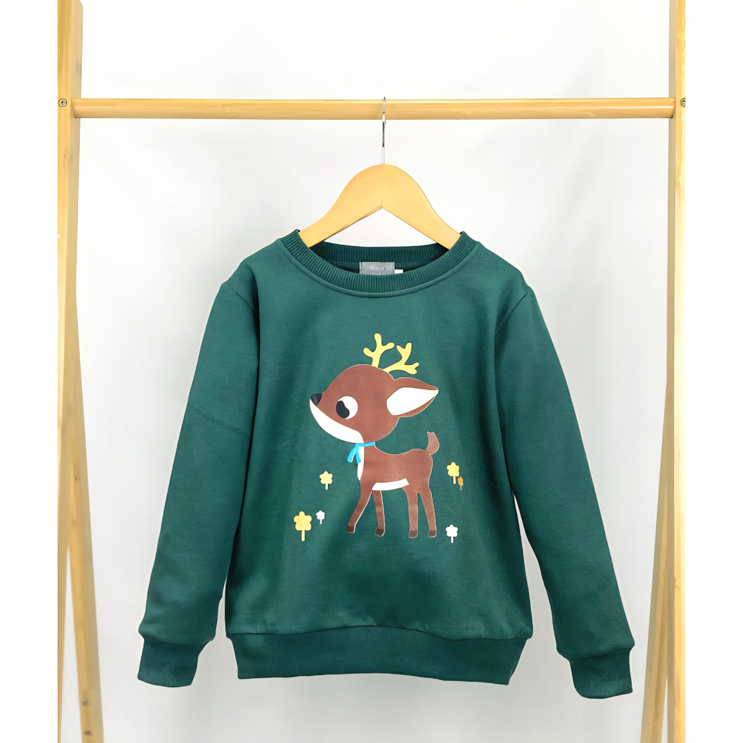 Sudadera color verde botella o azul,  ilustración central de ciervo con forro interior de felpa. Esta sudadera es ideal para combinar con la ranita ciervo.