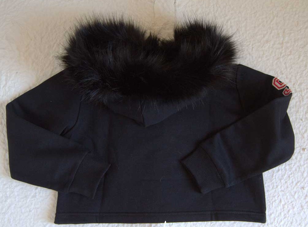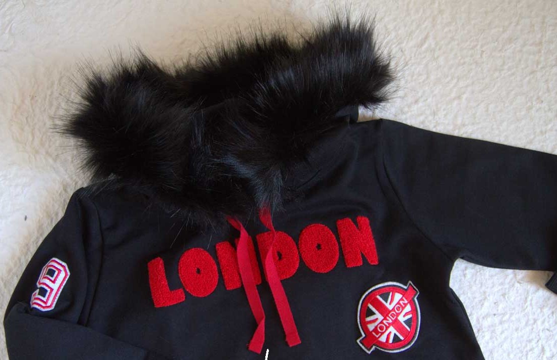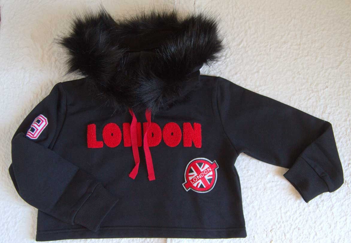 Sudadera corta en color negro, capucha ribeteada de pelo negro suave por todo el contorno, cordoncillos rojos, la palabra LONDON sobrecosida en fieltro de rizo rojo en pecho y debajo parche redondo sobrecosido con la bandera inglesa.  Cuenta con puños elásticos negros y bajo negro recto sin elástico. Forro interior en un afelpado suave.