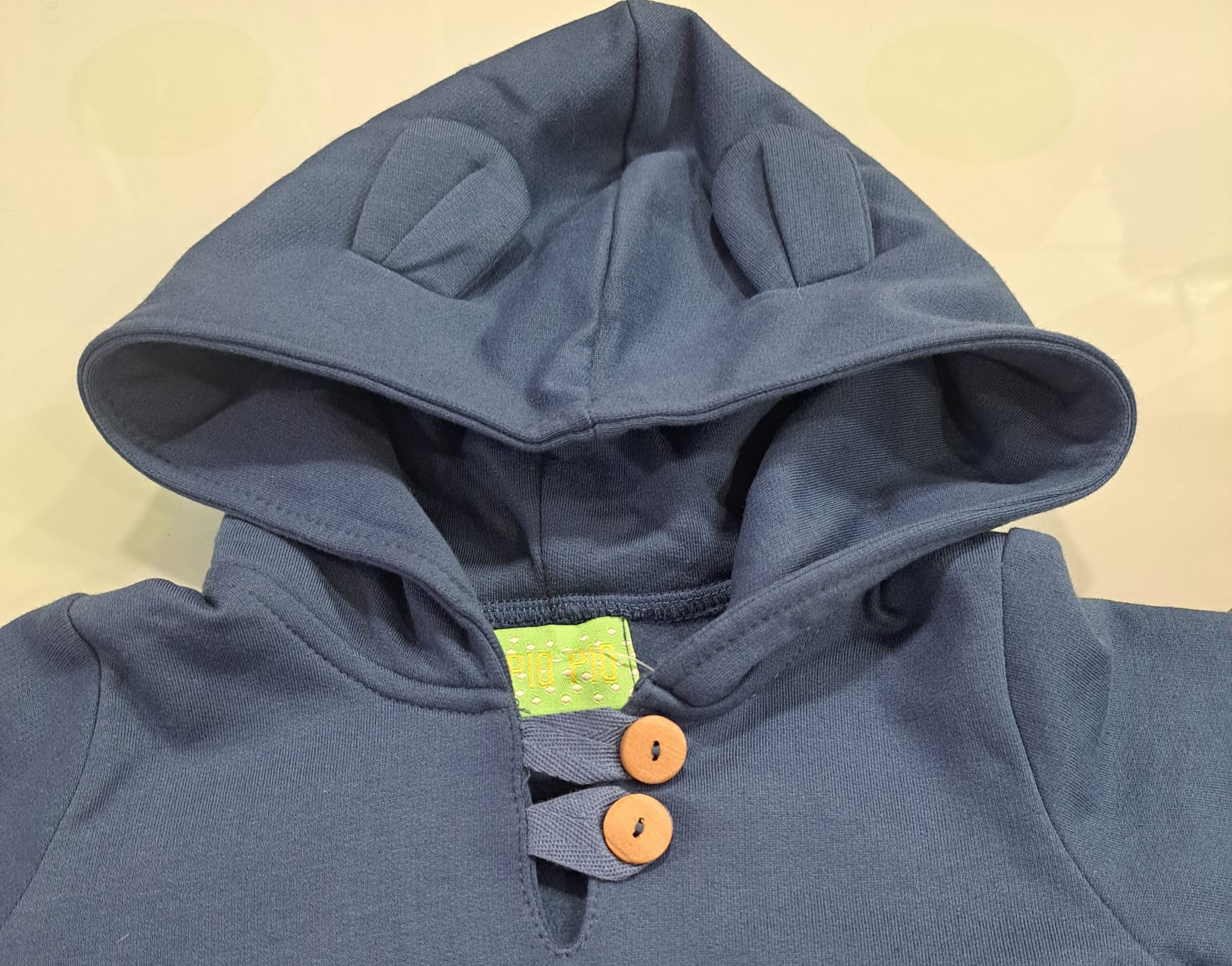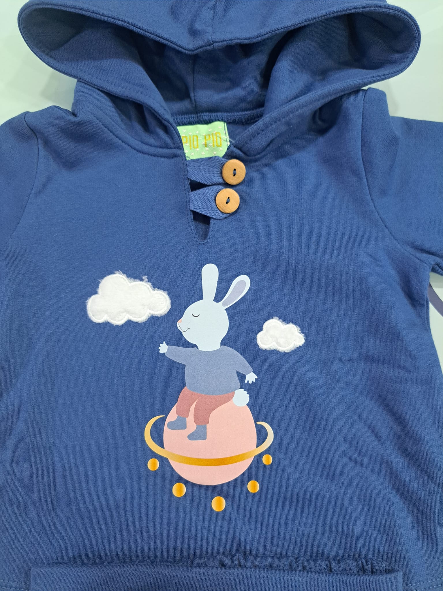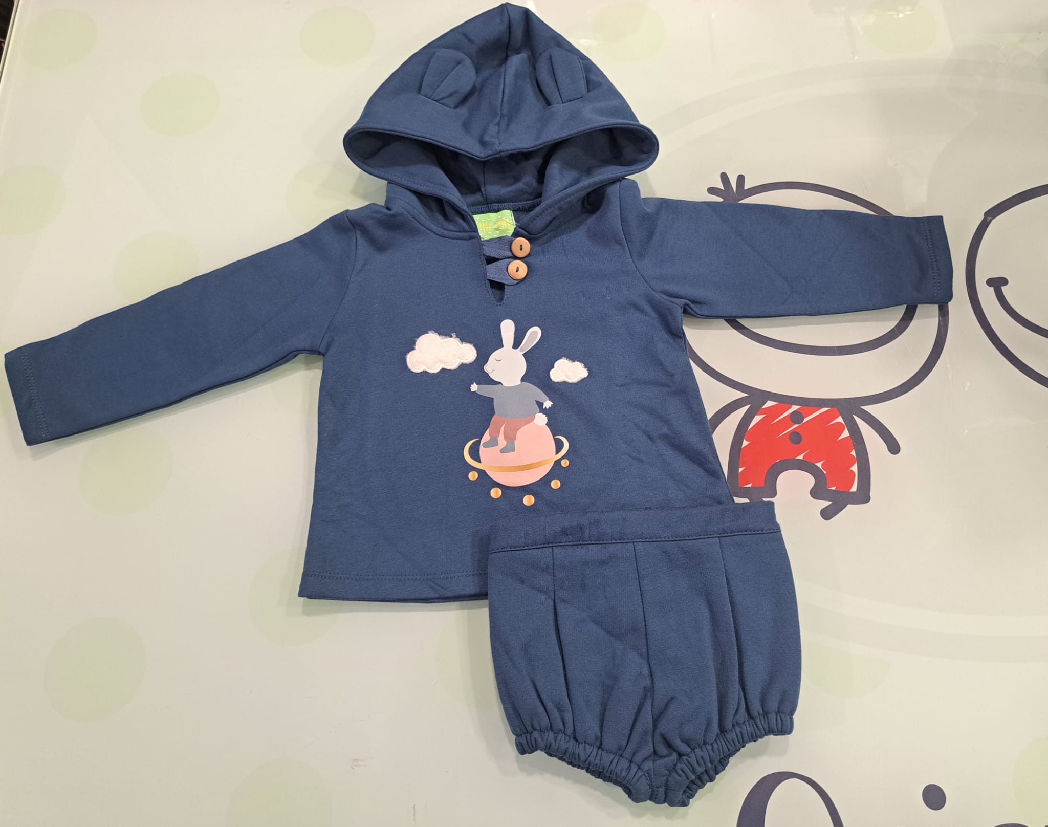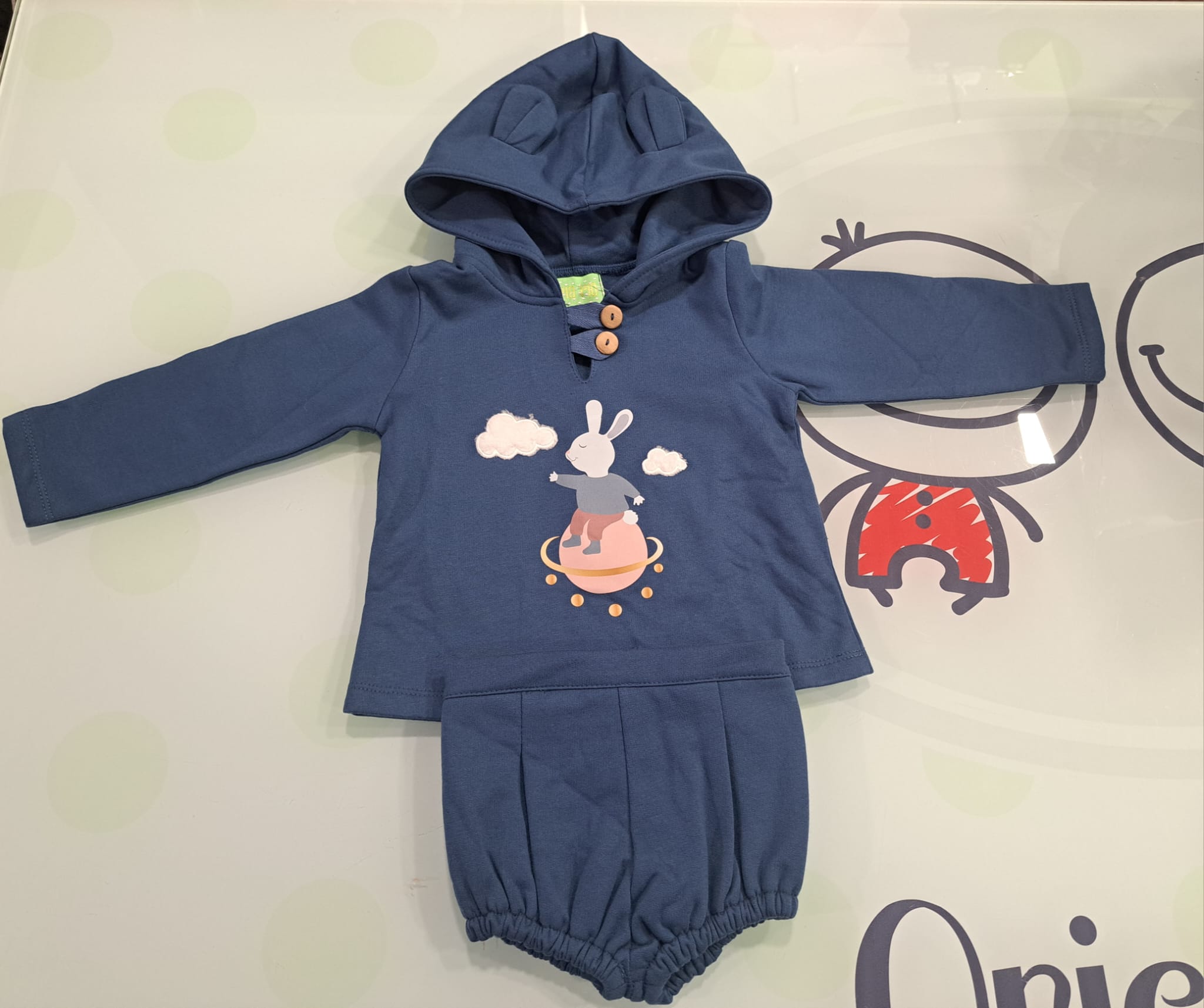 Conjunto formado por sudadera color azul marino, ilustración central de conejo espacial con nubes de algodón en 3D, capucha con orejas y cierre con dos botones en cuello. Ranita en mismo tono con cintura con elástico en la parte trasera. Forro interior en un afelpado suave.