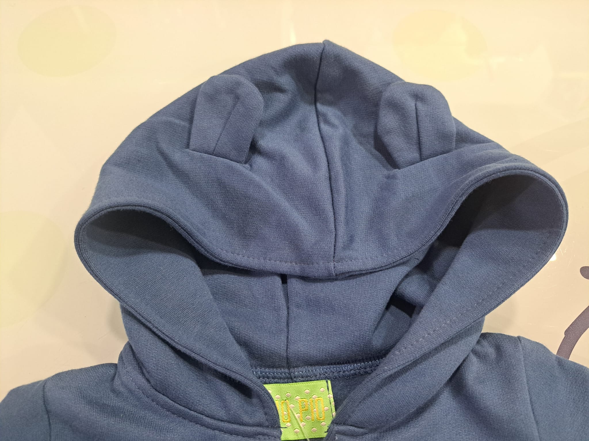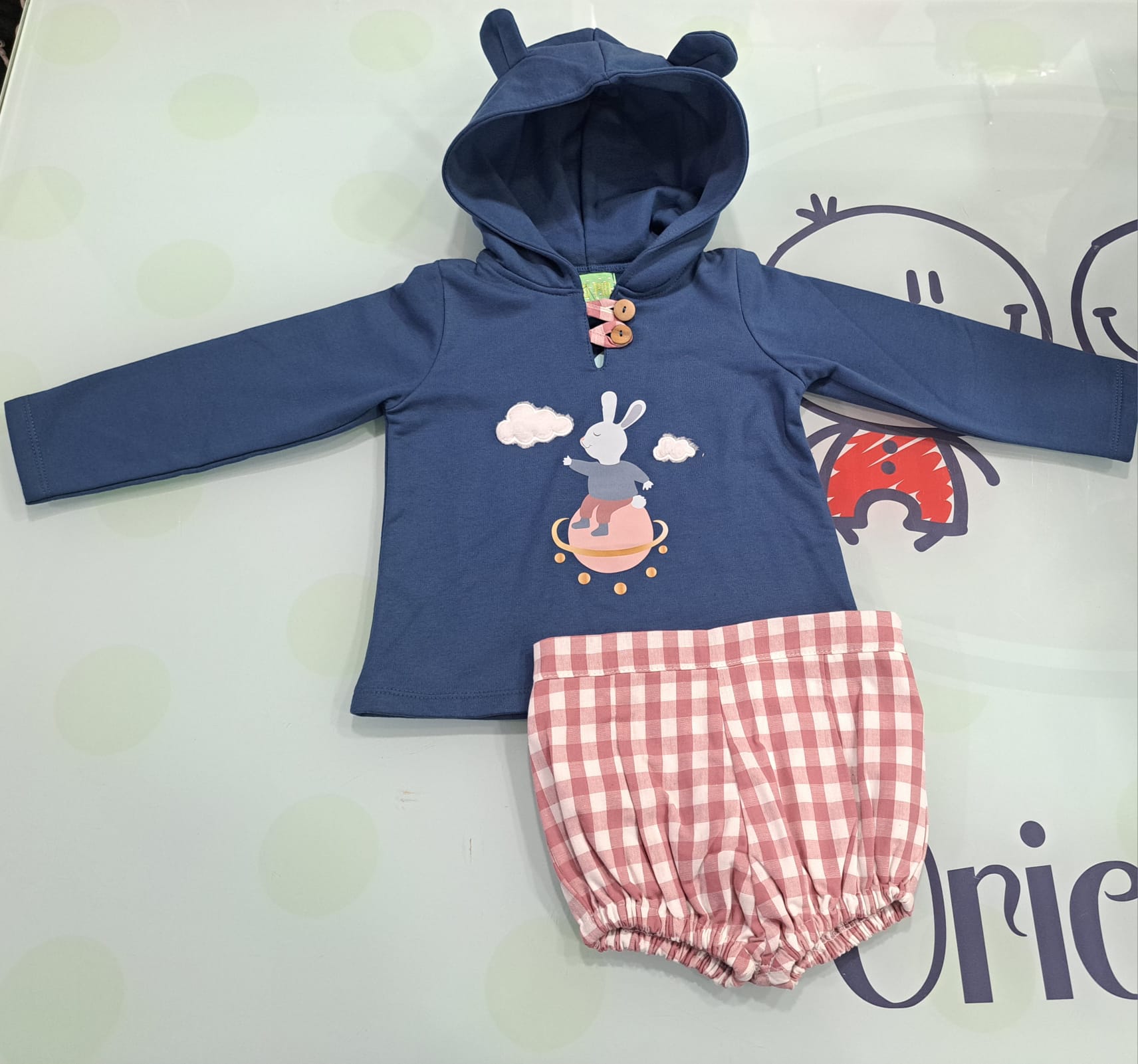 Conjunto formado por sudadera color azul marino, ilustración central de conejo espacial con nubes de algodón en 3D, forro interior de felpa, capucha con orejas y cierre con dos botones en cuello. Ranita en estampado vichy en color rosa y blanco con cintura con elástico en la parte trasera.