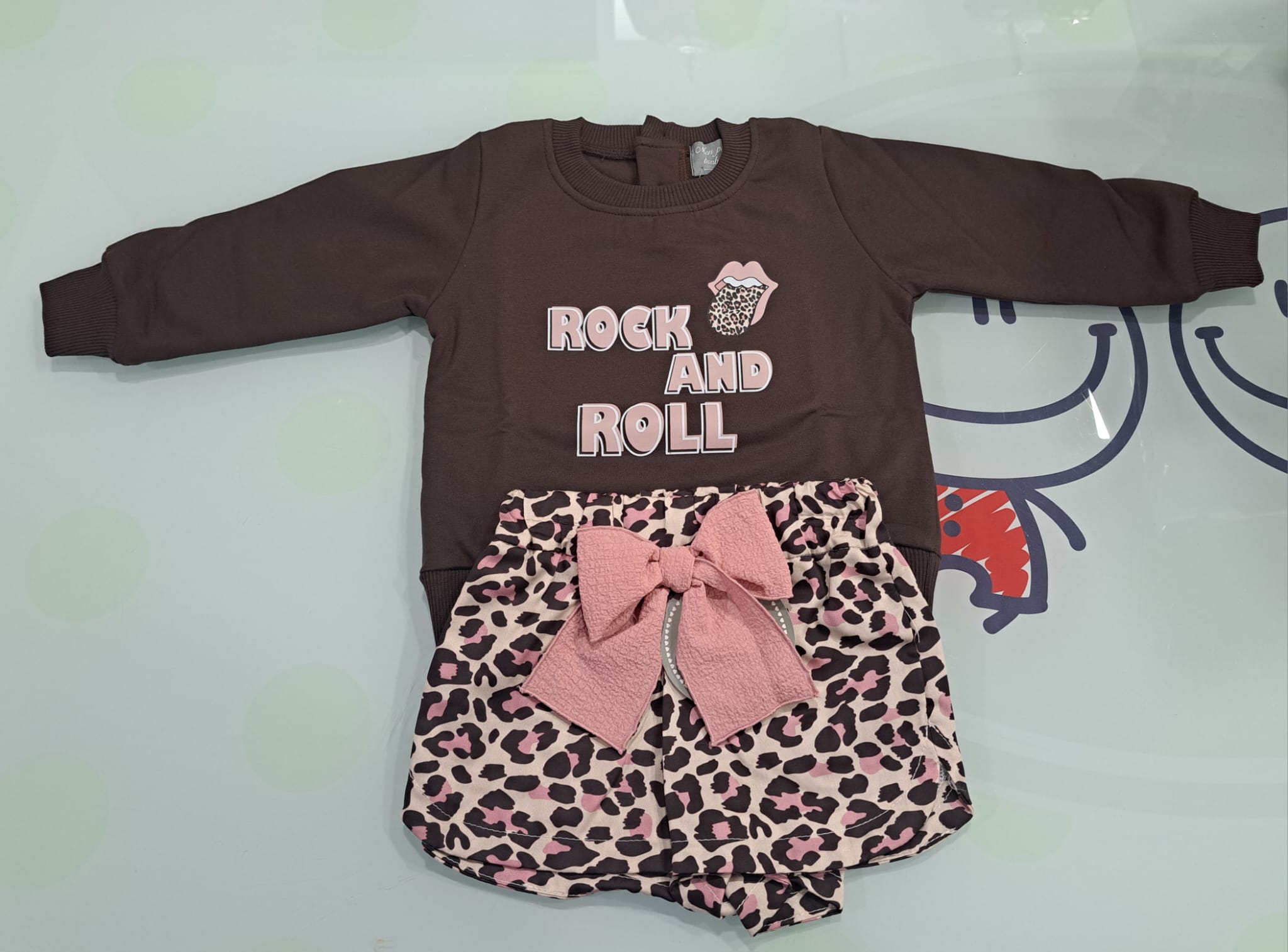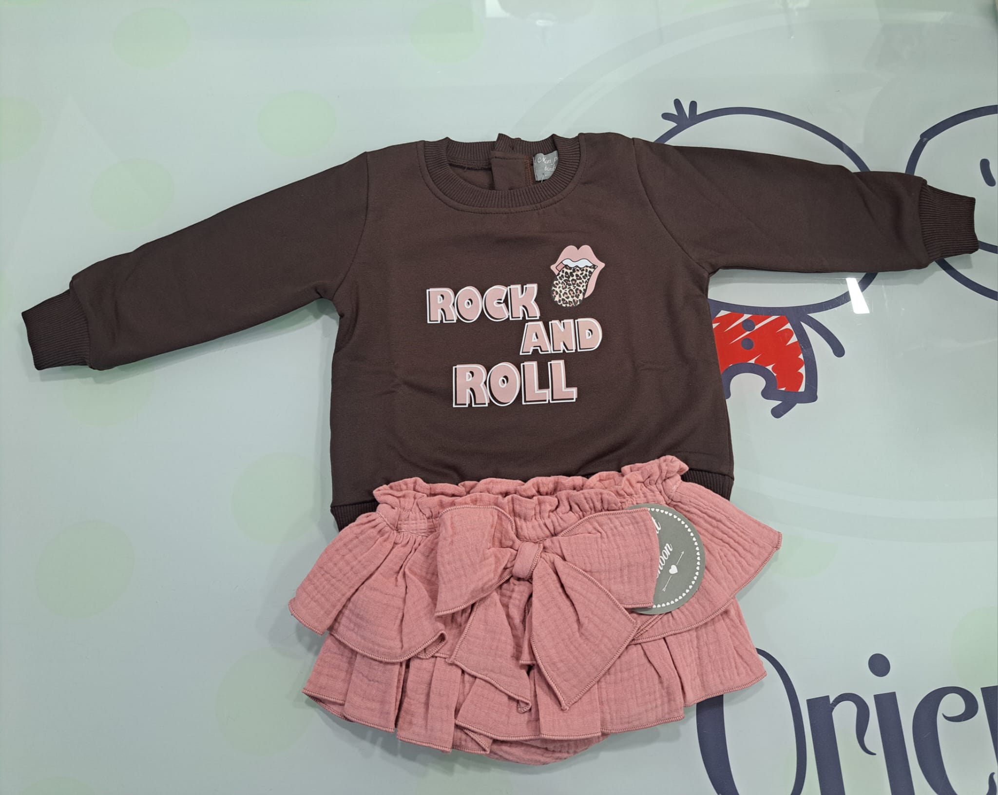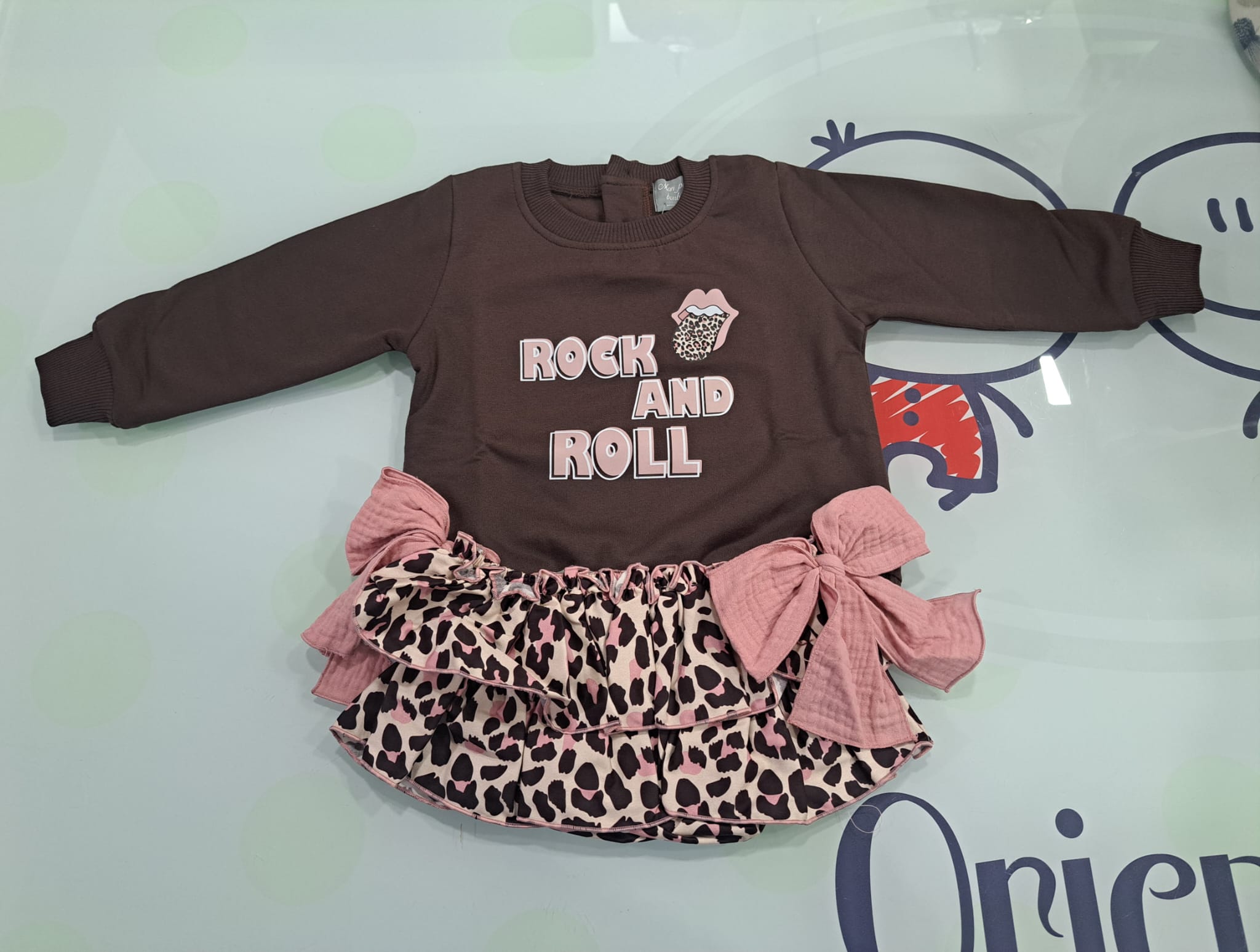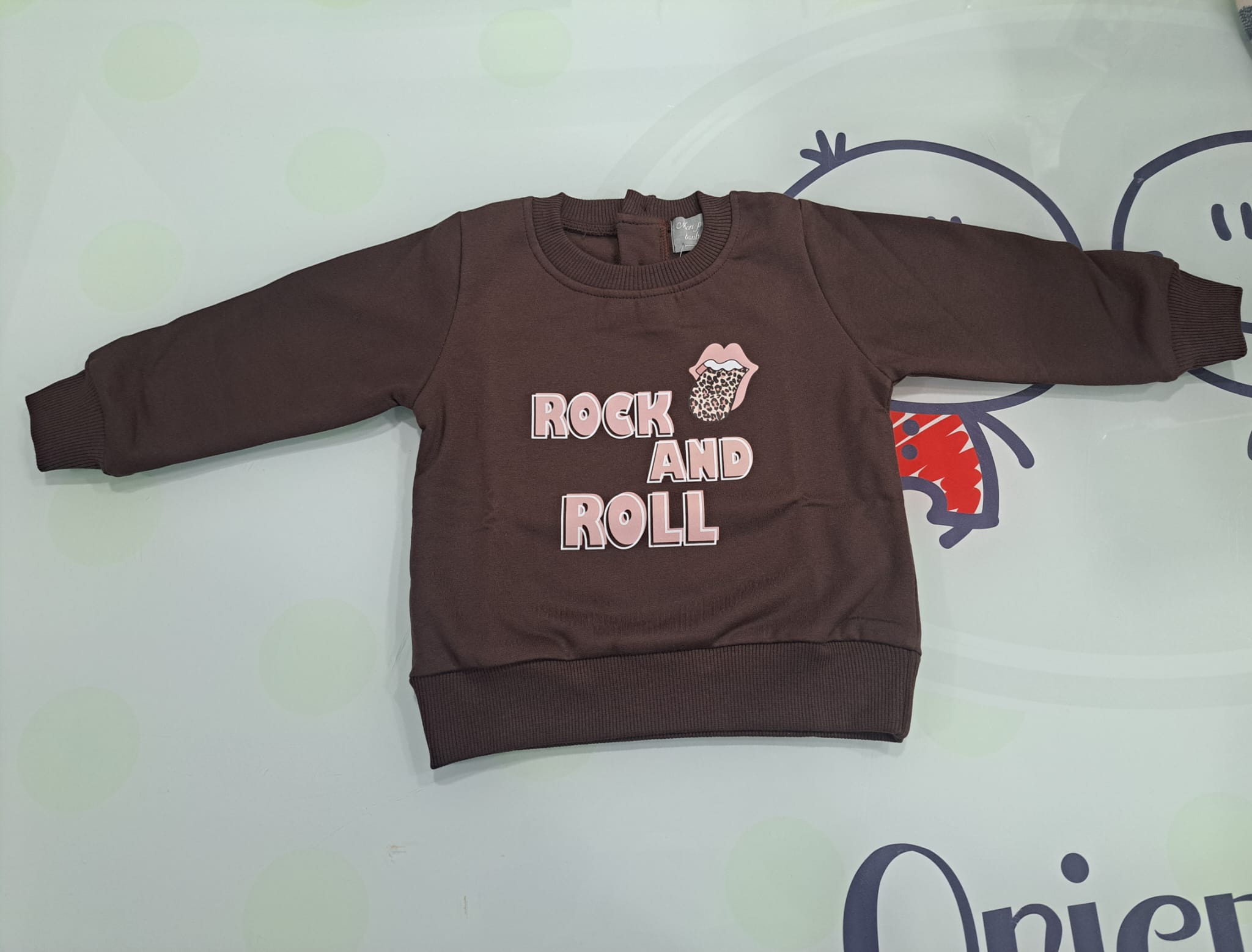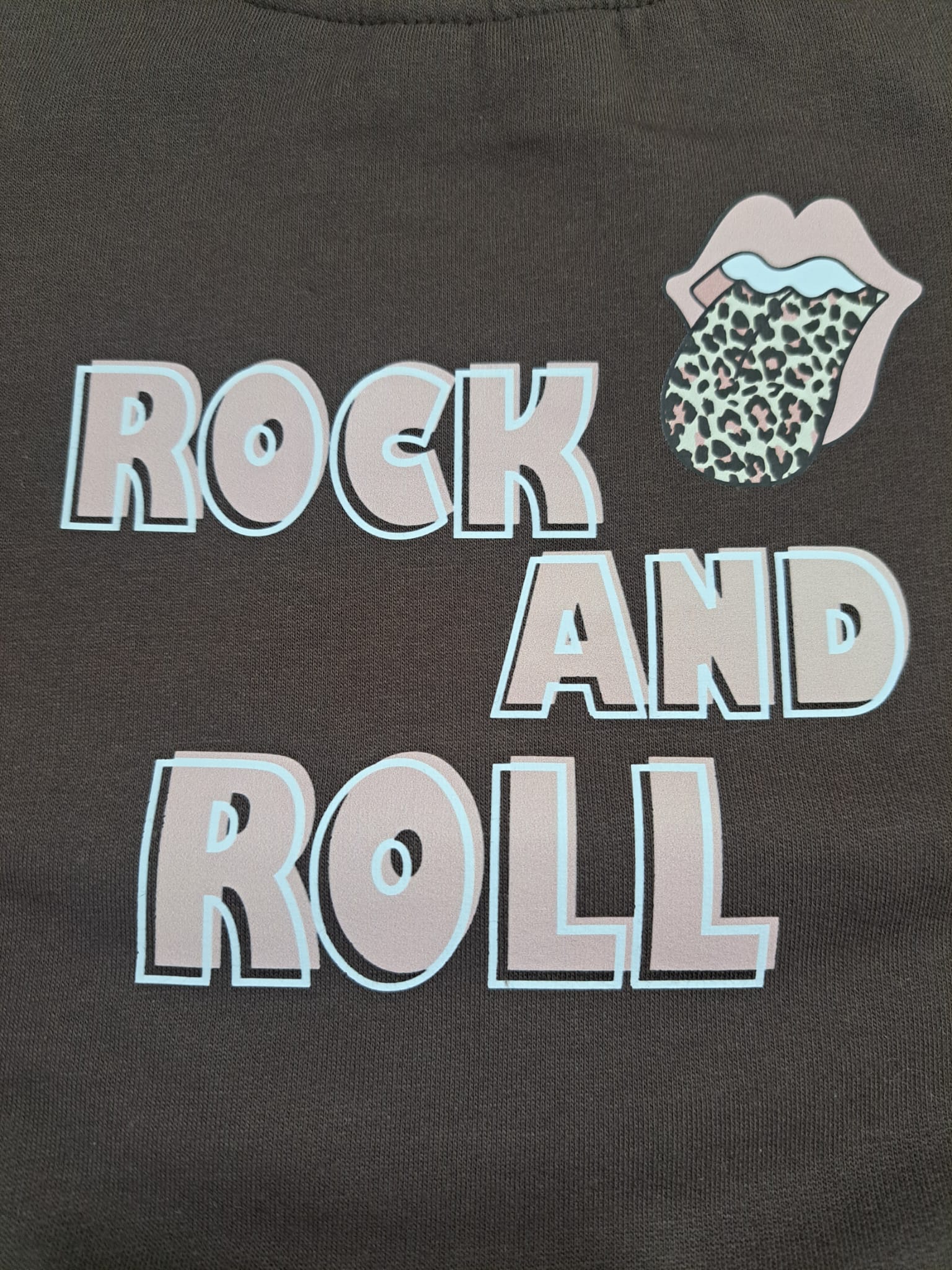 Sudadera en color marrón chocolate. Ilustración central  con frase «Rock and Roll»  y labios rosas a lo modo «Rolling Stones» con lengua animal print. Forro interior en un afelpado suave y elástico en el bajo y en los puños. Esta sudadera, es ideal para combinar con la falda, short o braga falda de la colección.