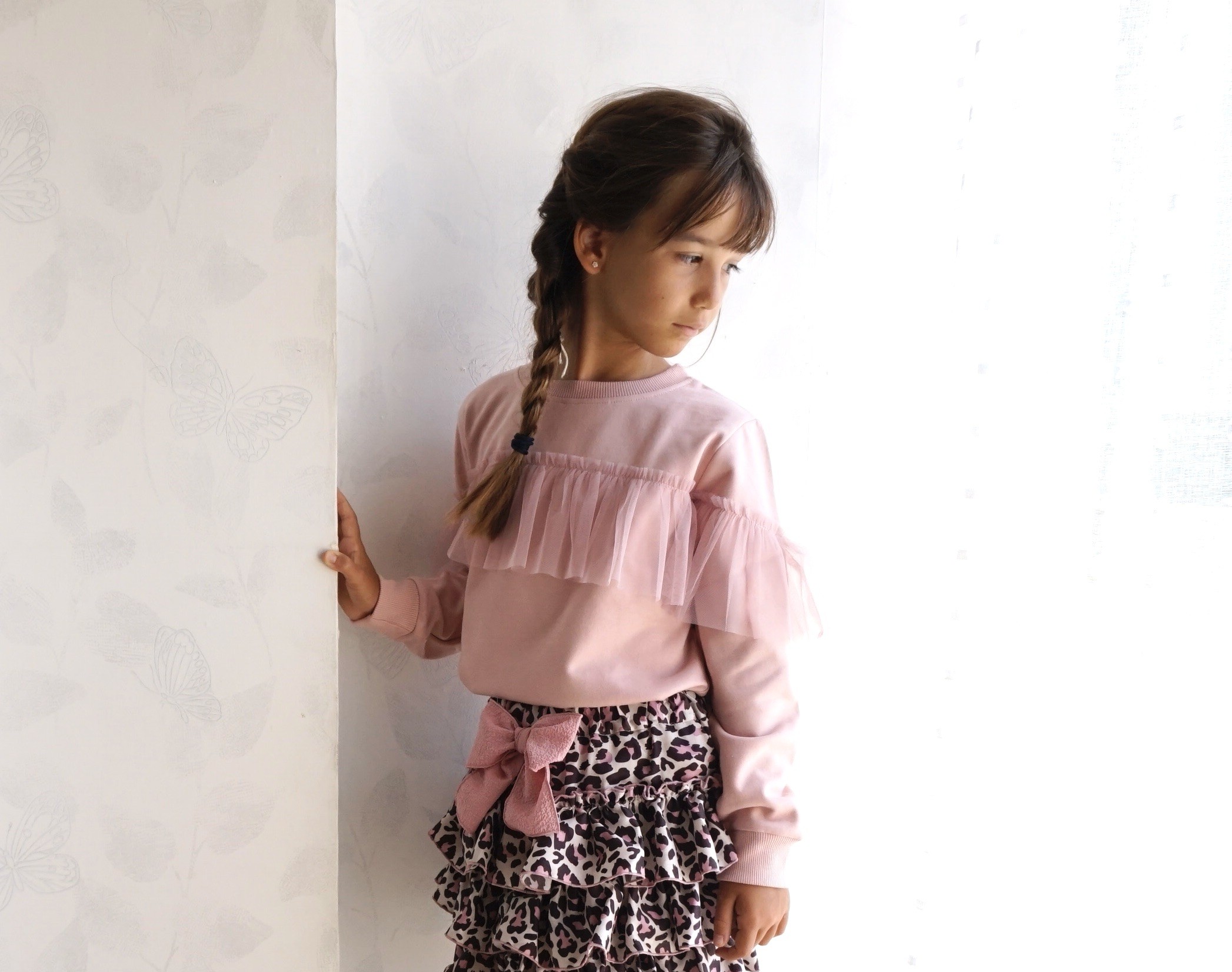 Sudadera en color rosa con flecos de tul. Forro interior afelpado, puño y cintura con elástico. Esta sudadera, es ideal para combinar con la falda, short o braga falda animal print de la colección.