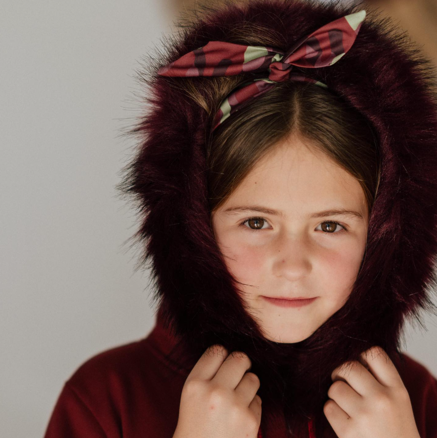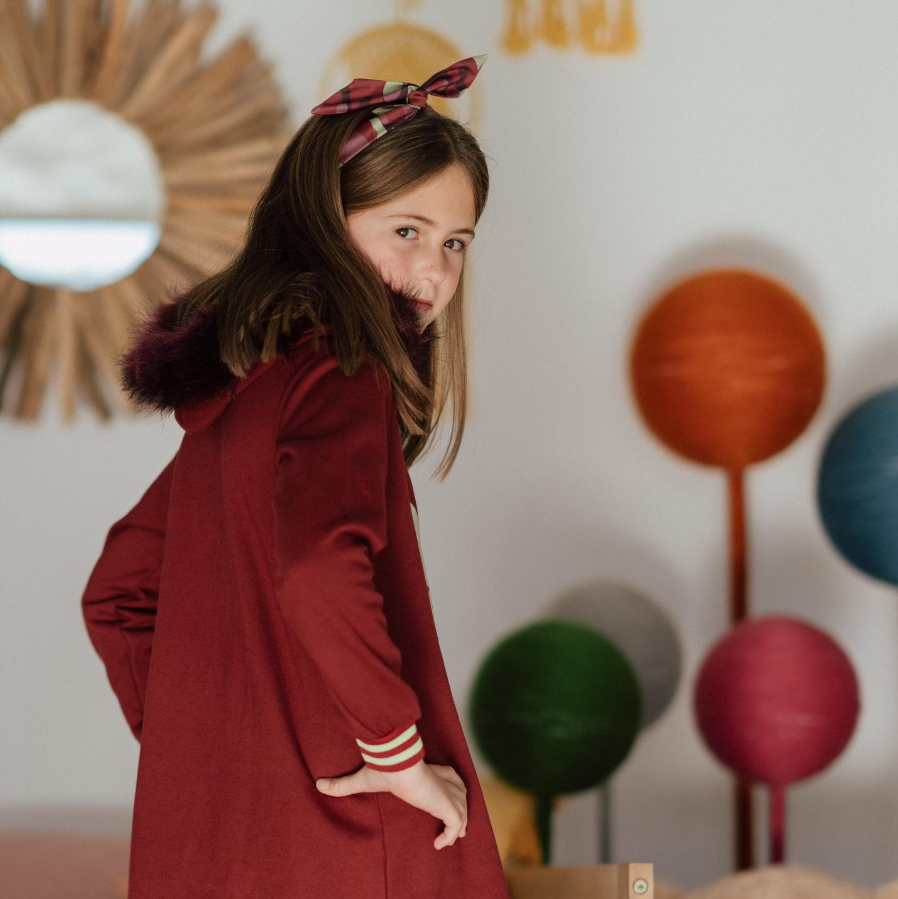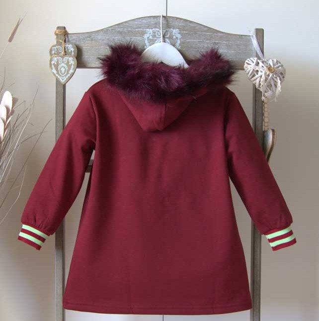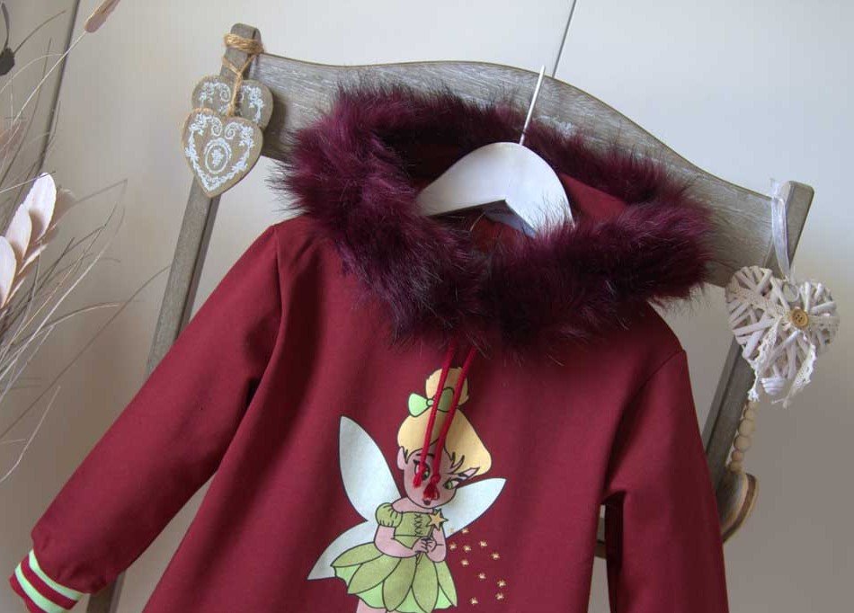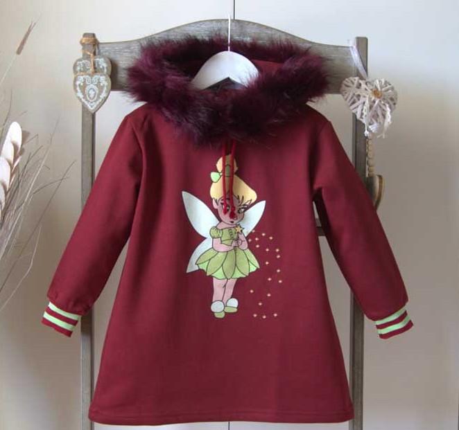 Vestido con capucha color burdeos, corte evasé, ilustración central de campanilla en color verde. Puño con banda elástica con rayas burdeos y verde, capucha ribeteada de pelo en tono burdeos y forro interior afelpado.