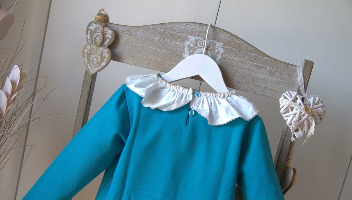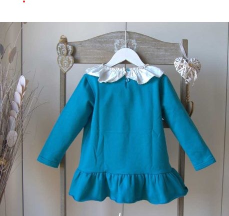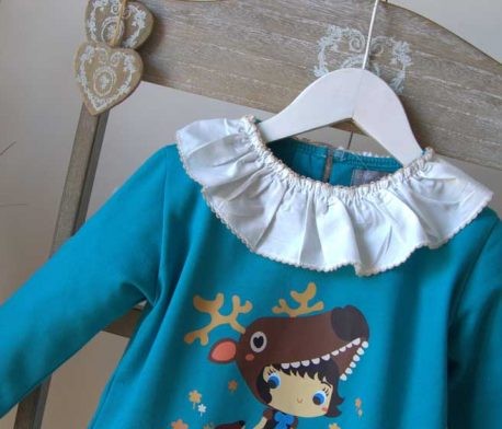 Vestido en color turquesa, de corte evasé con bajos de volantes, ilustración central de niña ciervo, cuello de volantes en color blanco. Abertura por detrás del cuello con botón y forro interior de felpa.