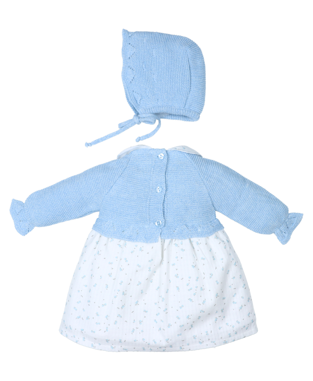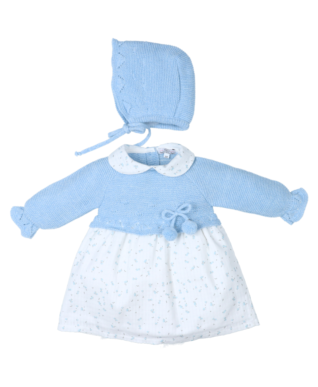 Conjunto 2 piezas. Vestido de punto y tela en color azul bebé y blanco y estampado de flores. Capota de punto con bordado en color azul bebé.