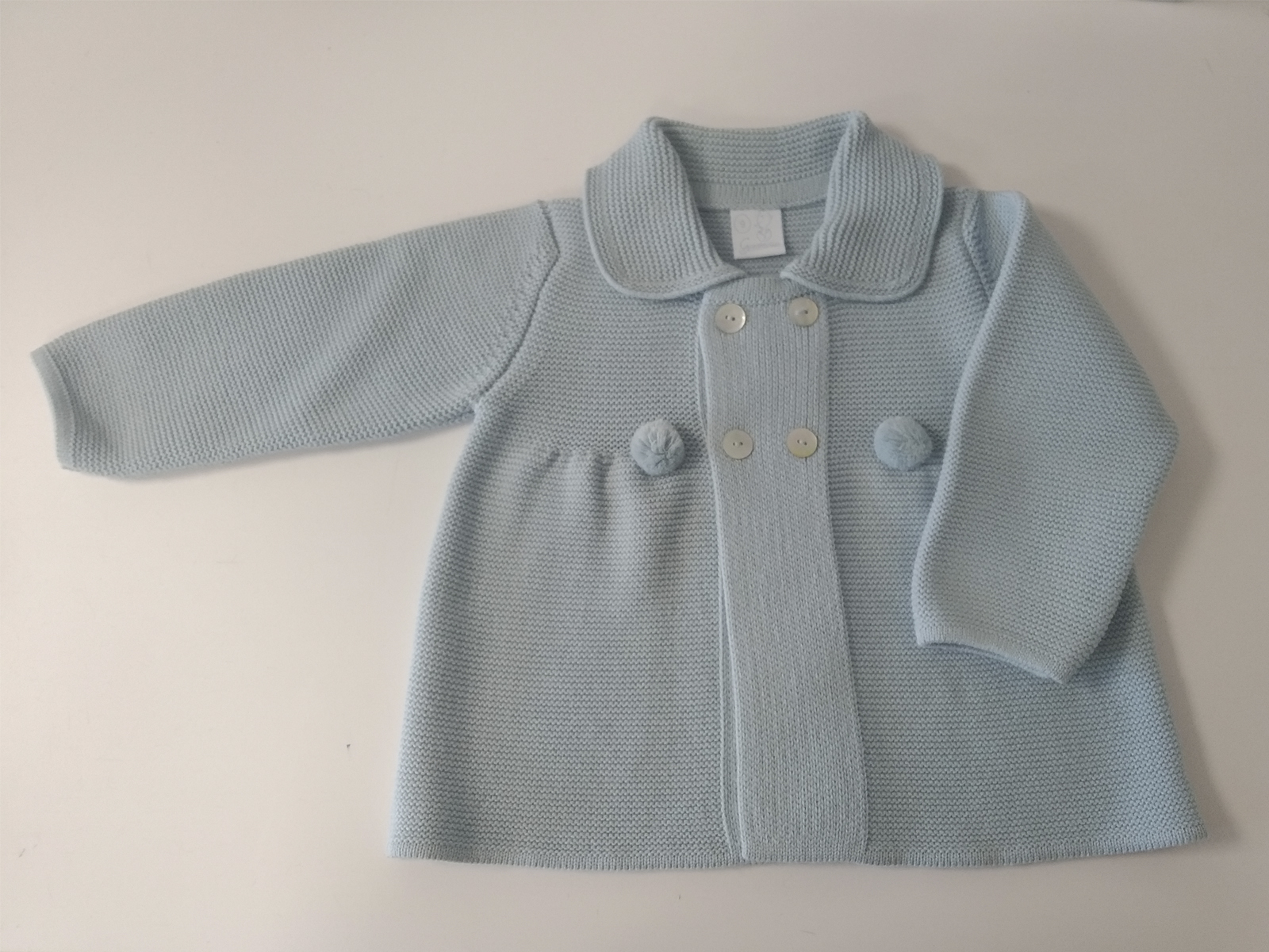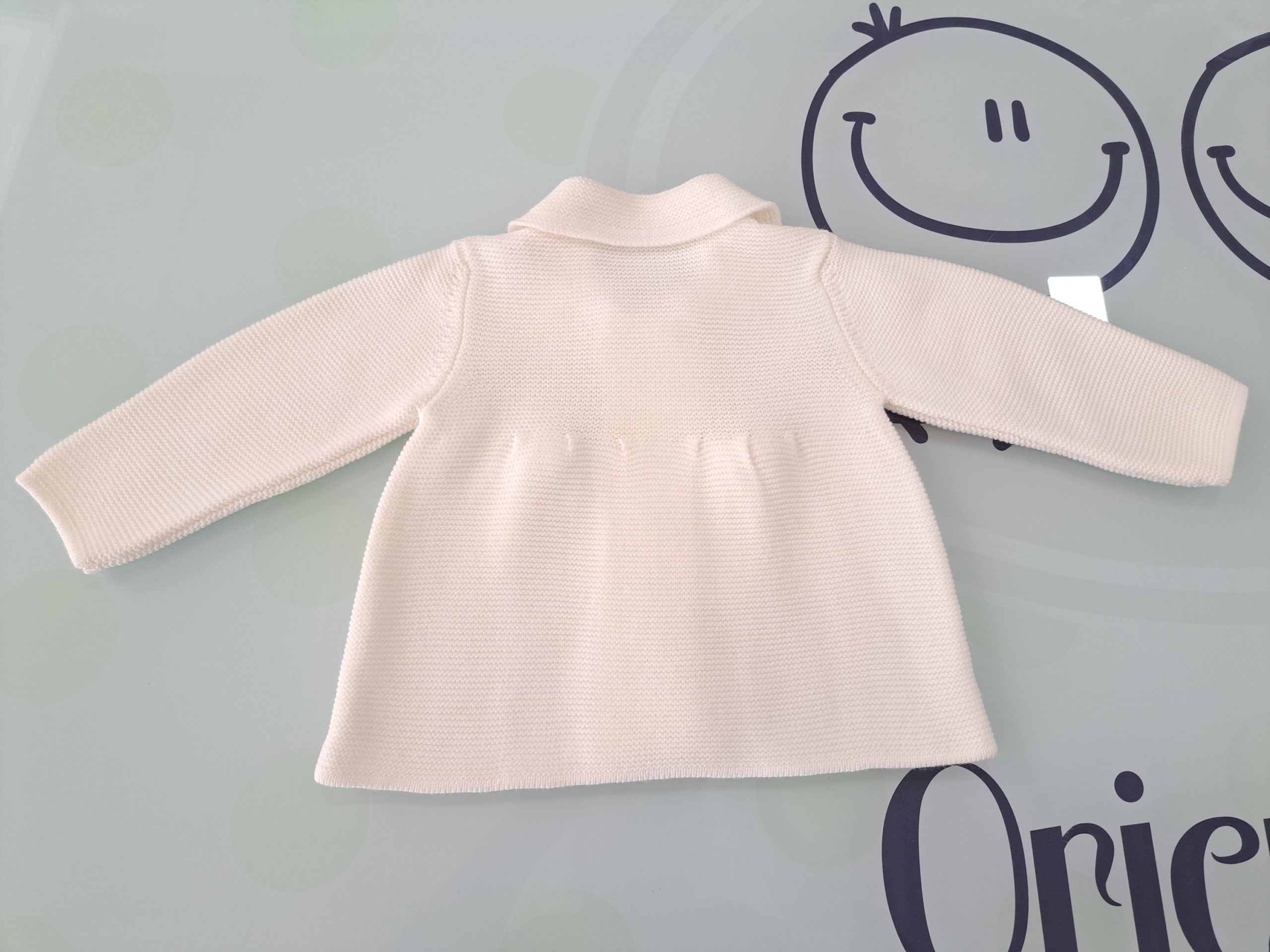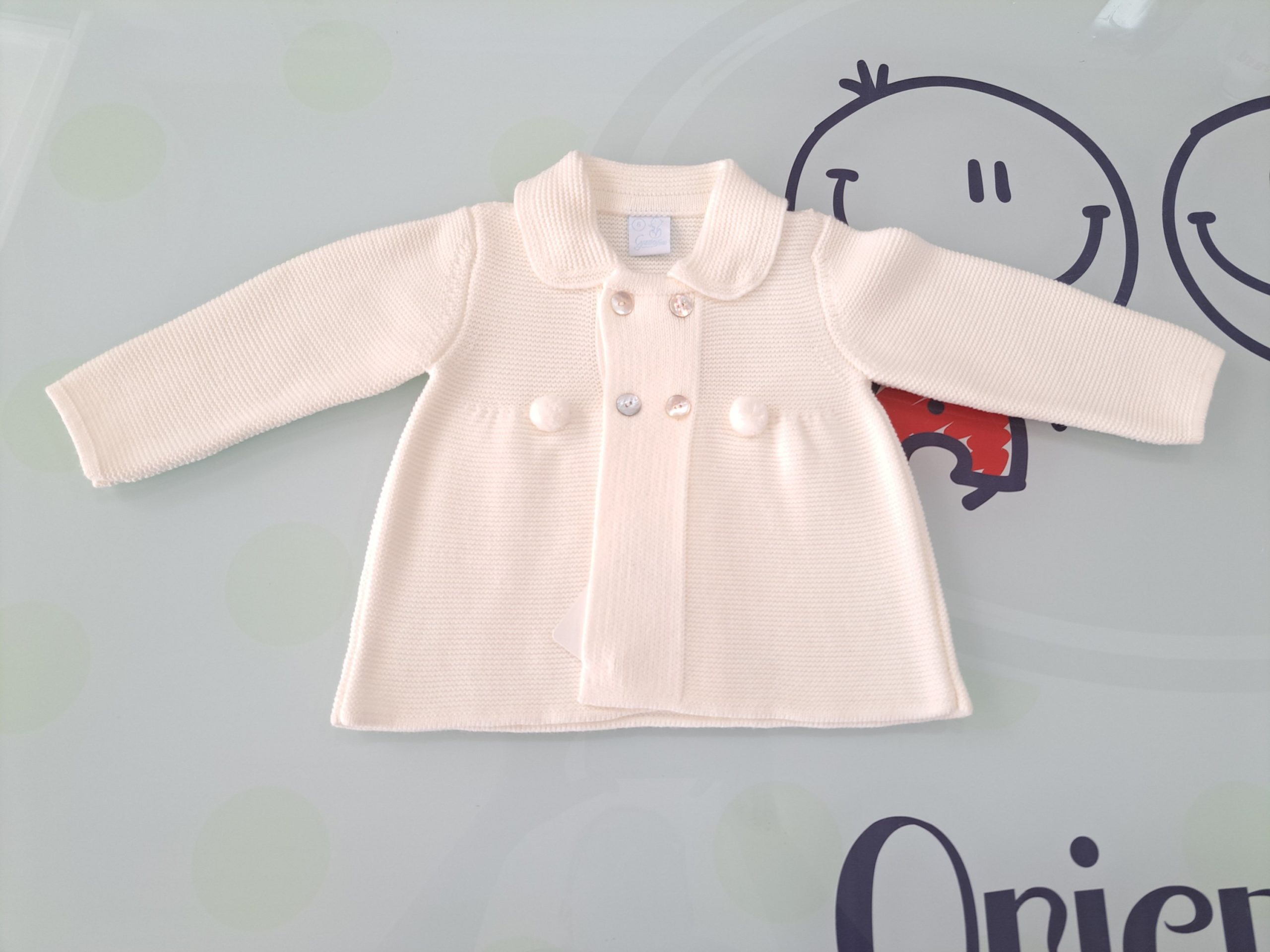 Abrigo de punto color blanco con pompones. cuello peter pan y abertura por delante con cuatro botones de nácar.