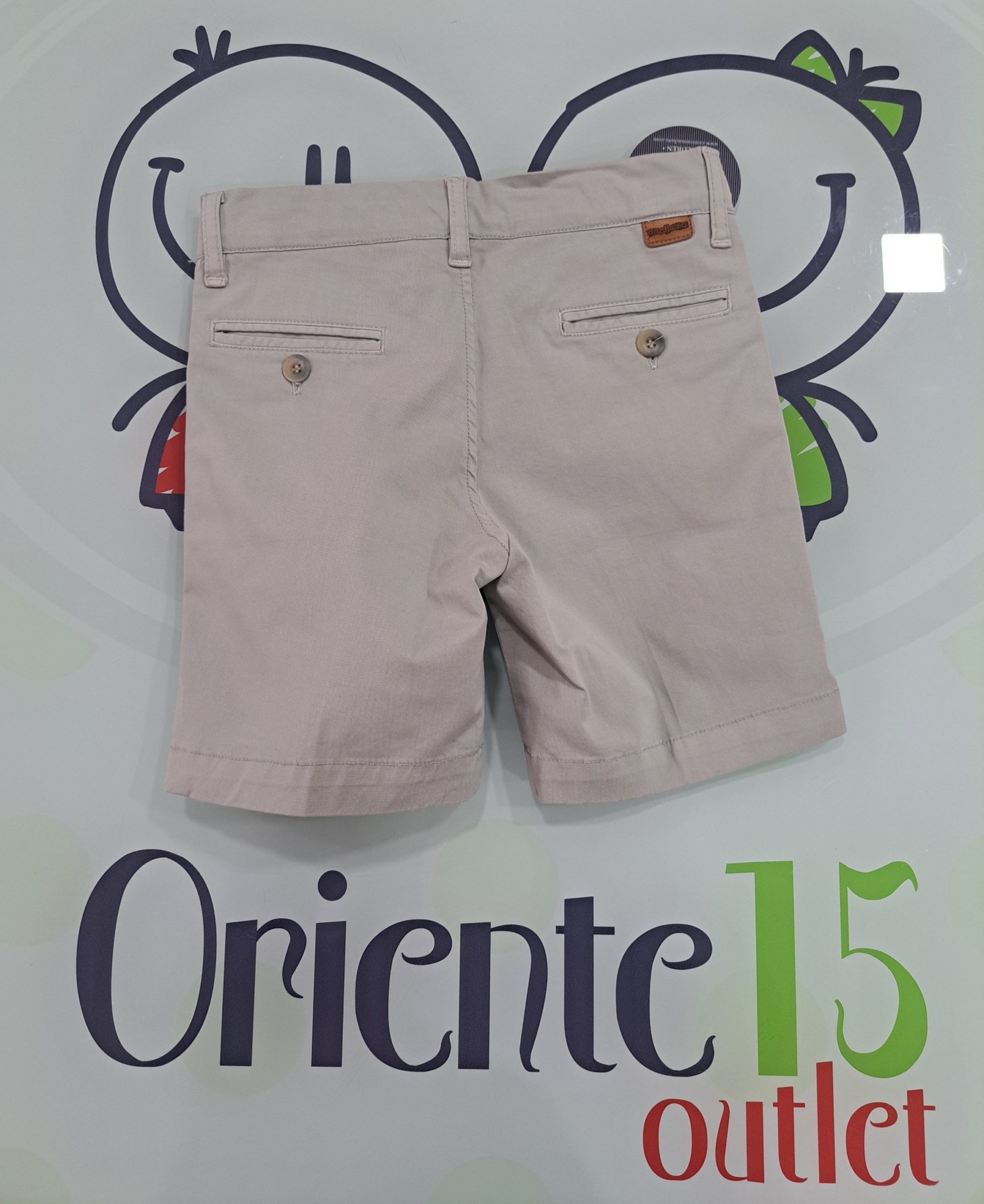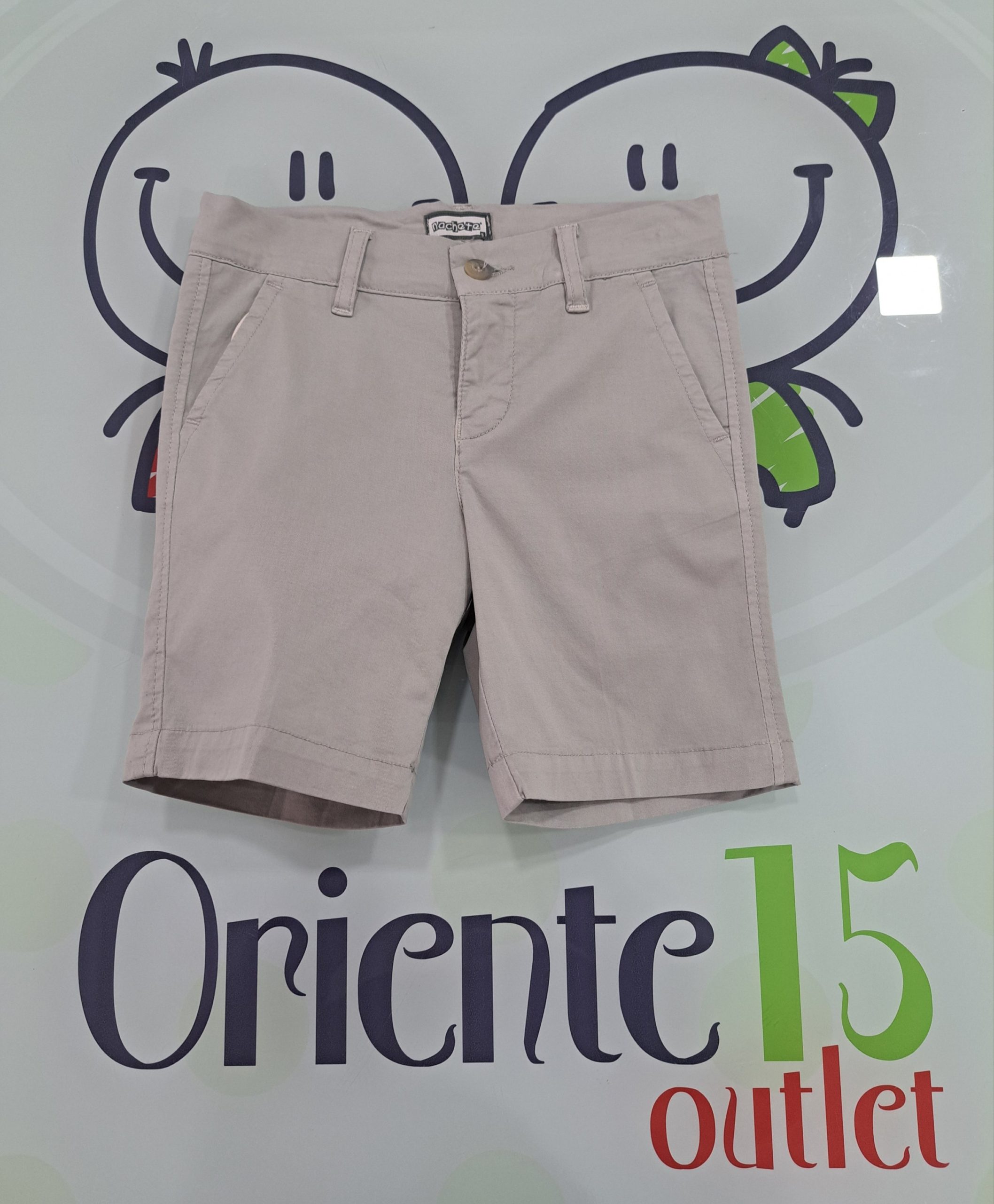 Bermuda color gris, bolsillos laterales y traseros, abertura con botón y cremallera.