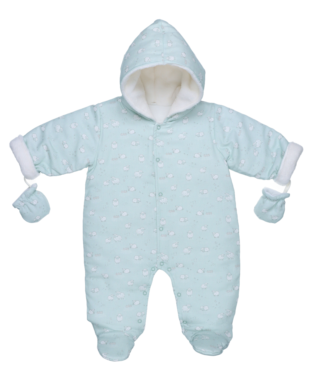 Buzo en color verde agua, con estampado de ovejitas y lunas en tonos blanco. Abertura delantera con corchetes. Con capucha y manoplas.