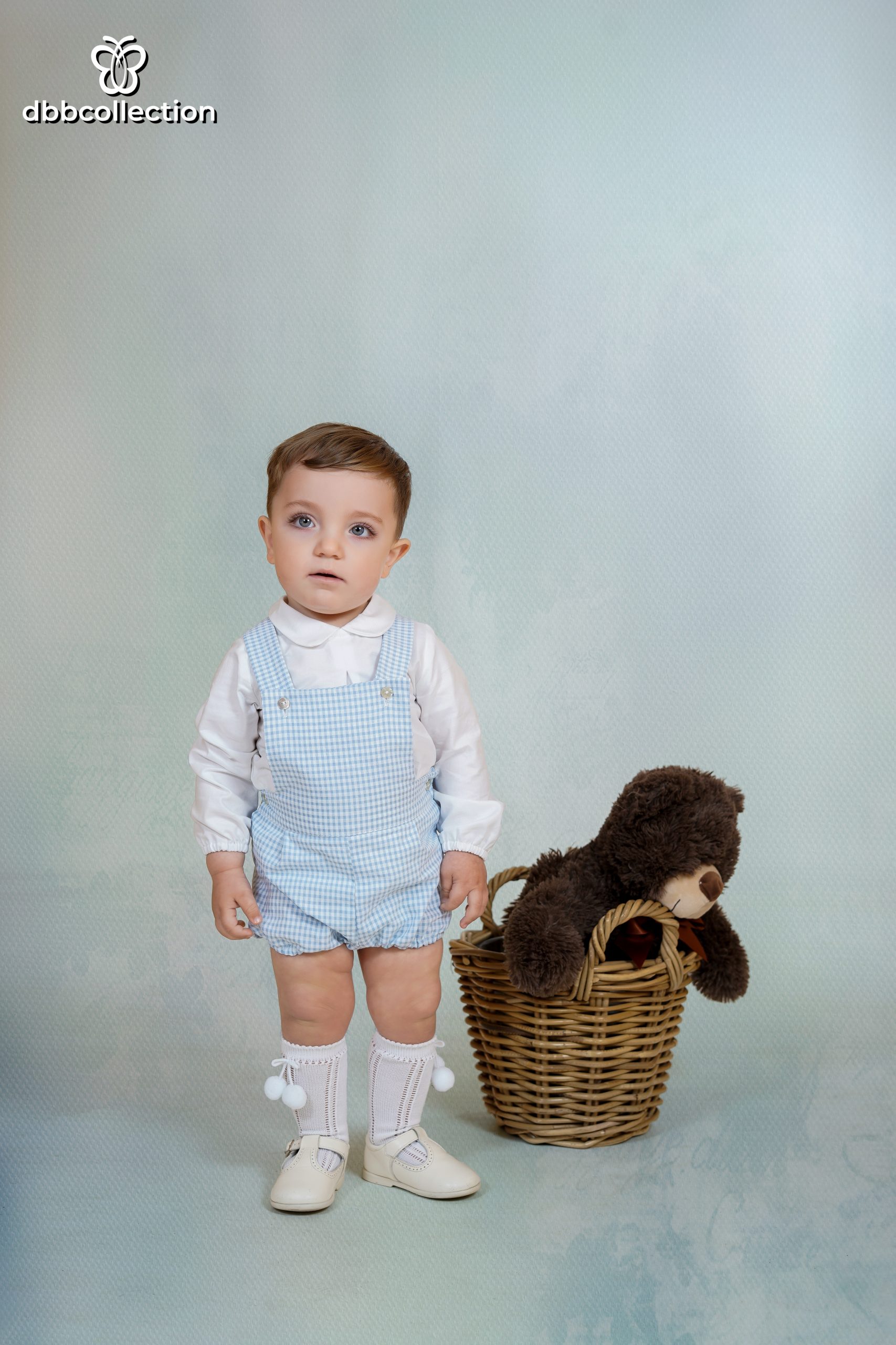 Conjunto formado por camisa color blanco, cuello bebe, elástico en mangas y abertura en espalda con botones de nácar. Peto color celeste en estampado vichy con tirantes cruzados en espalda y elástico en piernas.
