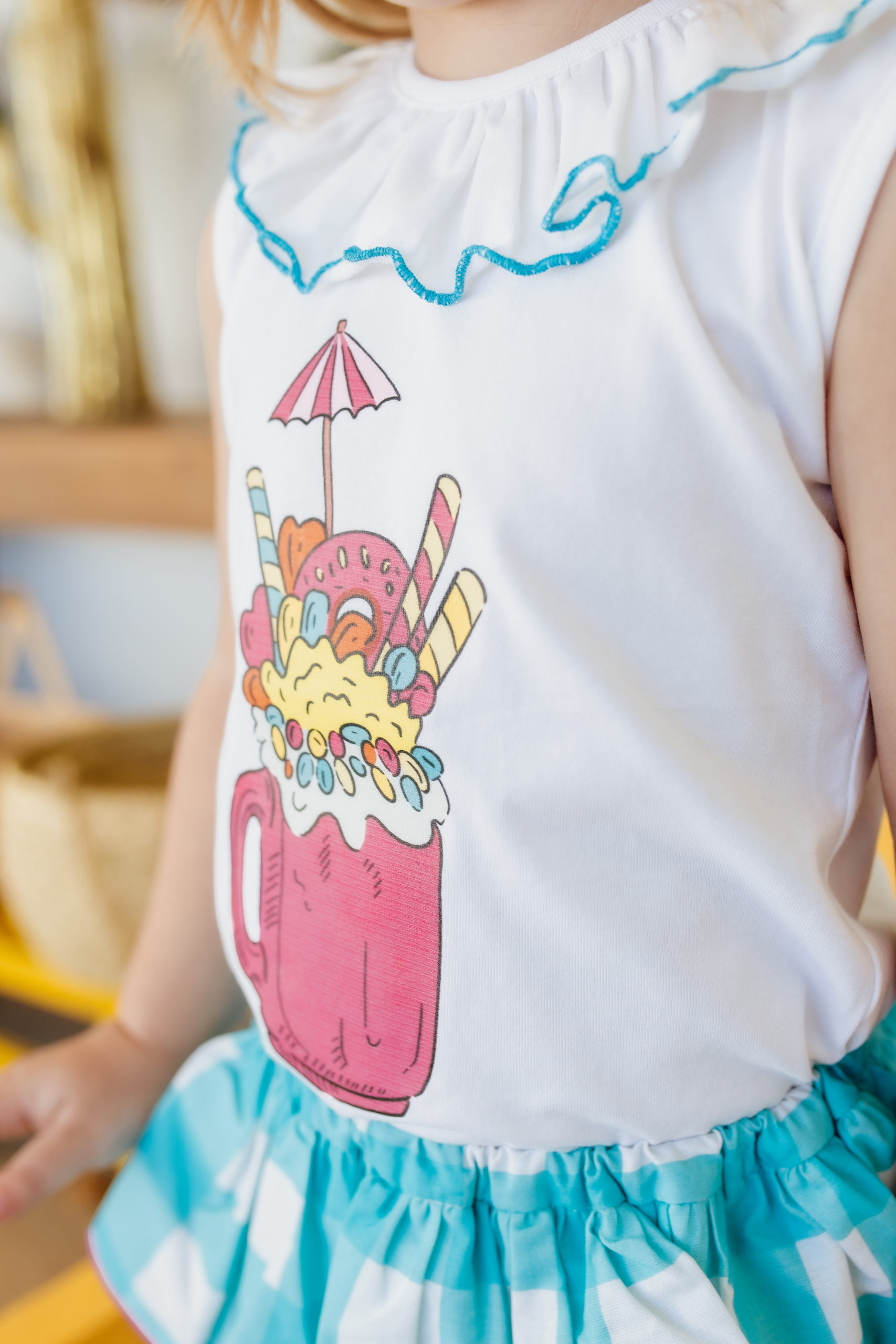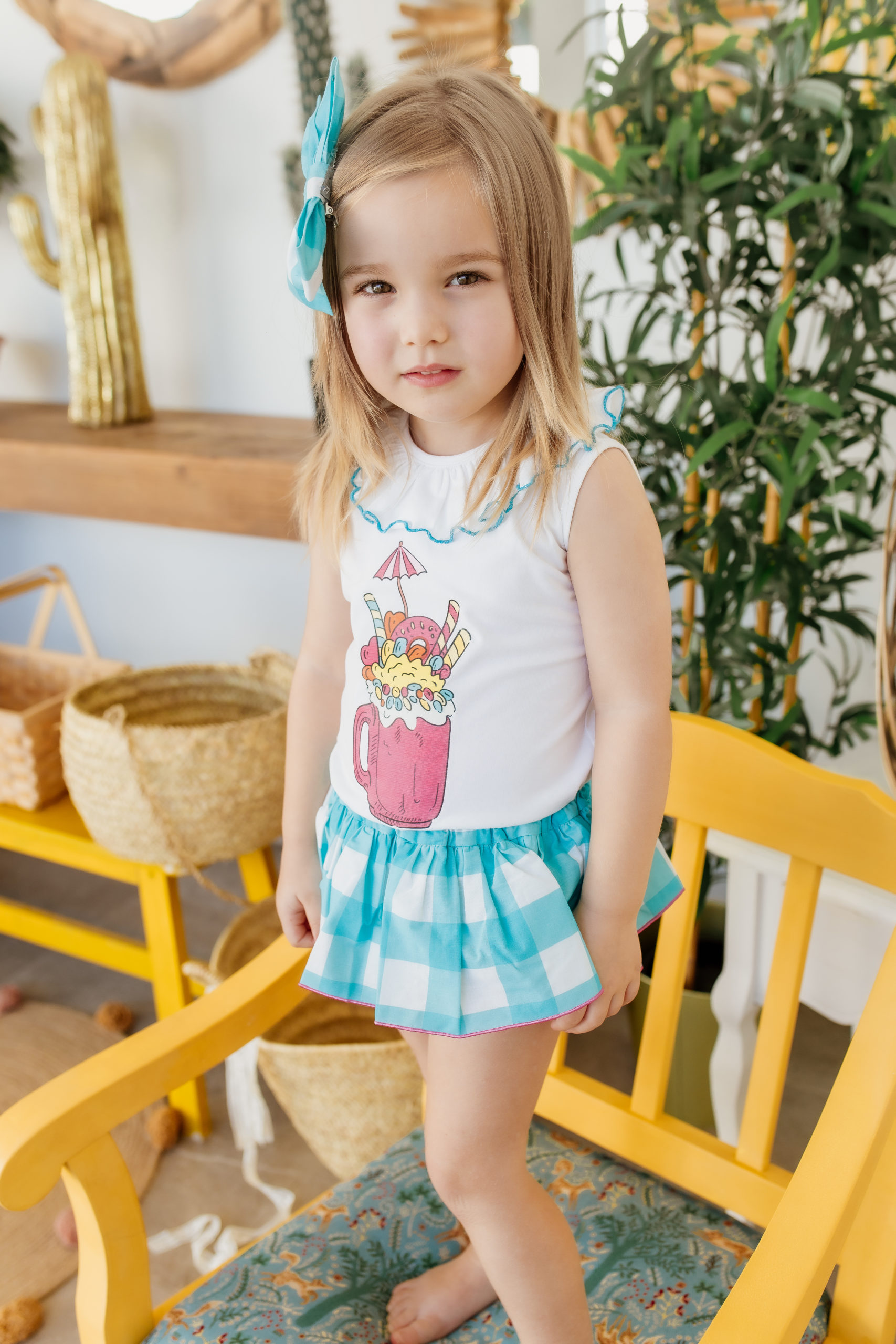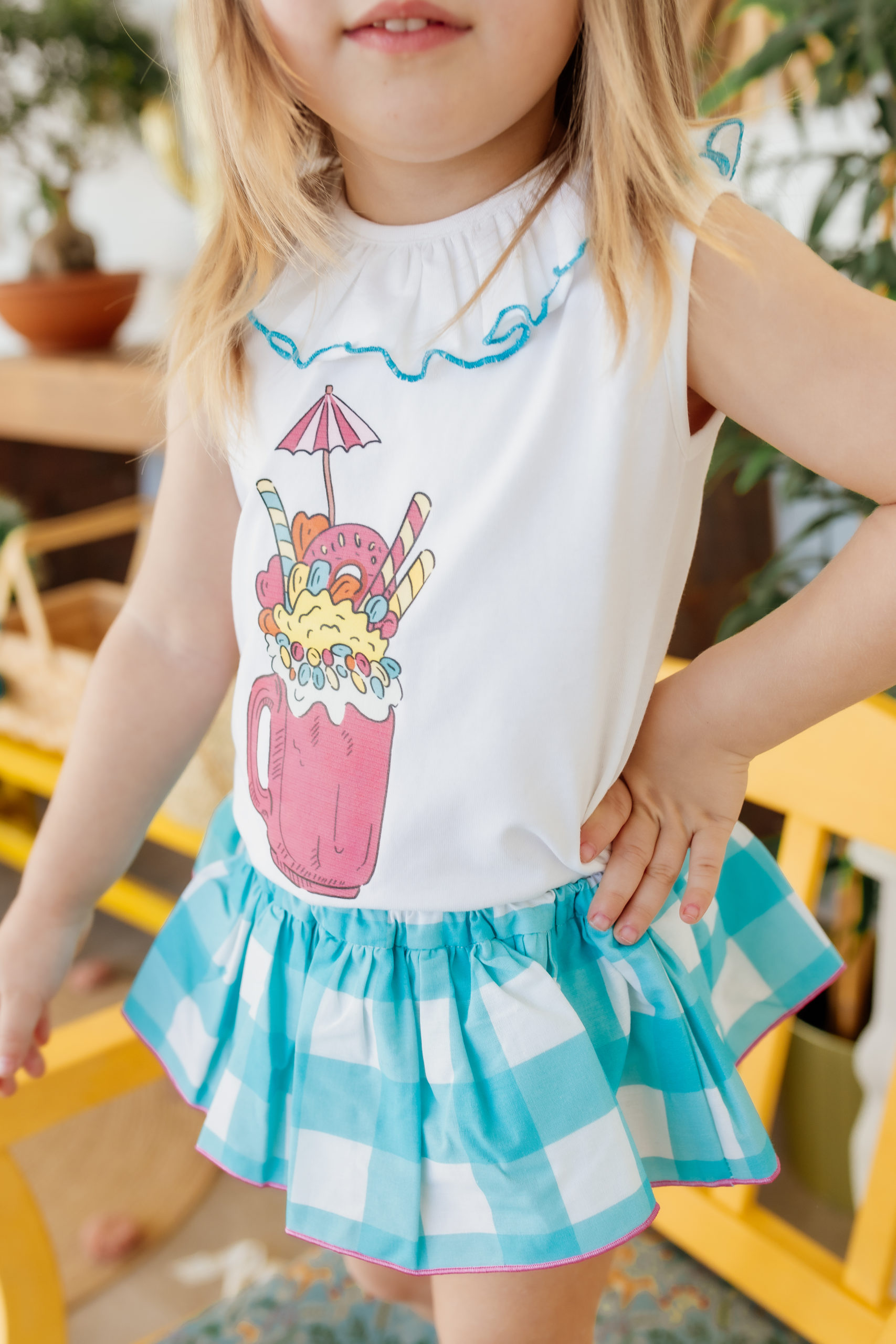 Conjunto formado por camiseta de tirantes color blanco, cuello de volantes ribeteado en color turquesa e ilustración central de un batido color fucsia y abertura detrás del cuello con tres botones color blanco + braga falda de cuadros color blanco y turquesa, cintura elástica y lazo en espalda color fucsia