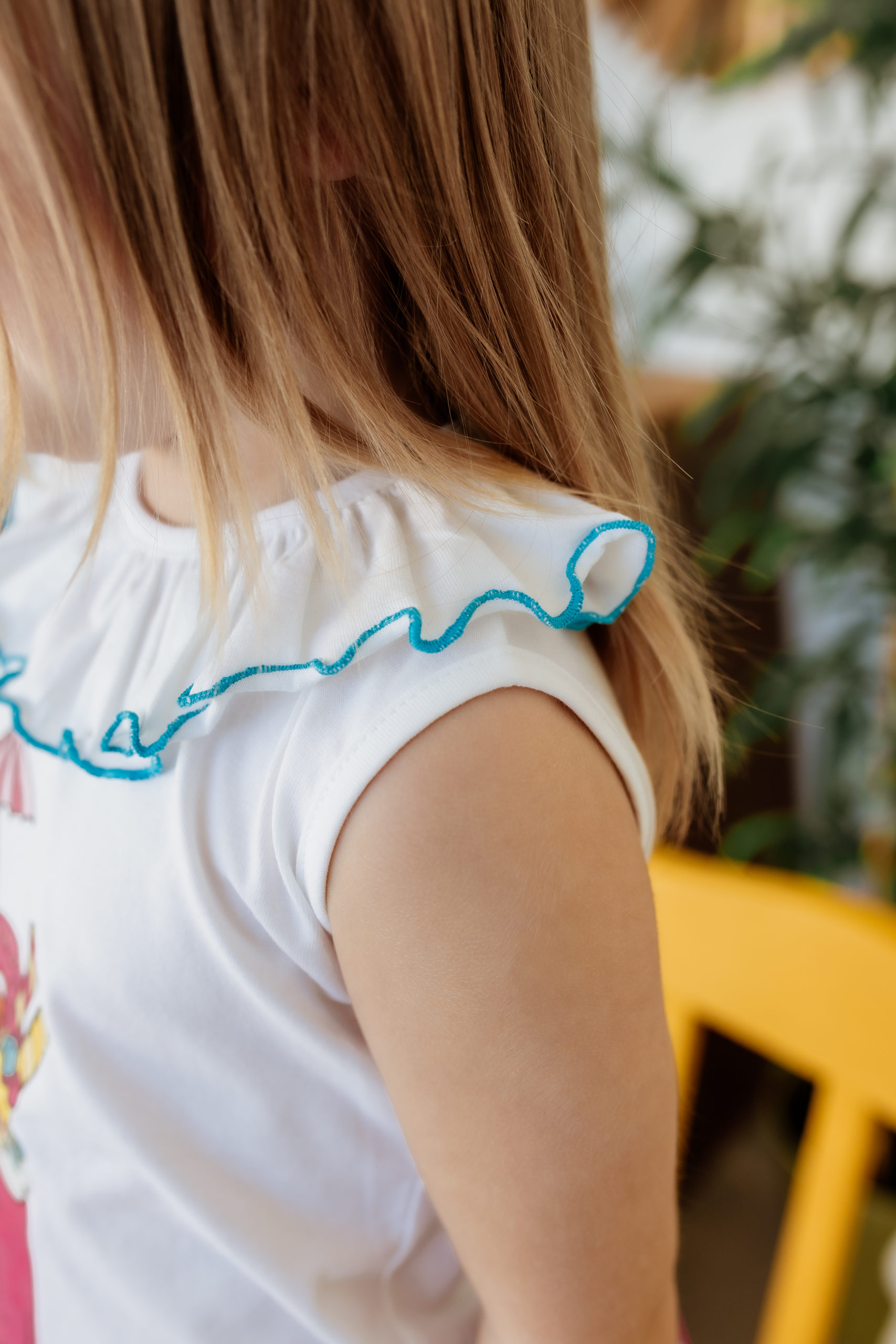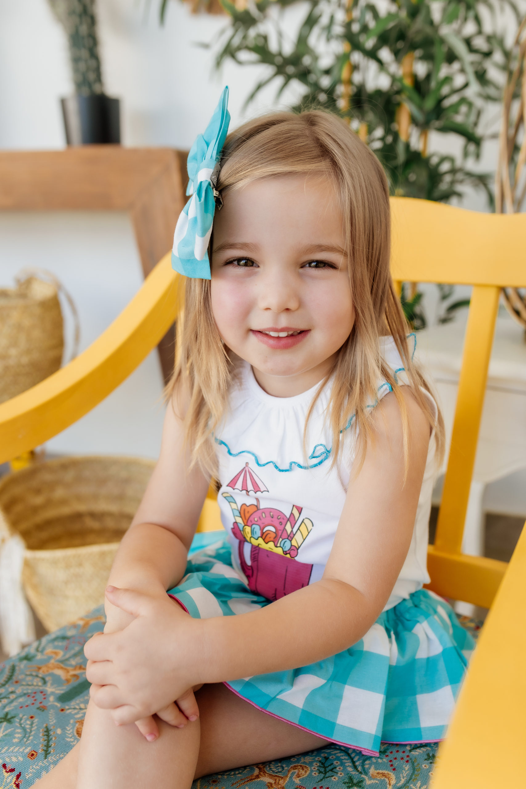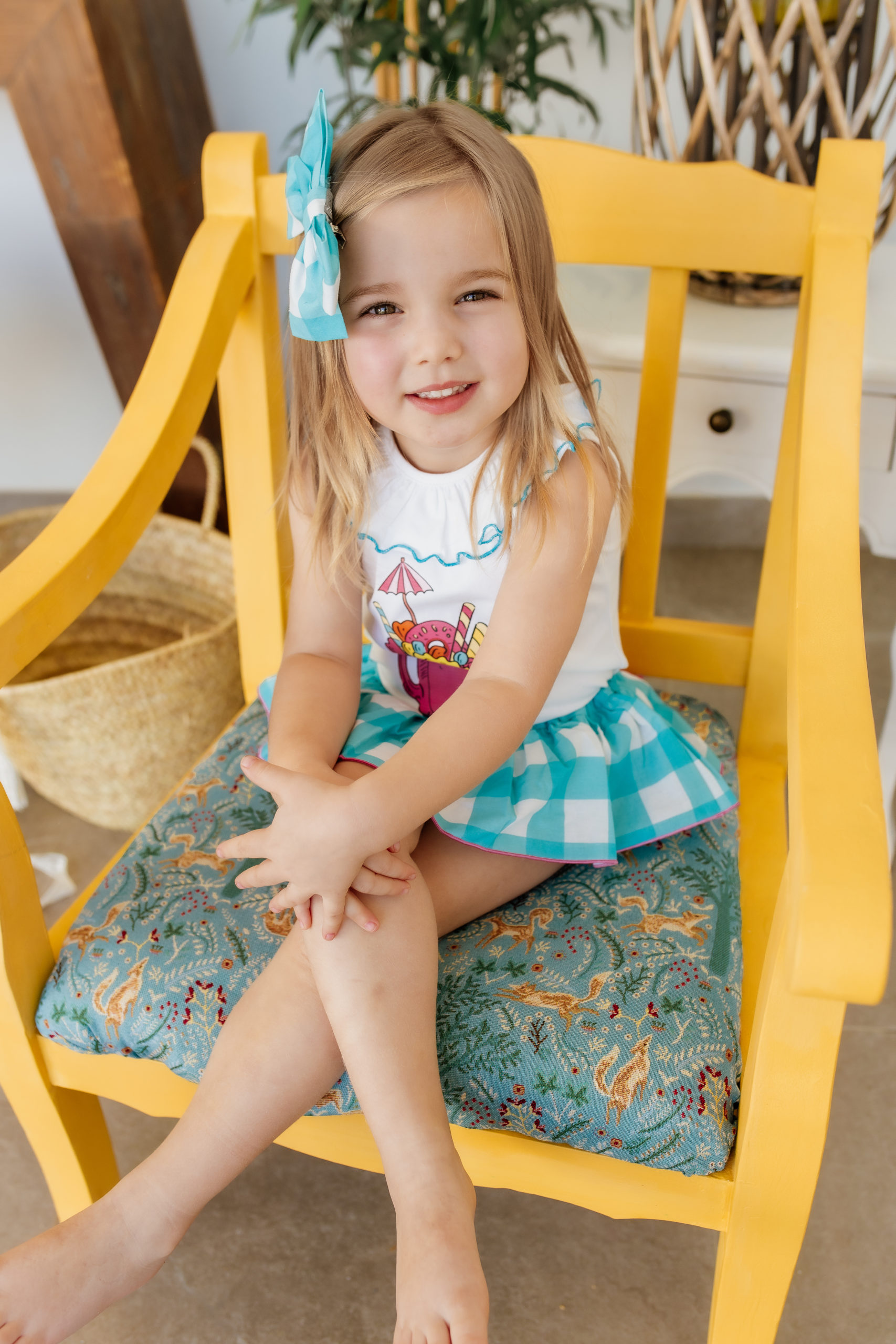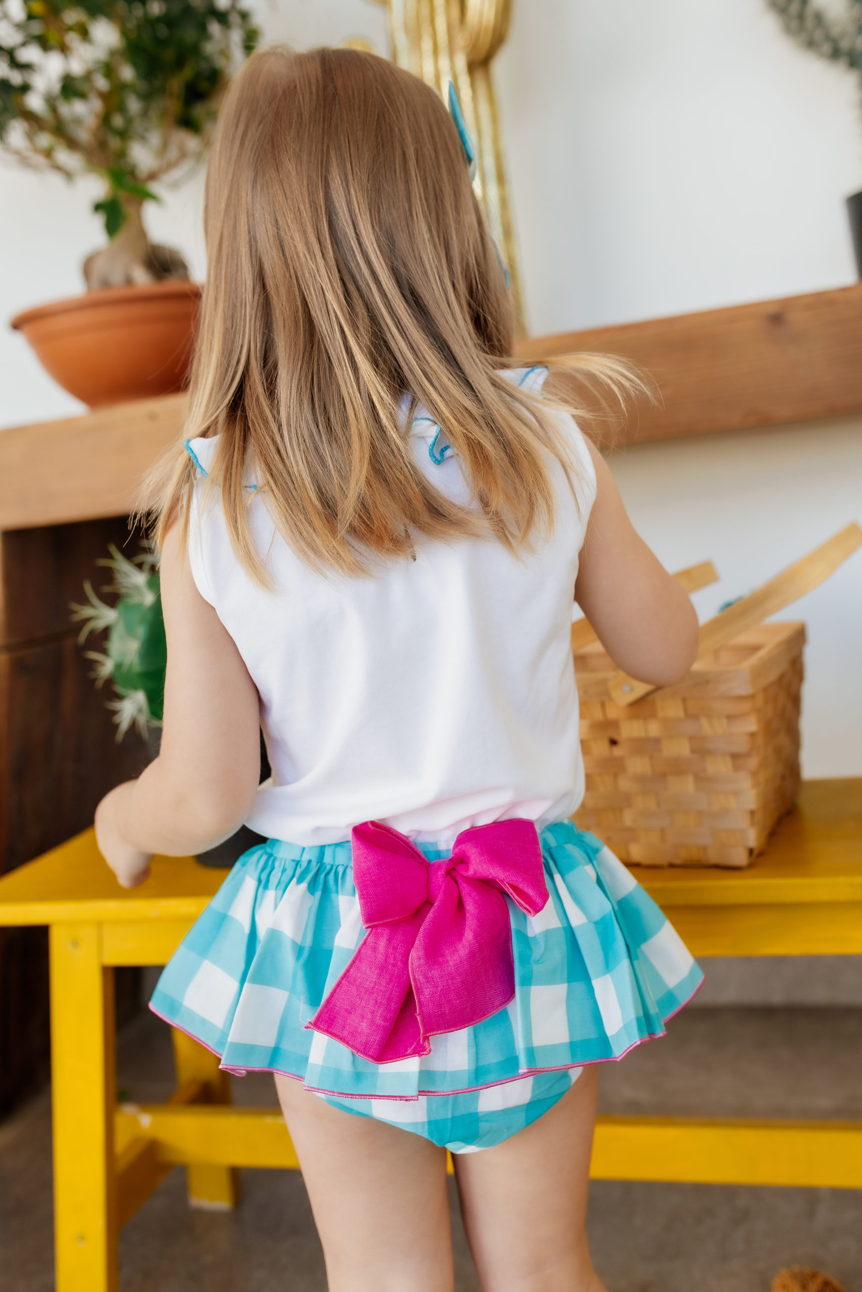 Conjunto formado por camiseta de tirantes color blanco, cuello de volantes ribeteado en color turquesa e ilustración central de un batido color fucsia y abertura detrás del cuello con tres botones color blanco + braga falda de cuadros color blanco y turquesa, cintura elástica y lazo en espalda color fucsia
