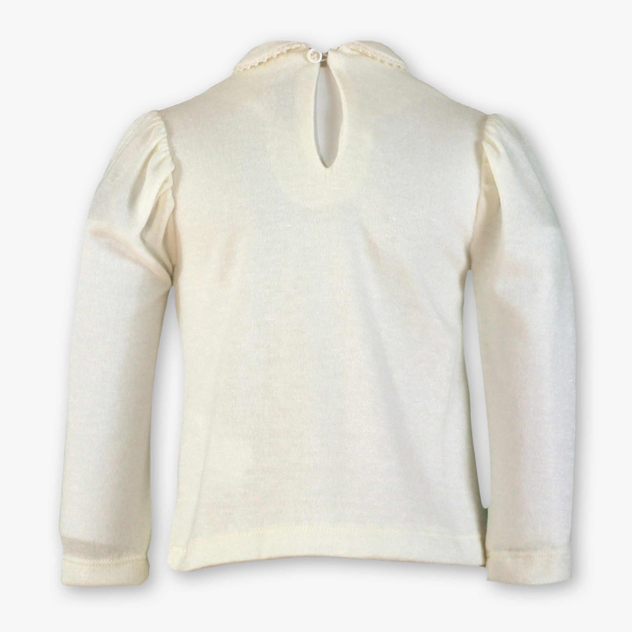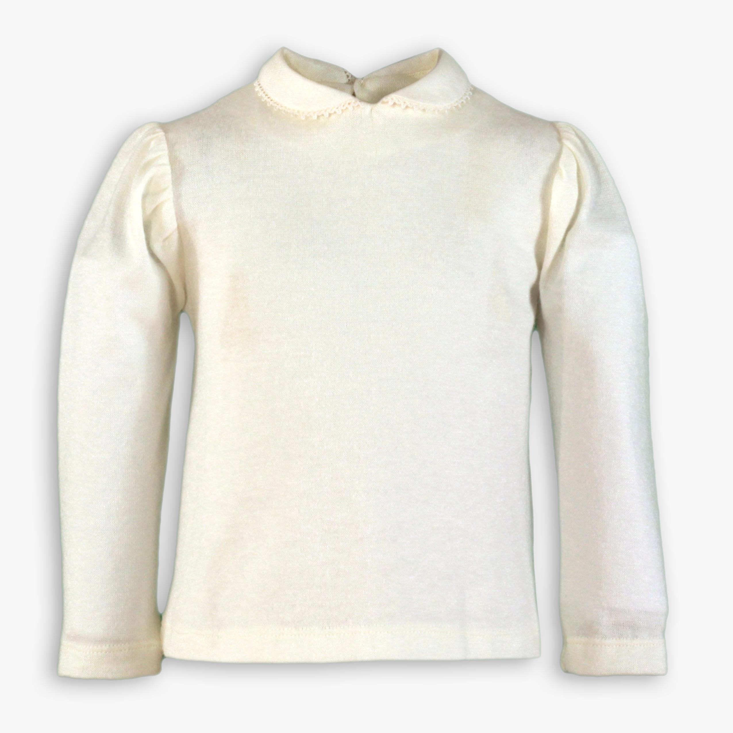 Camiseta larga en color blanco hueso, con cuello bebé. Abertura trasera por un botón.