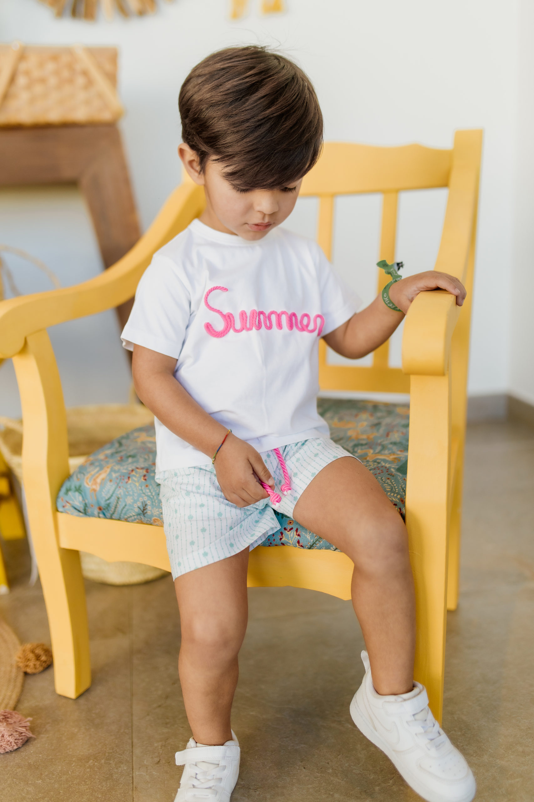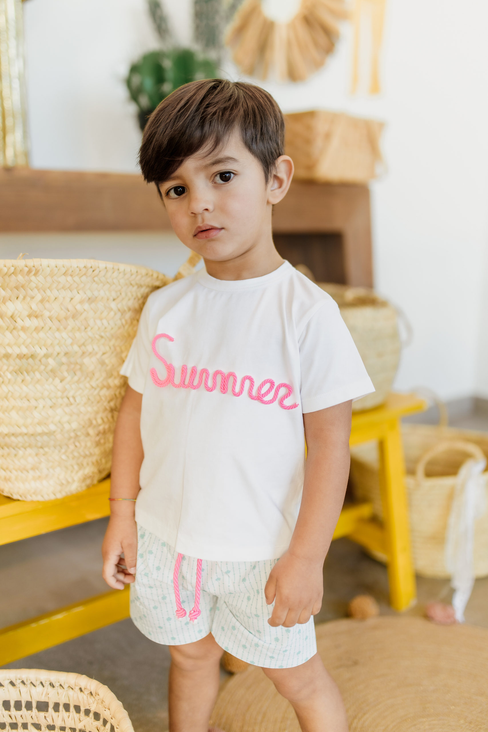 Conjunto formado por camiseta color blanco con letras en cordón en color rosa con la palabra summer y abertura en espalda conbotones + short color blanco con detalles de hojas en color verde y cordón color rosa. 100% algodón.