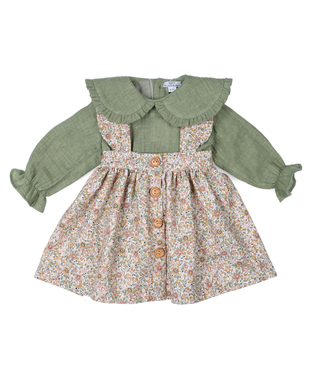 Conjunto 2 piezas. Camisa color verde, cuello bebe, elástico en mangas y abertura en espalda con botones. Pichi color blanco en estampado de flores color rosa, amarillo y verde. Falsos botones delanteros en madera y tirantes cruzados en espalda, ajustables para que lo puedas usar toda la temporada.