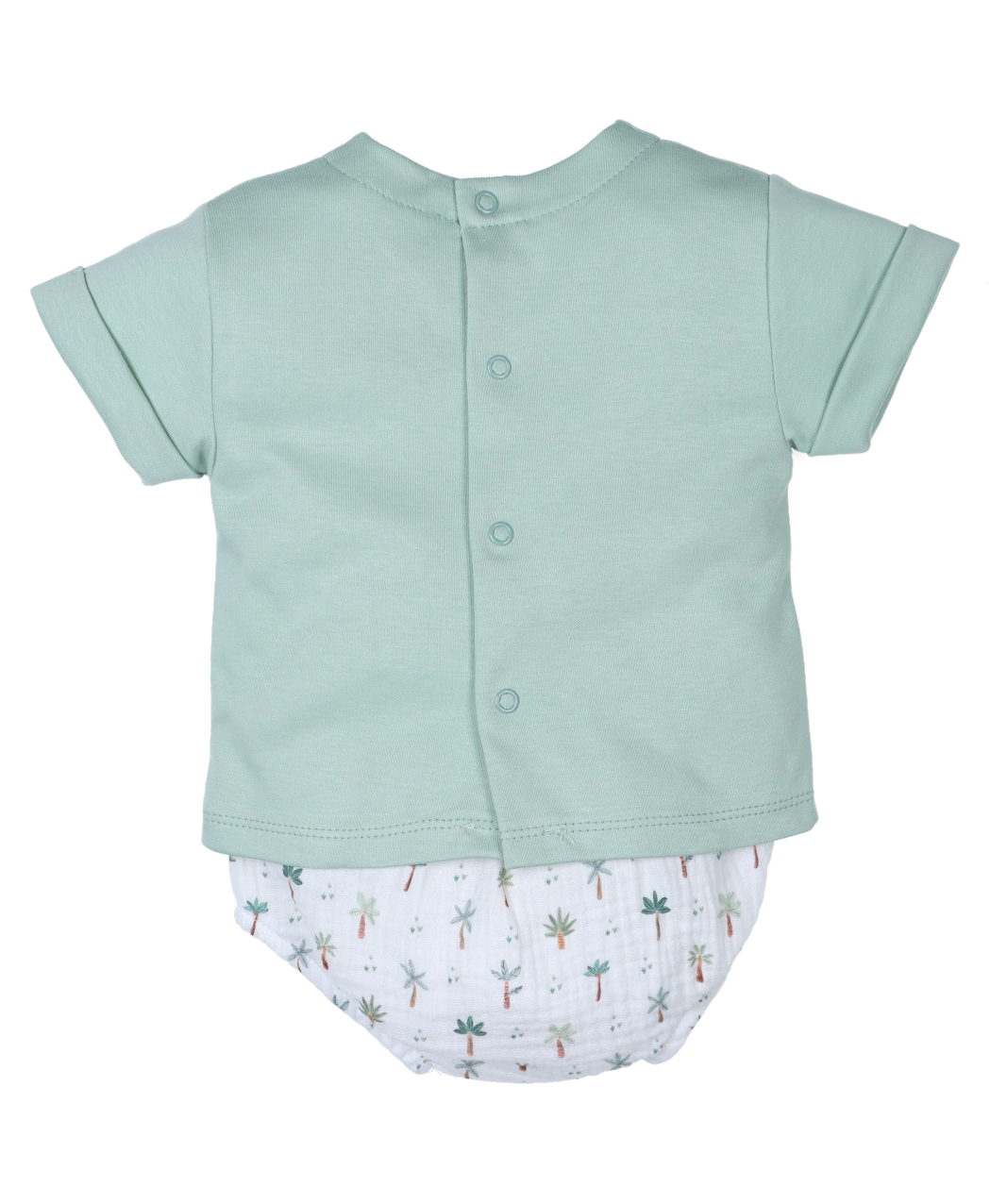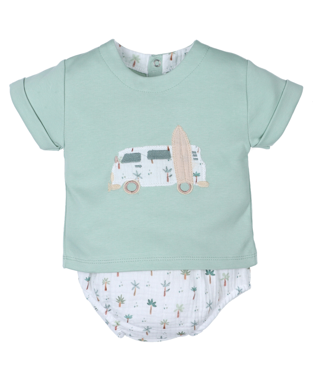 Conjunto unisex formado por camiseta 100% algodón en color verde agua, ilustración de camper, abertura en espalda con corchetes + ranita de bambula en color blanco con estampado de palmeras.