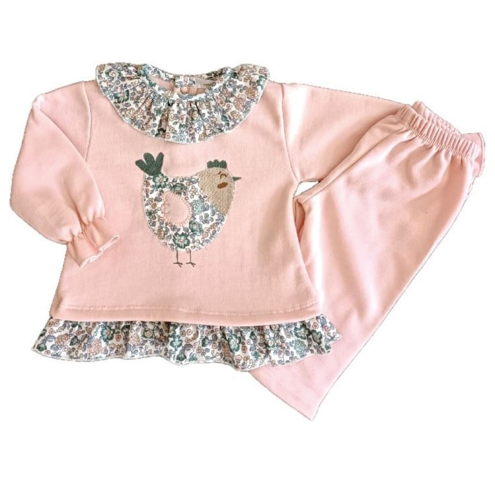 Conjunto de 2 piezas. Sudadera en color rosa empolvado con ilustración de gallina bordada, volante en el cuello y en la cintura con estampado floral en tonos rosas y verdes con forro interior de felpa. Abertura en espalda con corchetes y goma en puño. Pantalón largo con elástico en cintura y forro interior de felpa. Ideal para la guardería.
