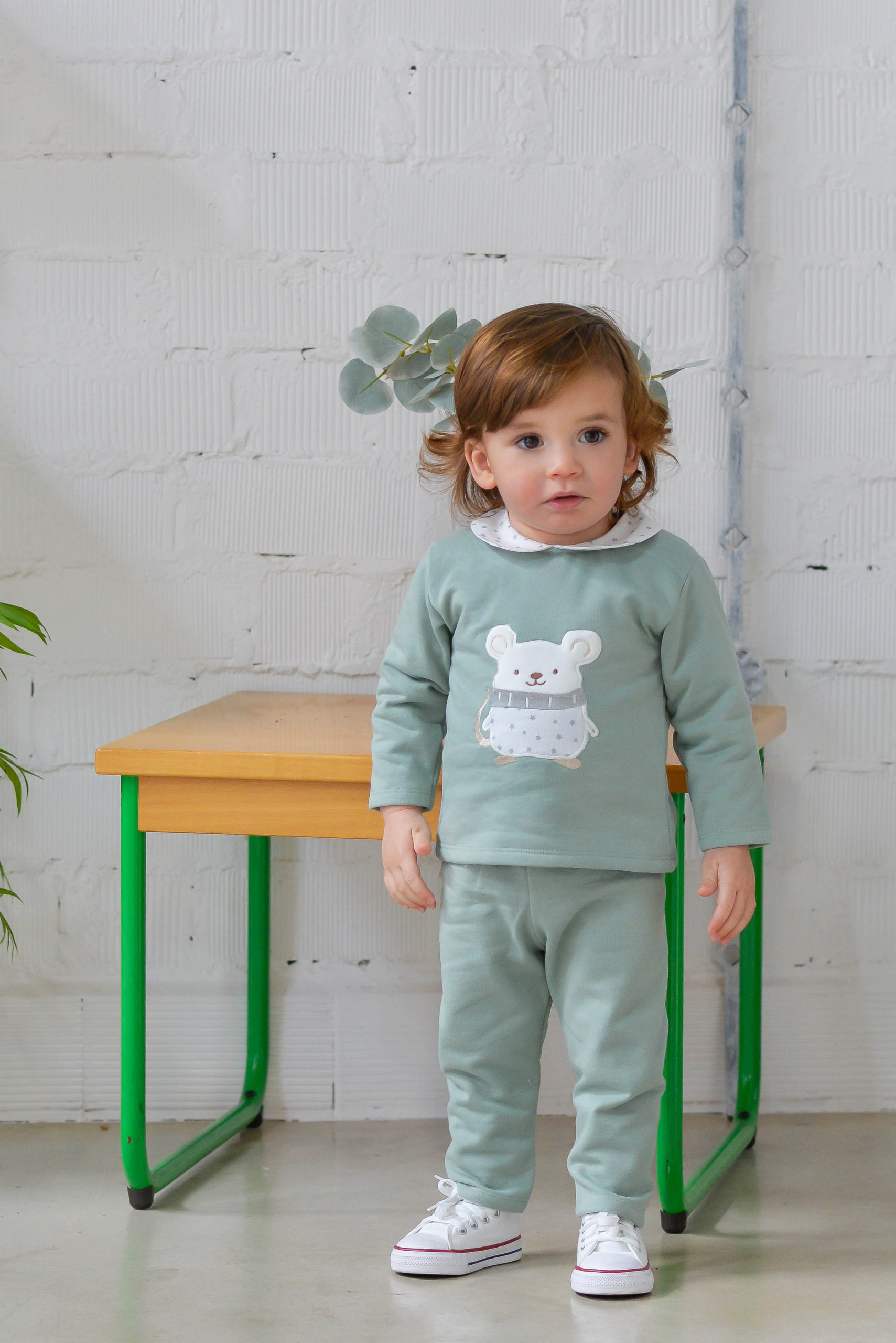 Conjunto de 2 piezas color verde agua. Sudadera con cuello bebé color blanco en estampado de estrellitas color verde, ilustración central de ratoncito, abertura en espalda con corchetes con forro interior de felpa. Pantalón largo con elástico en cintura y felpa interior. Ideal para la guardería. 100% algodón.