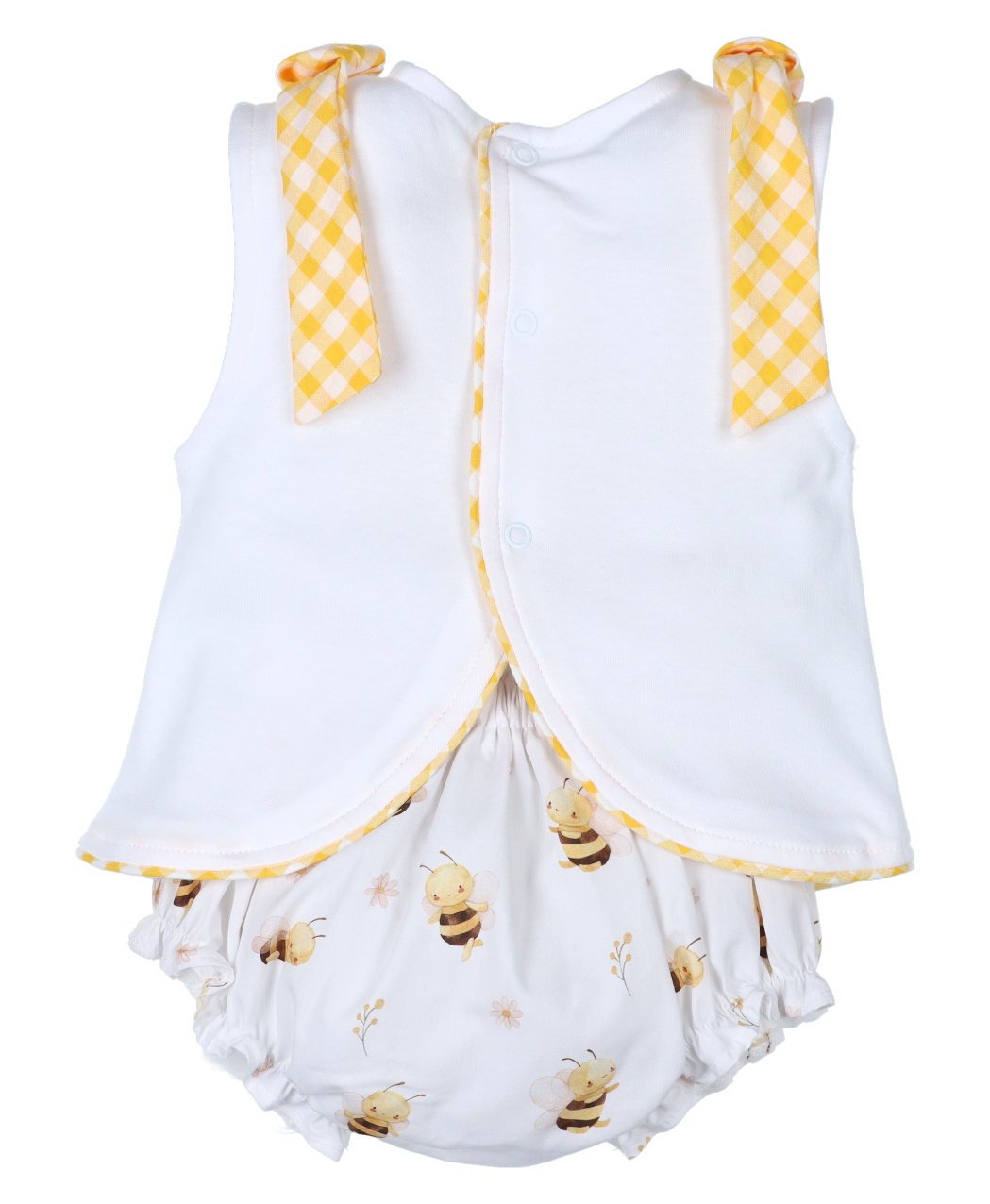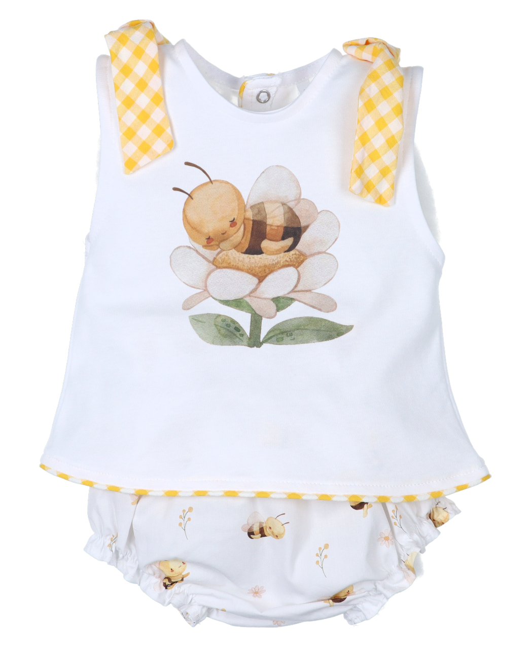 Jesusito en color blanco con ilustración de abeja y lazos vichy en color amarillo en hombros + braguita color blanco con estampado de abejitas. 100% algodón.