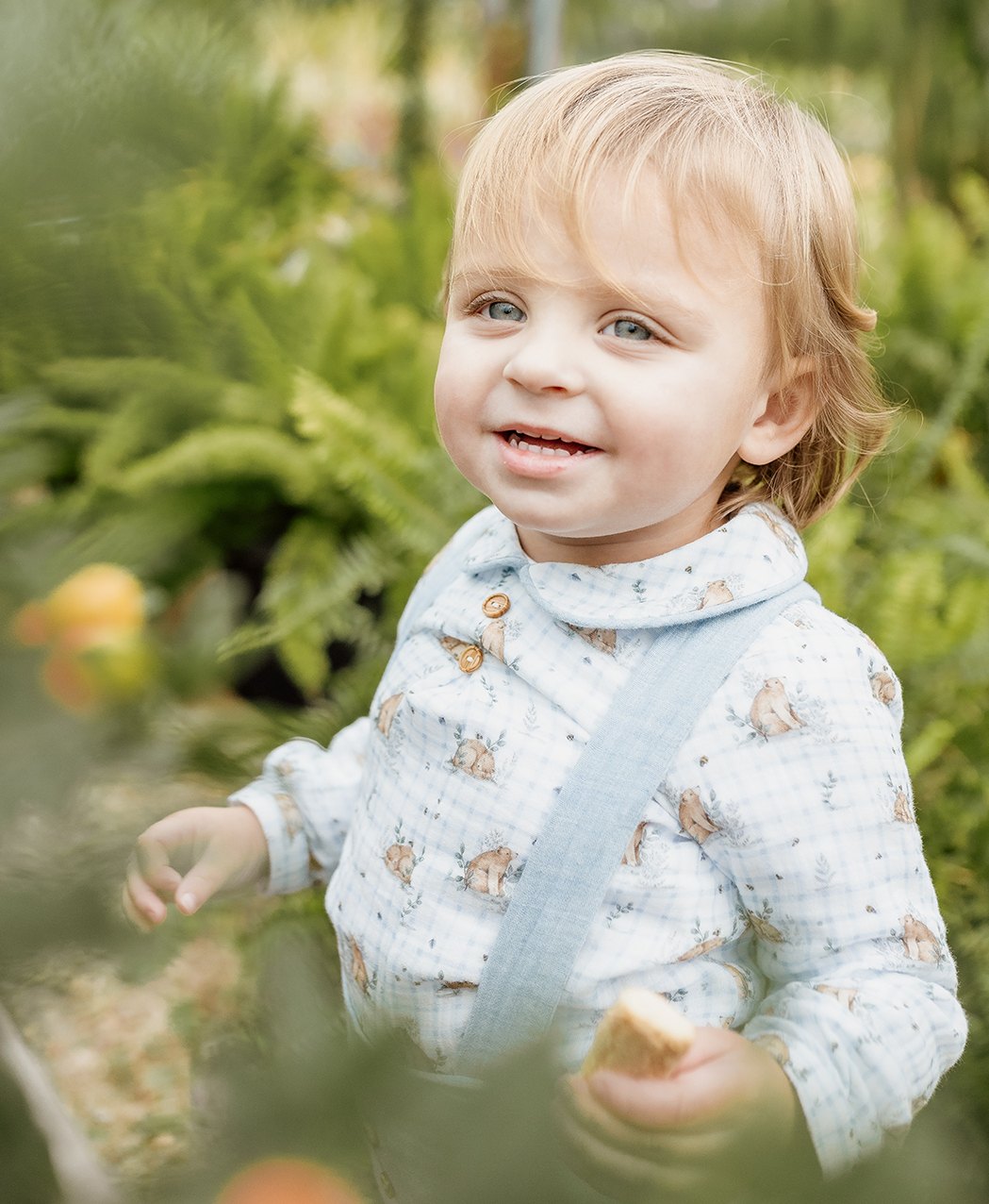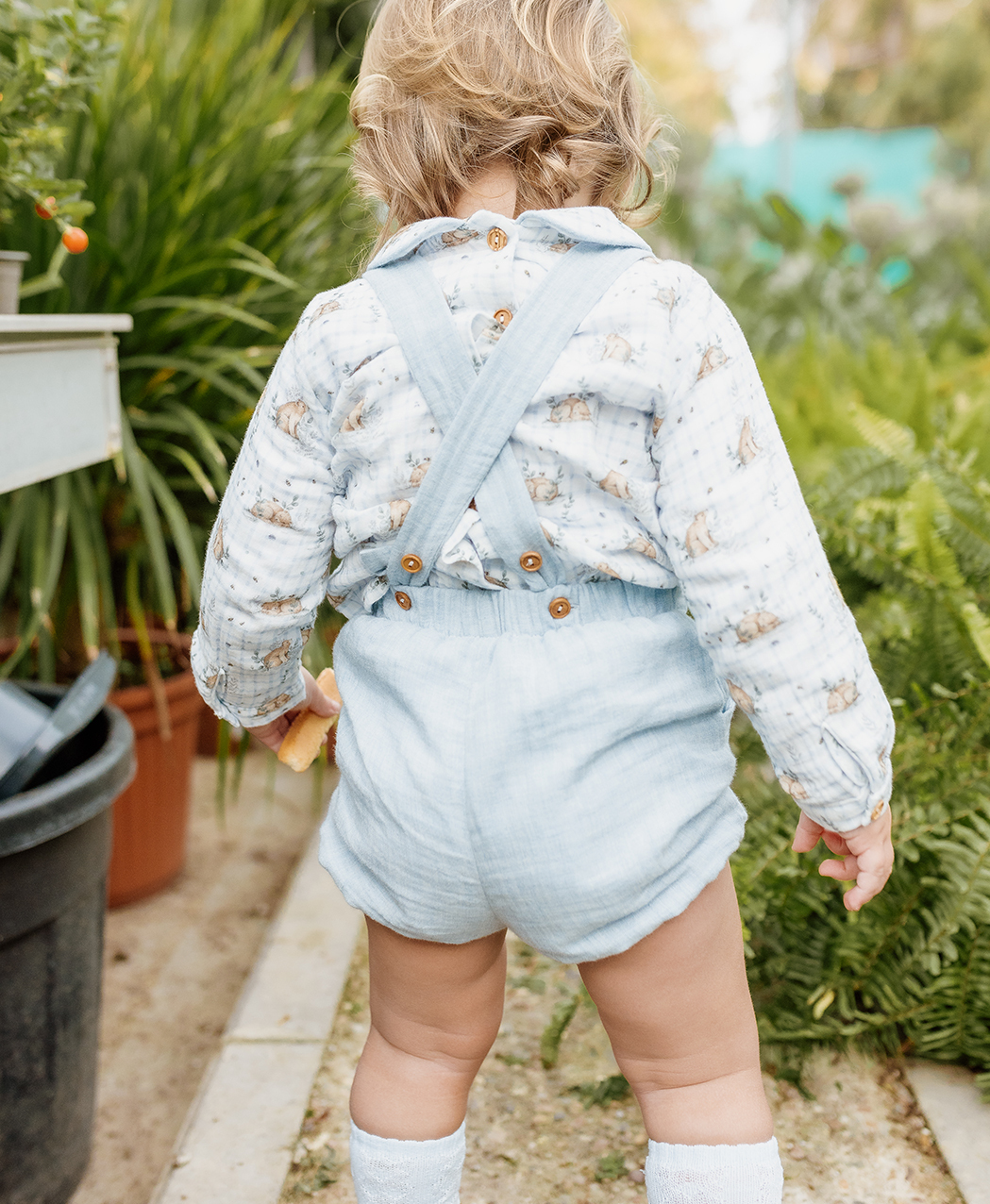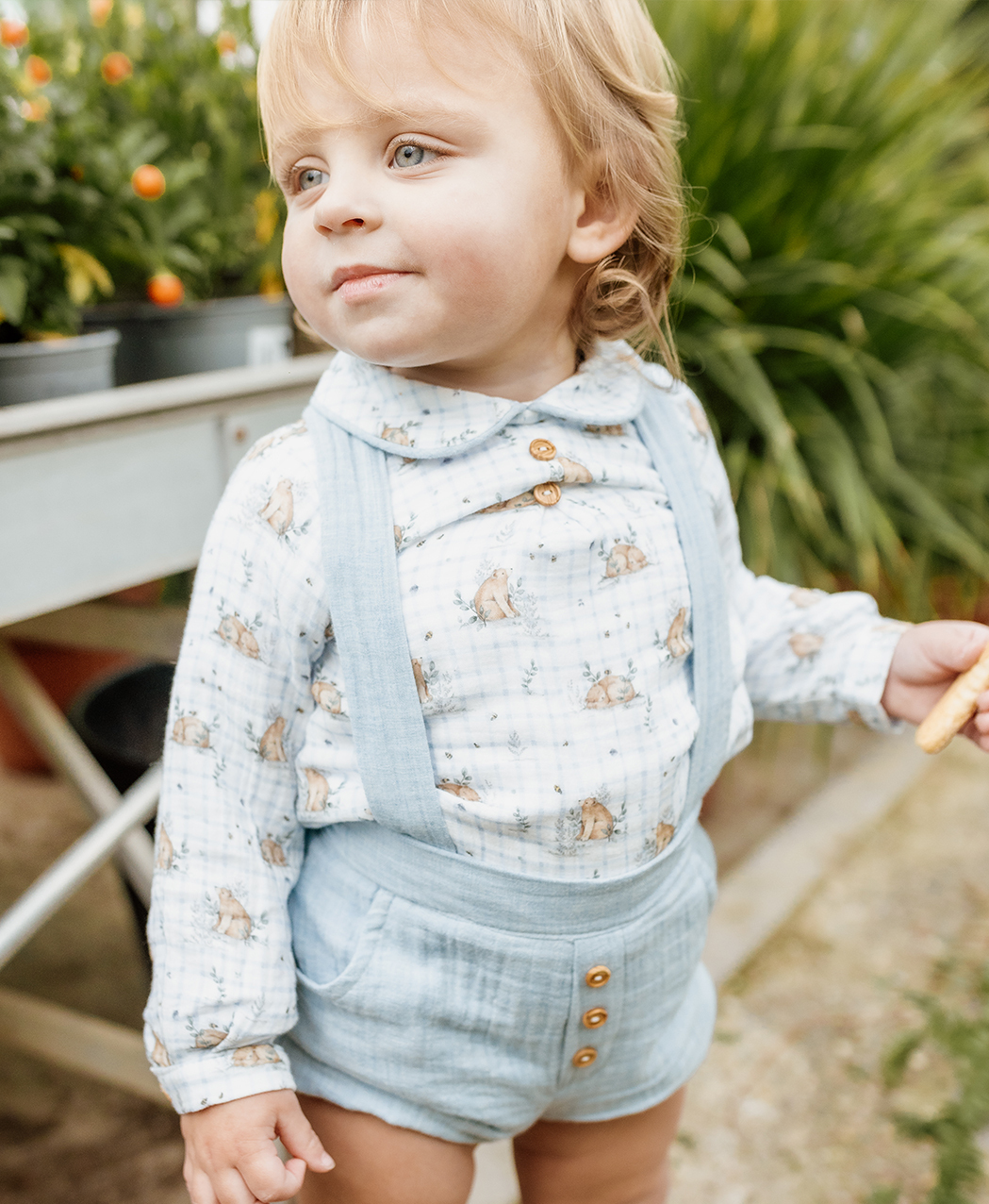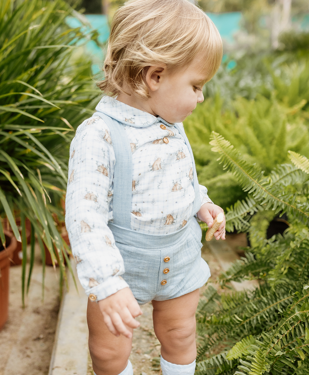 Conjunto formado por camisa de bambula con estampado de cuadros y osos en color blanco y celeste, cuello bebe y abertura en espalda con botones en madera + peto de bambula  en color azul con bolsillos laterales. Tirantes ajustables en espalda para que lo puedas aprovechar toda la temporada.