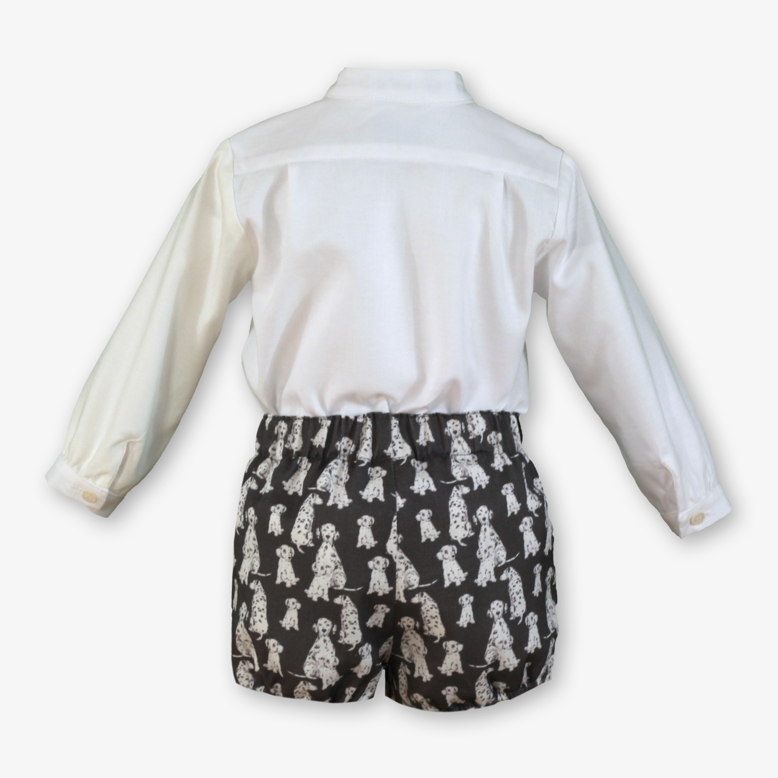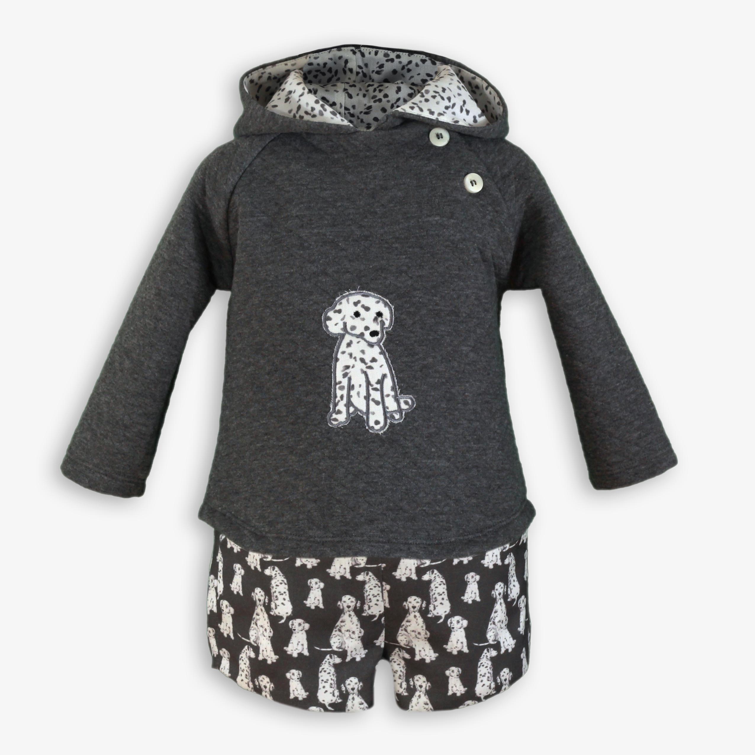 Conjunto formado por sudadera de algodón en color gris con ilustración de dálmata bordado, abertura en cuello lateral por botones, con capucha, interior de capucha en color blanco con estampado de puntos en color gris. Pantalón en color gris con estampado de dálmatas, bolsillos delanteros.