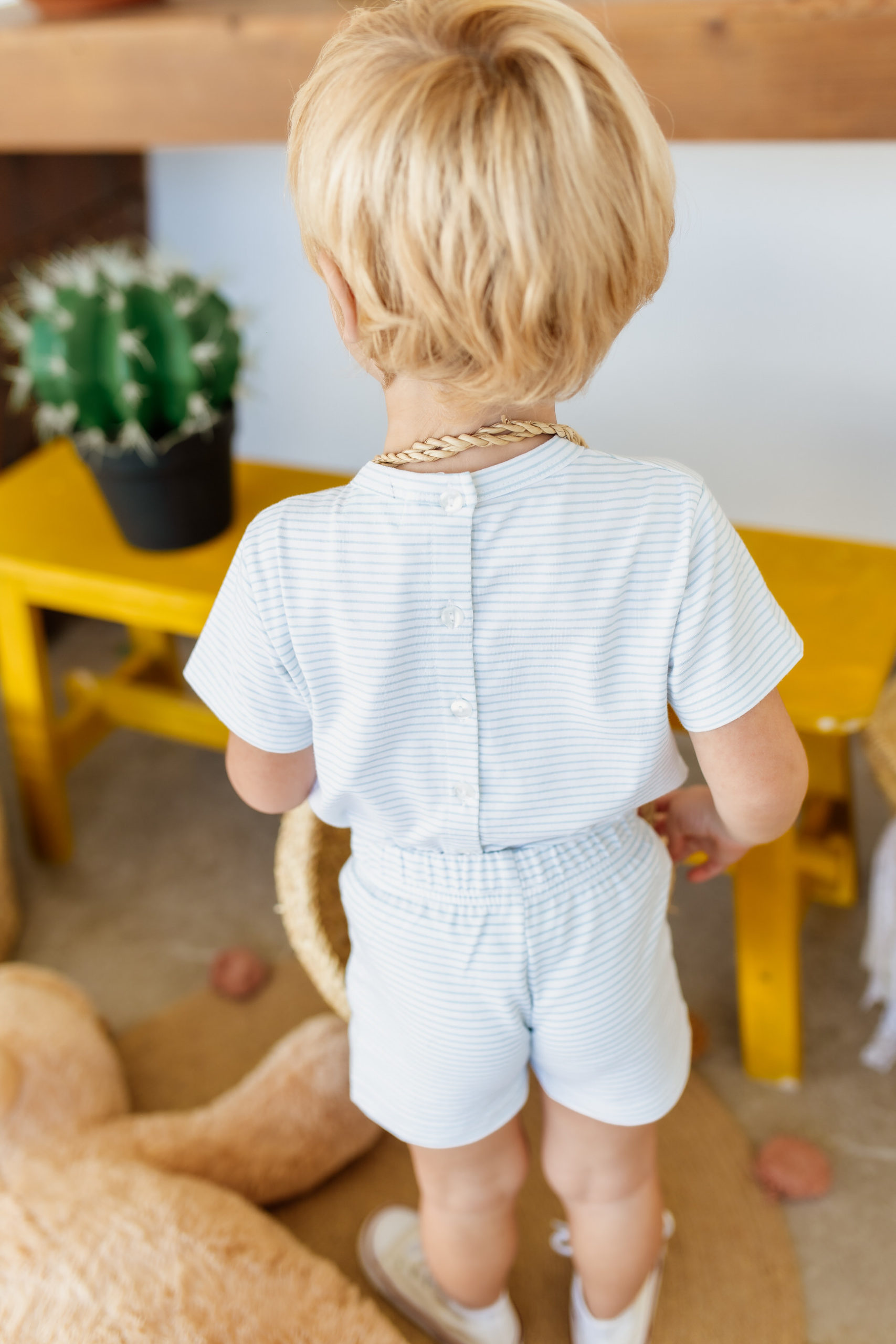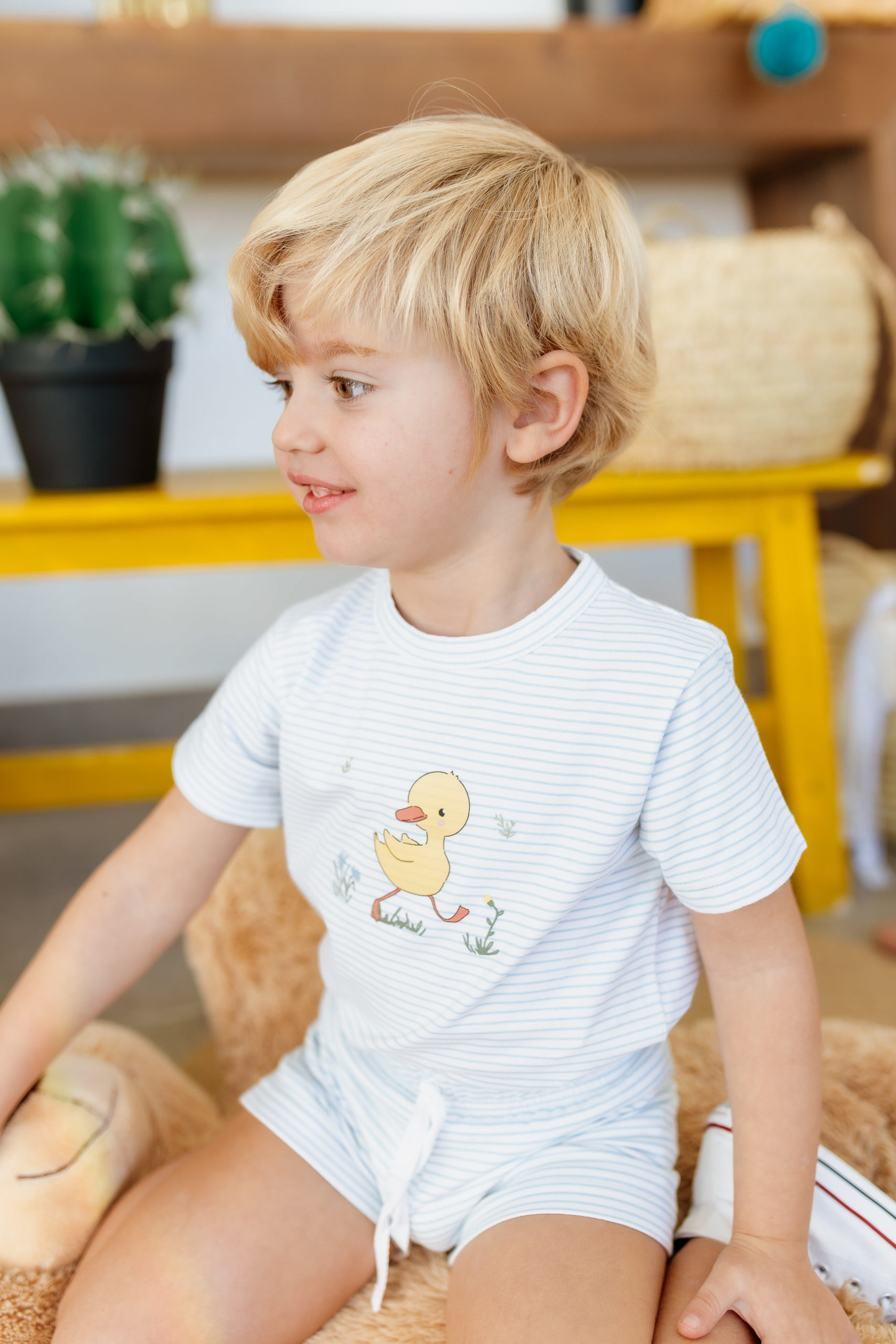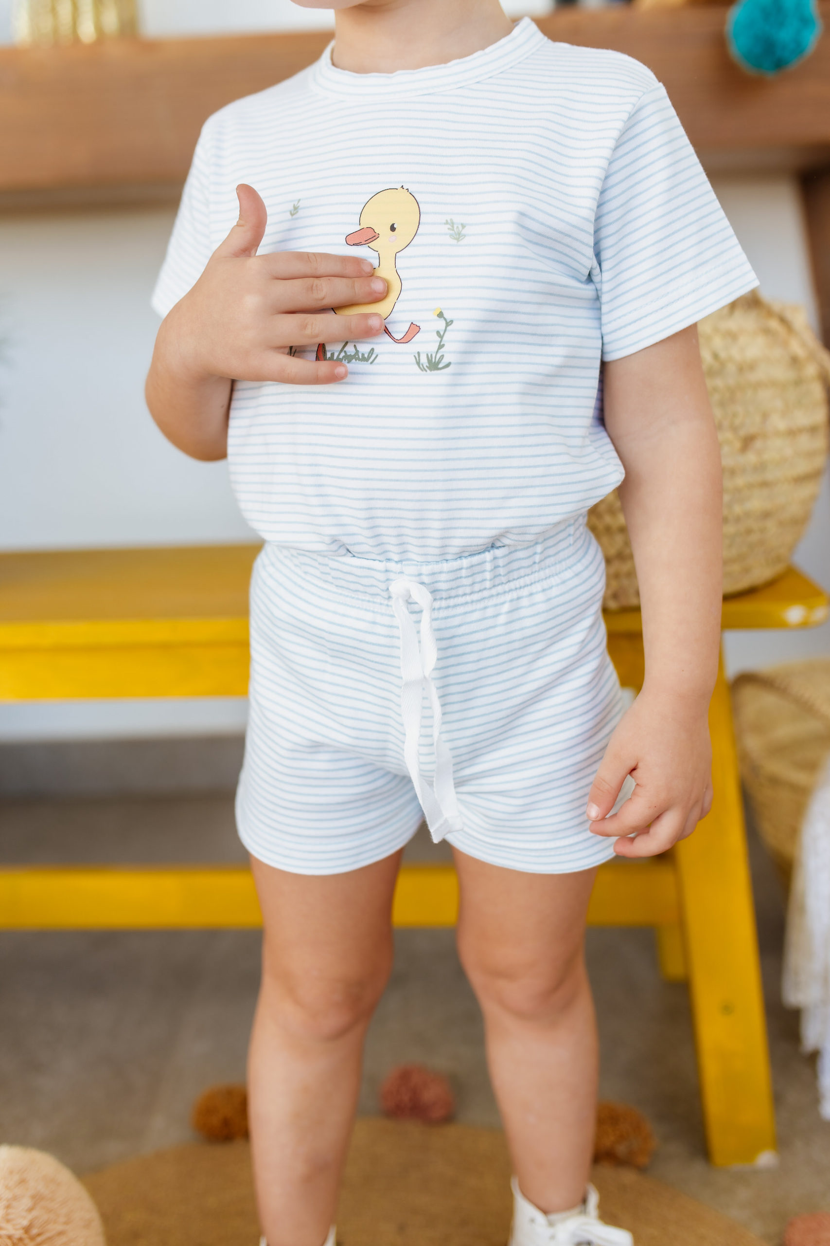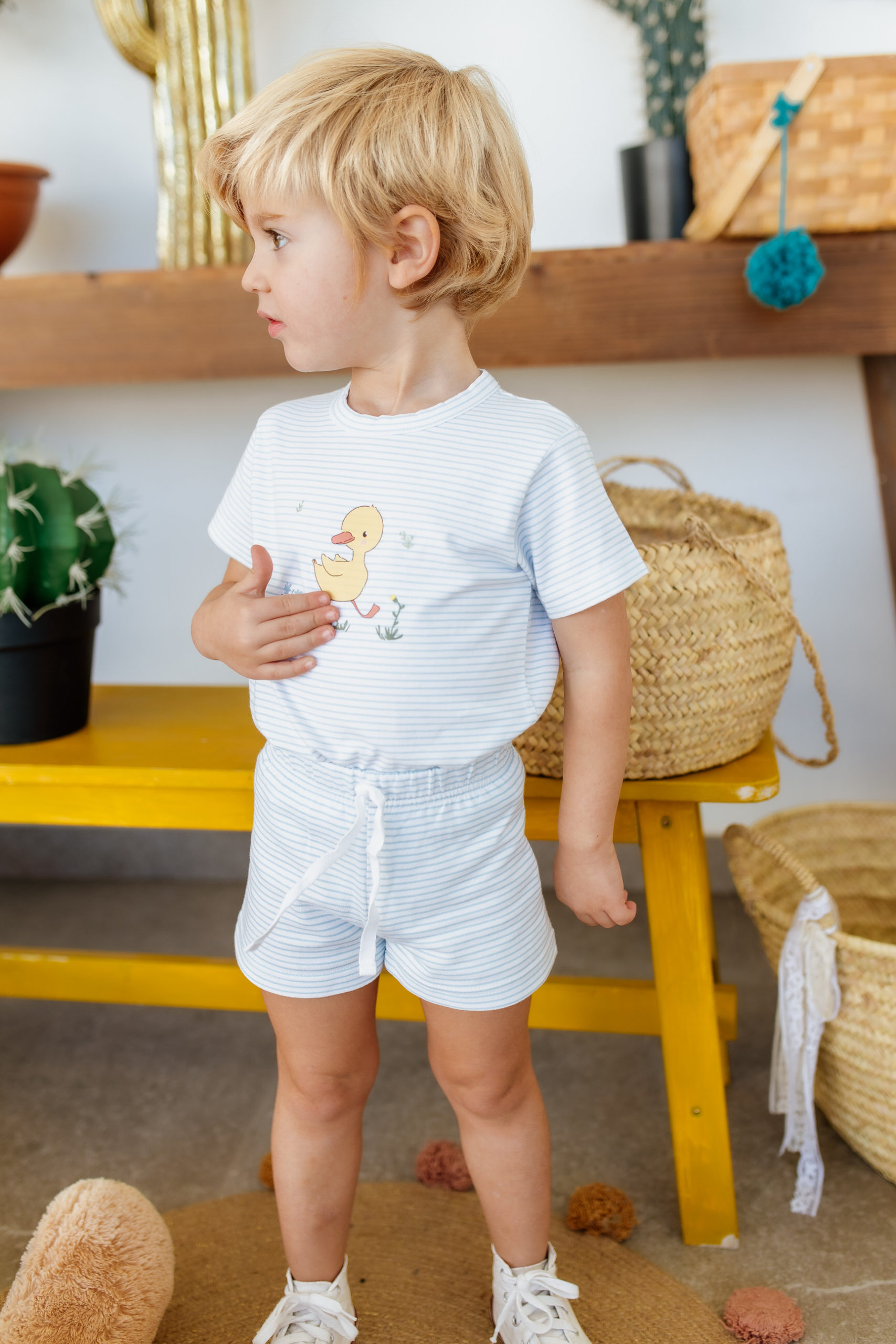 Conjunto formado por camiseta de rayas en color blanco y azul, ilustración de patito y abertura en espalda con botones + short de rayas en color blanco y azul. 100% algodón.