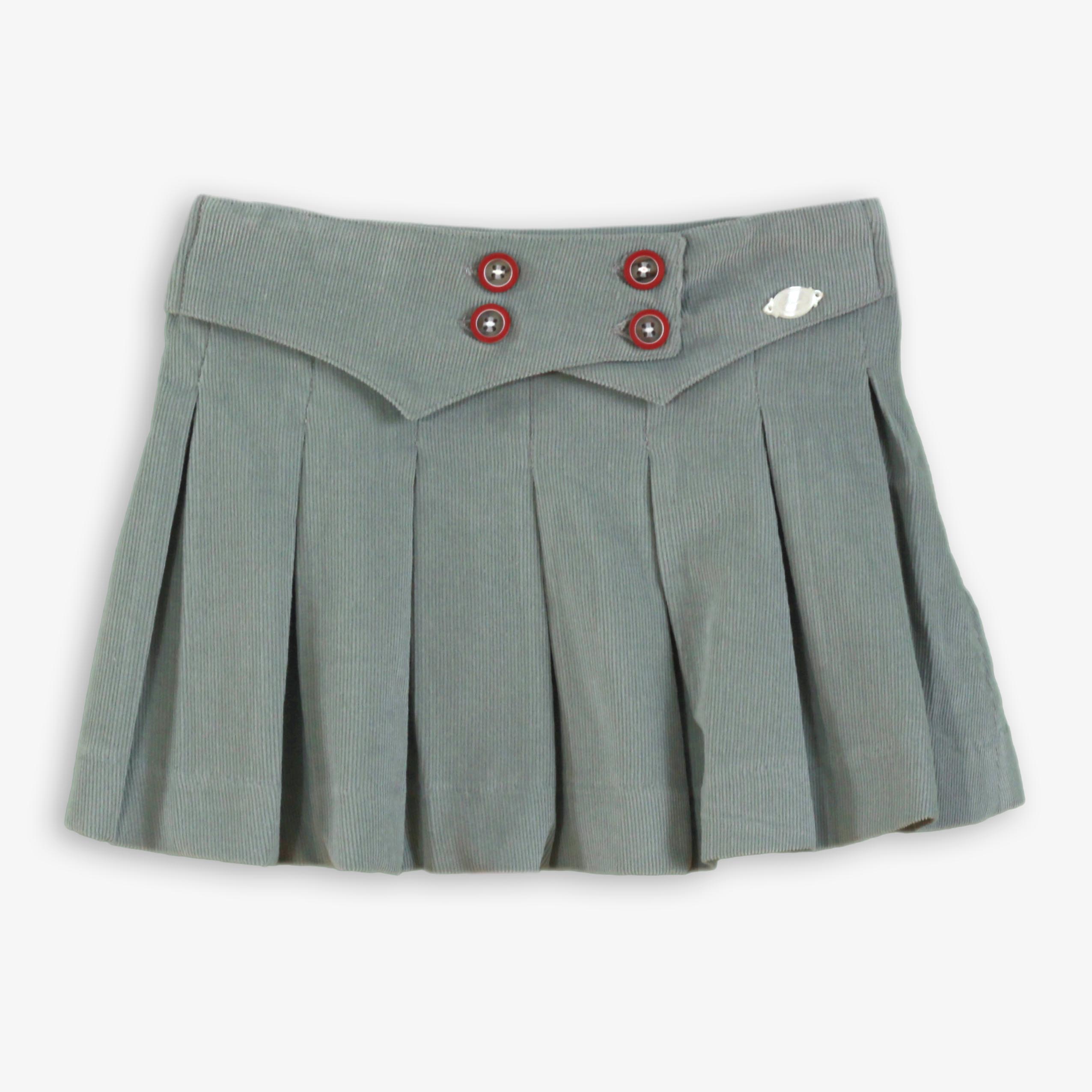 Falda de pana en color verde, con volantes, abertura lateral con cremallera, efecto cinturón con cuatros botones y volantes. Cintura ajustable.