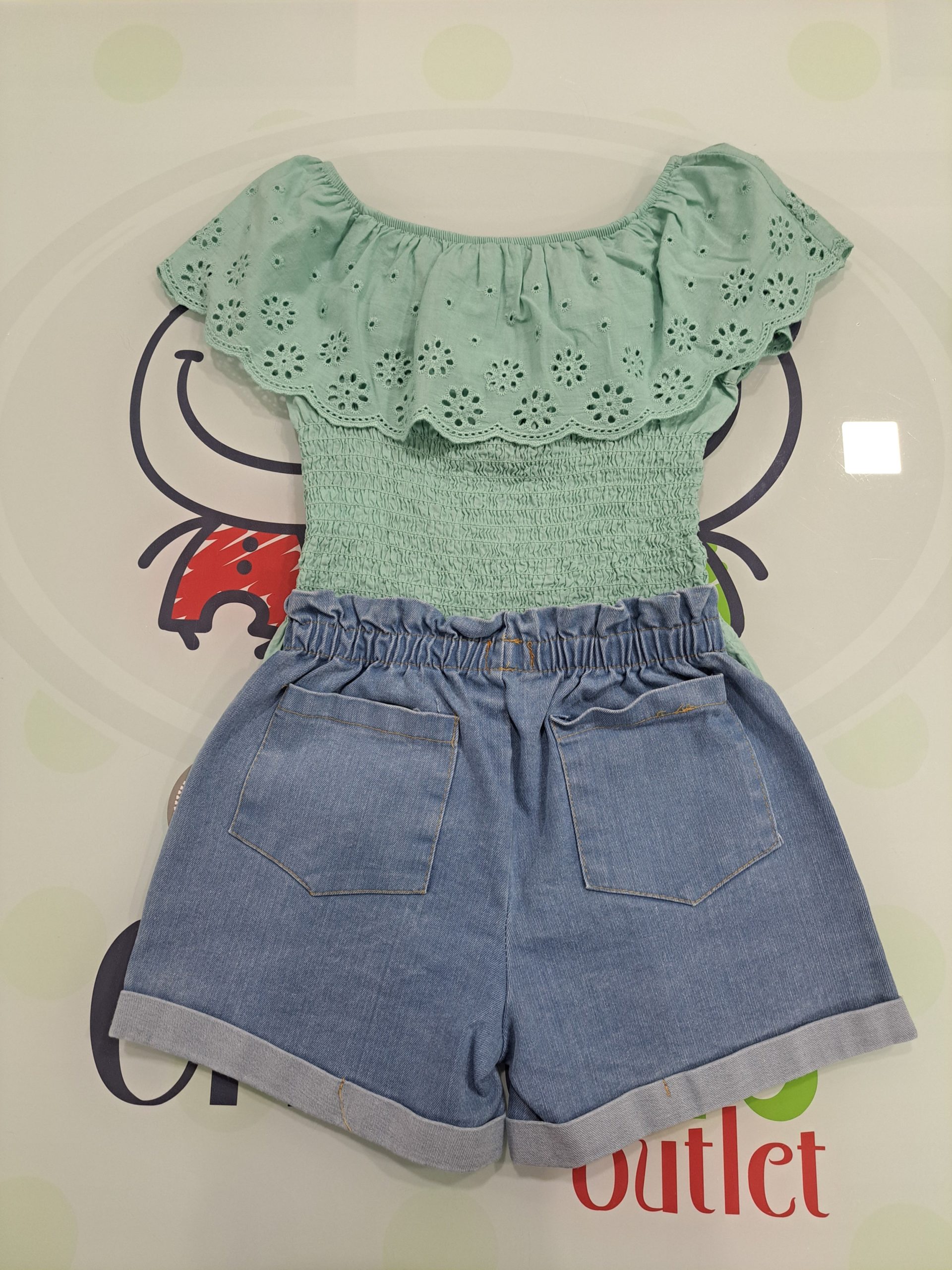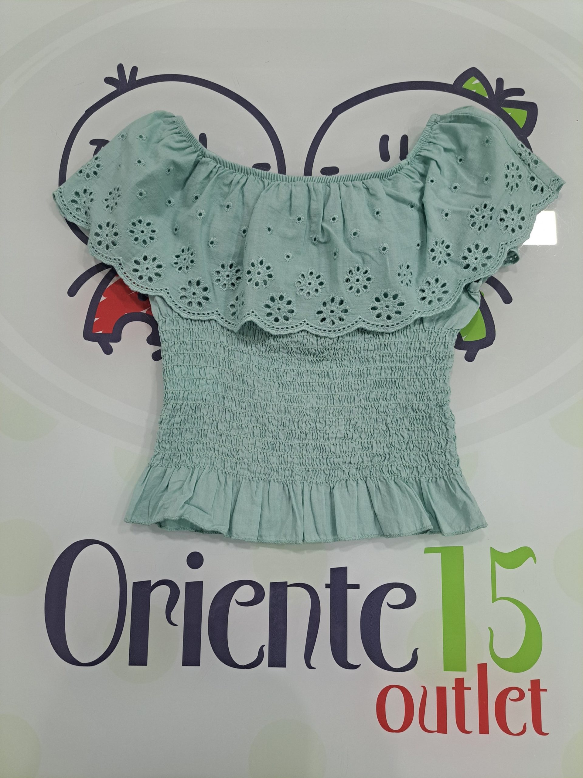 Camiseta color verde en escote barco, volantes en hombros con flores troqueladas y cuerpo en nido de abeja.