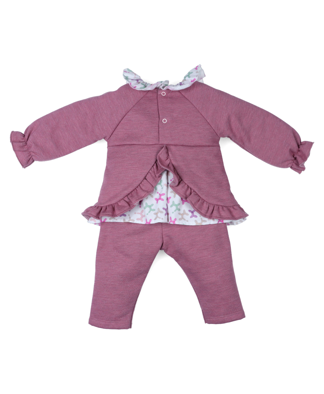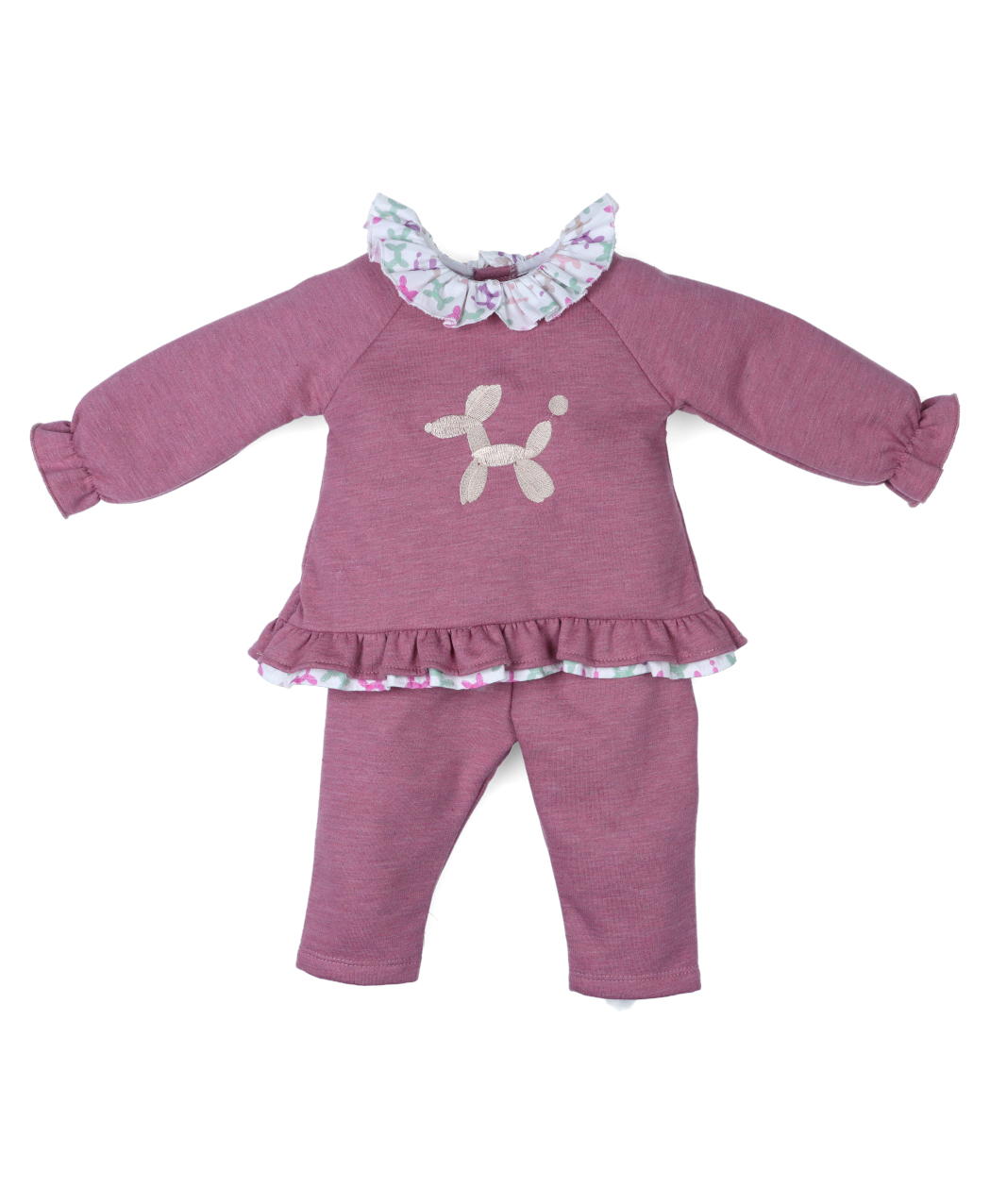 Conjunto de 2 piezas. Sudadera en color malva con ilustración de perro globo bordado, volante en el cuello y en la cintura con estampado de perros multicolor, goma en puño y forro interior afelpado. Abertura en espalda con corchetes, volantes y estampado de perros. Pantalón largo con elástico en cintura y forro interior de felpa. Ideal para la guardería.