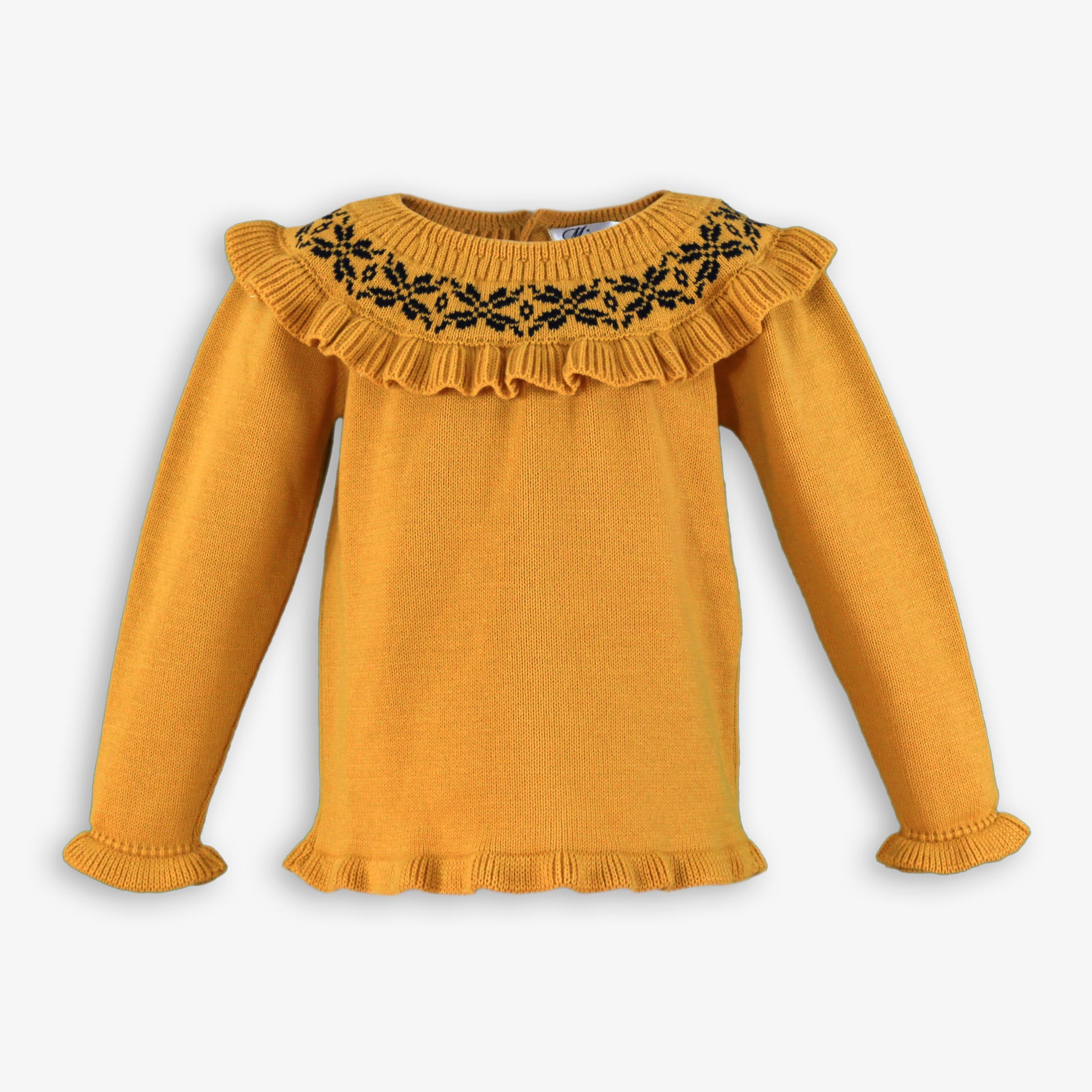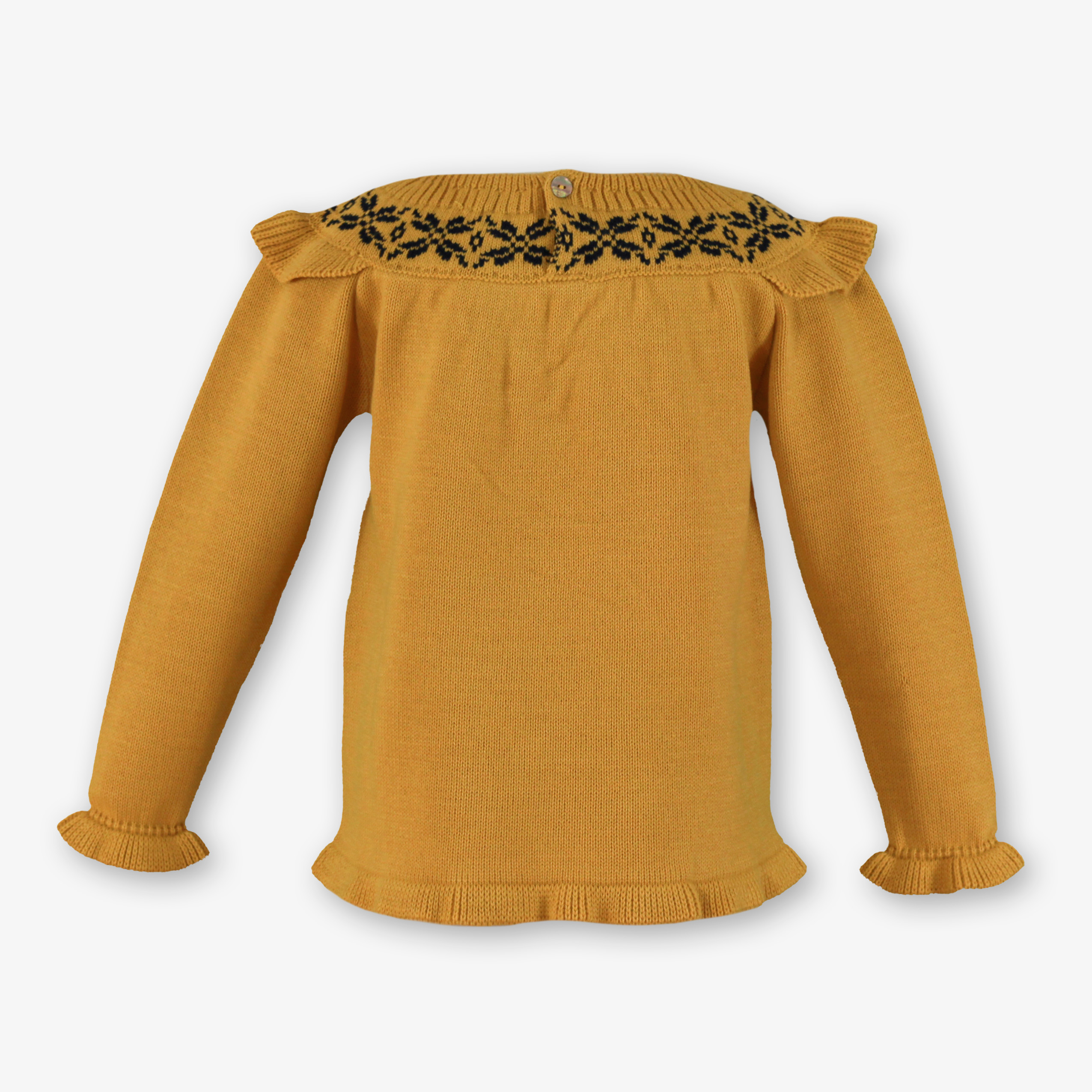 Jersey de punto en color mostaza, cuello redondo con estampado de flores en tonos negro, con volante. Mangas elásticas. Abertura trasera por un botón.