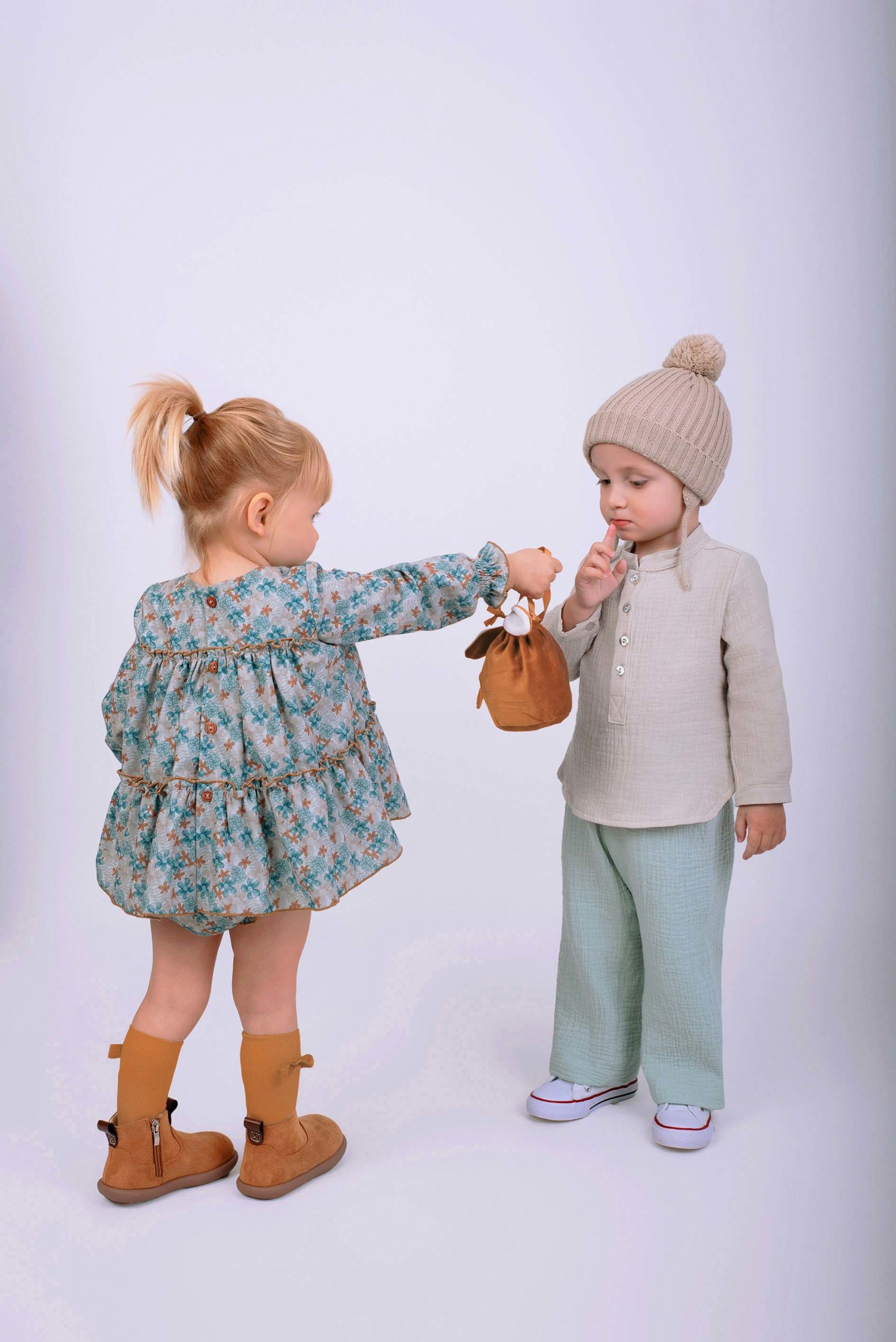 Jesusito en color azul grisáceo con estampado de flores en tonos marrón, azul y verde, mangas elásticas. Abertura trasera por botones. Con forro interior.  Braga en color azul grisáceo con estampado de flores en tonos marrón, azul y verde.