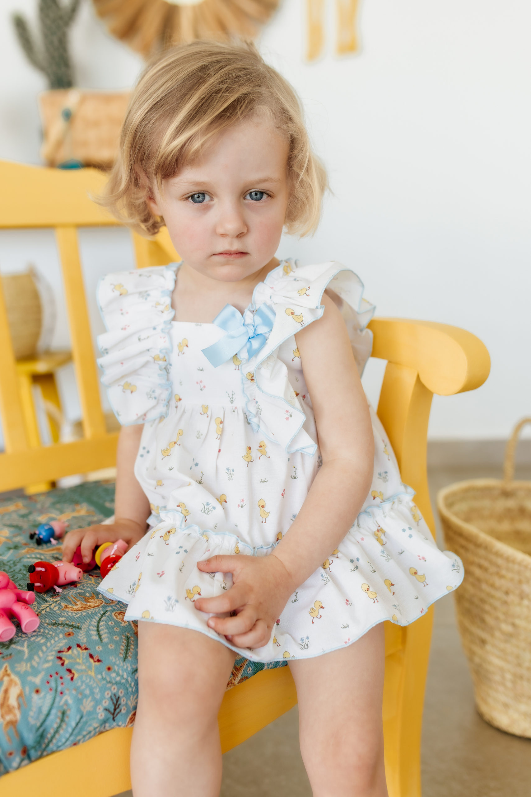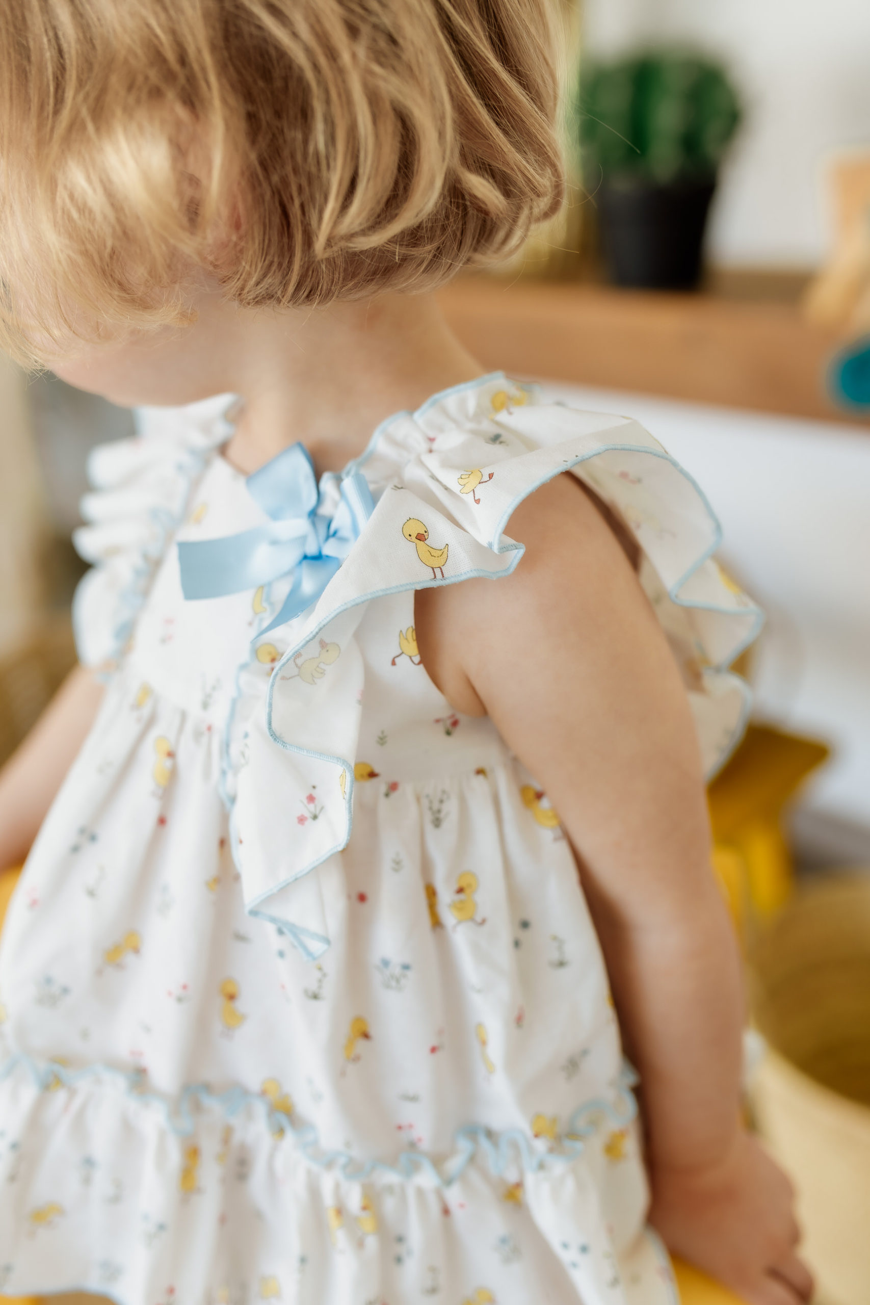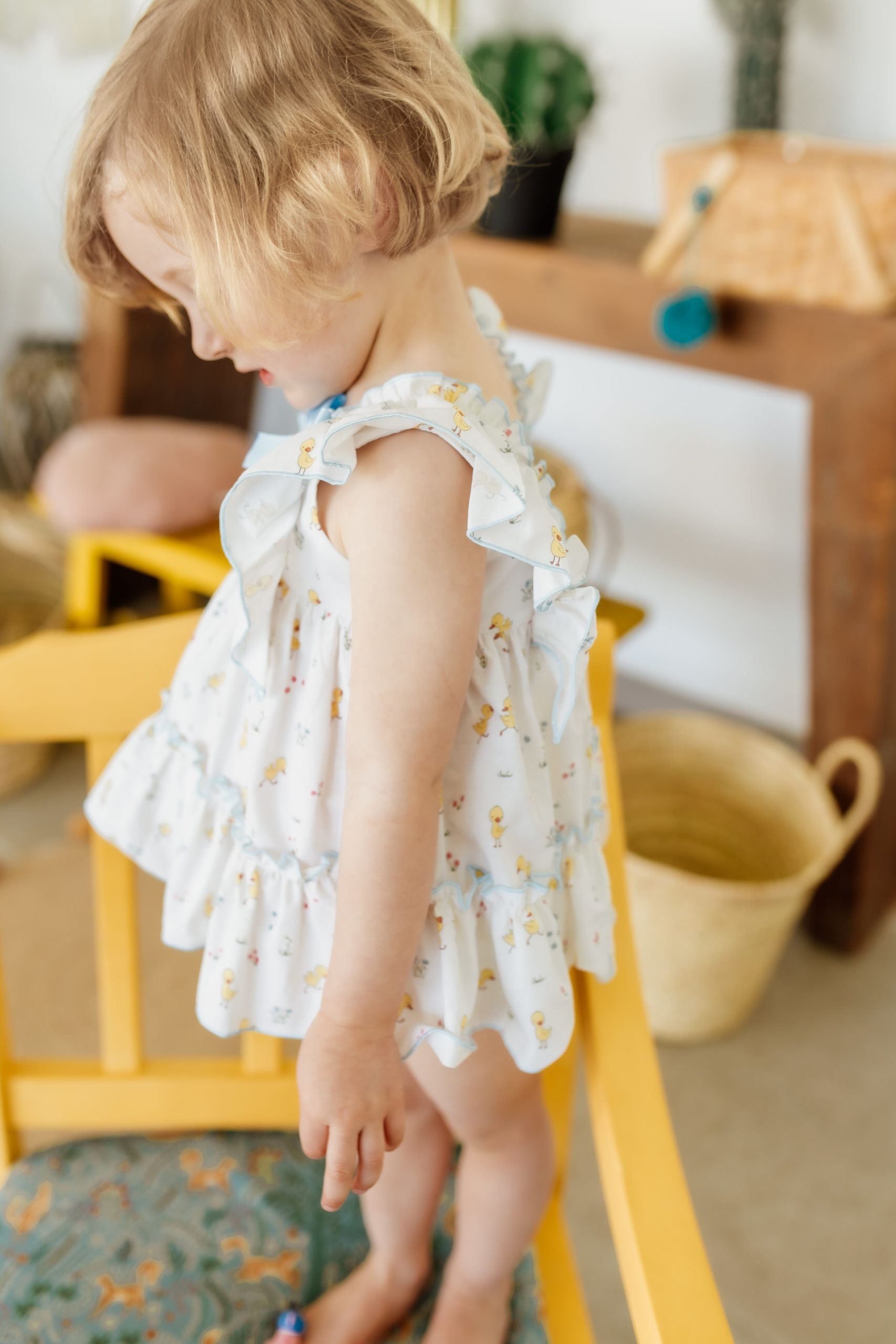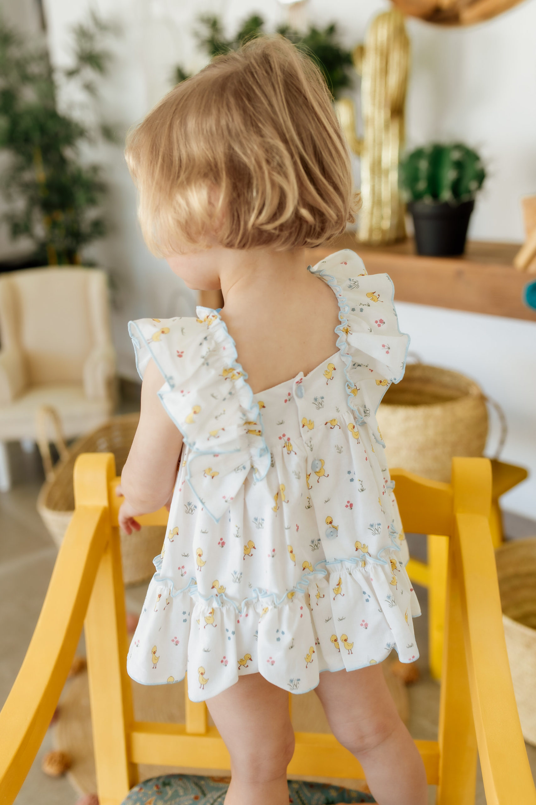 Jesusito blanco en estampado de patitos, volantes en hombros, bordado y lazo en color azul celeste. Abertura en espalda con botones celestes.