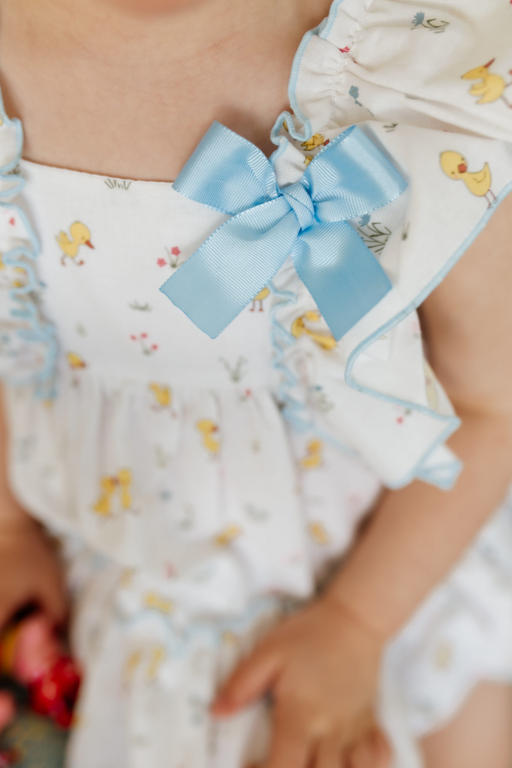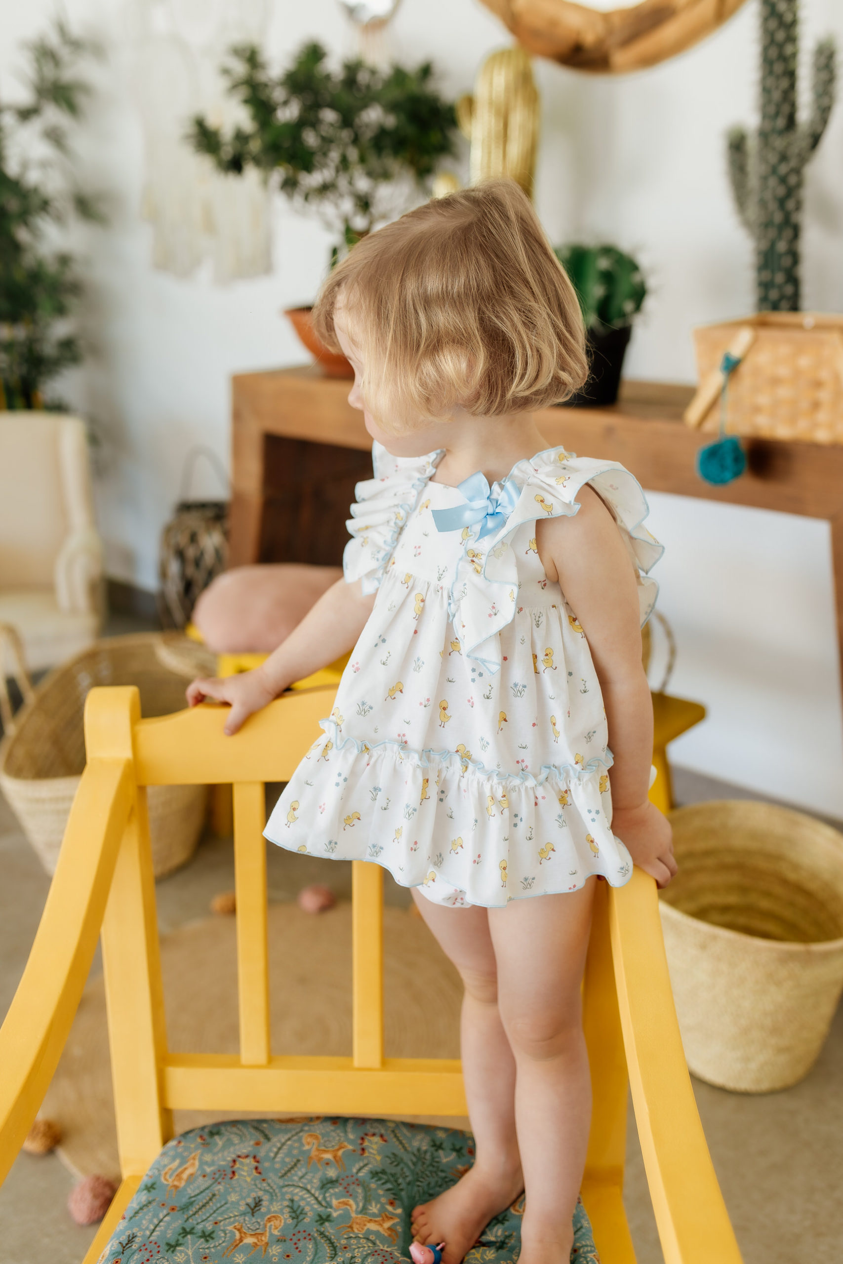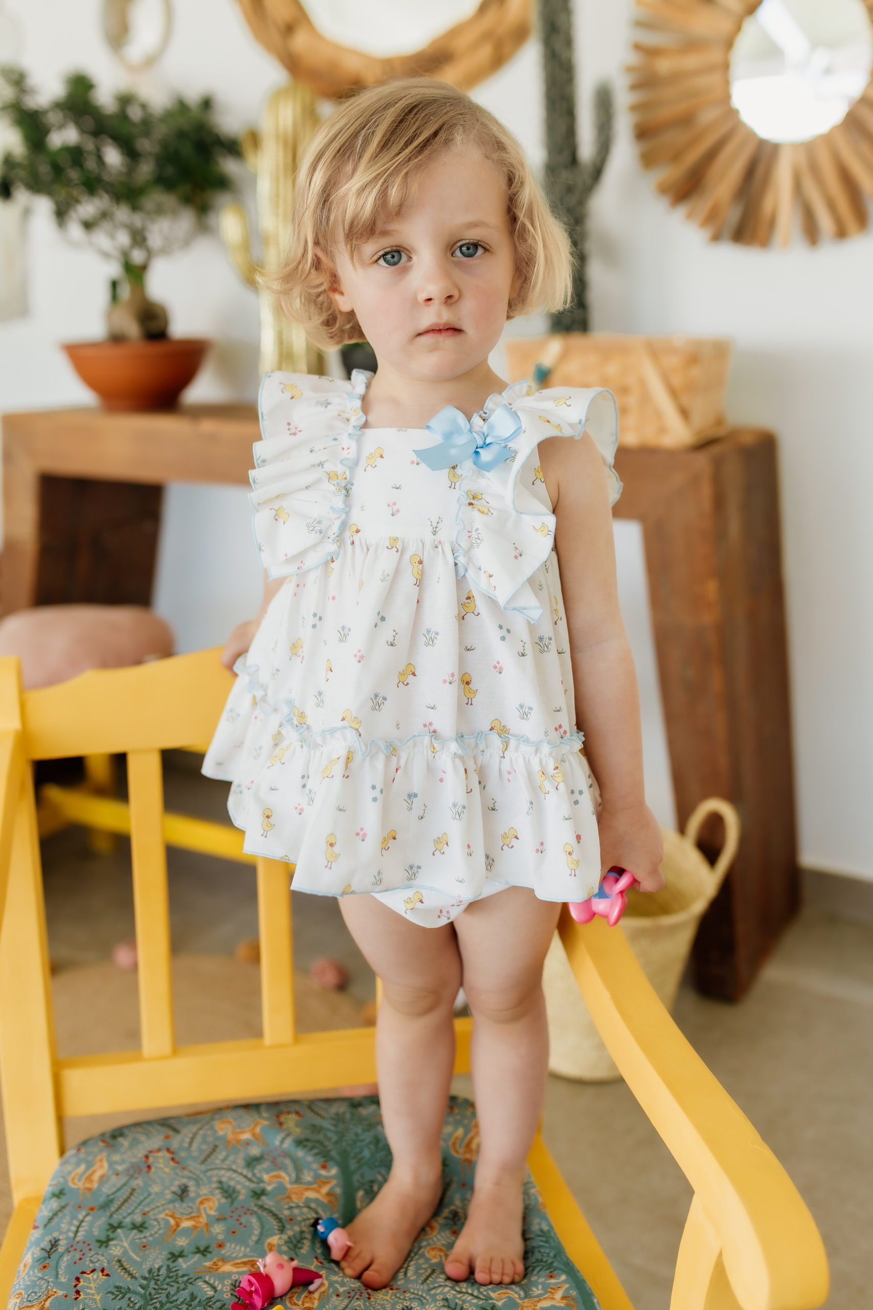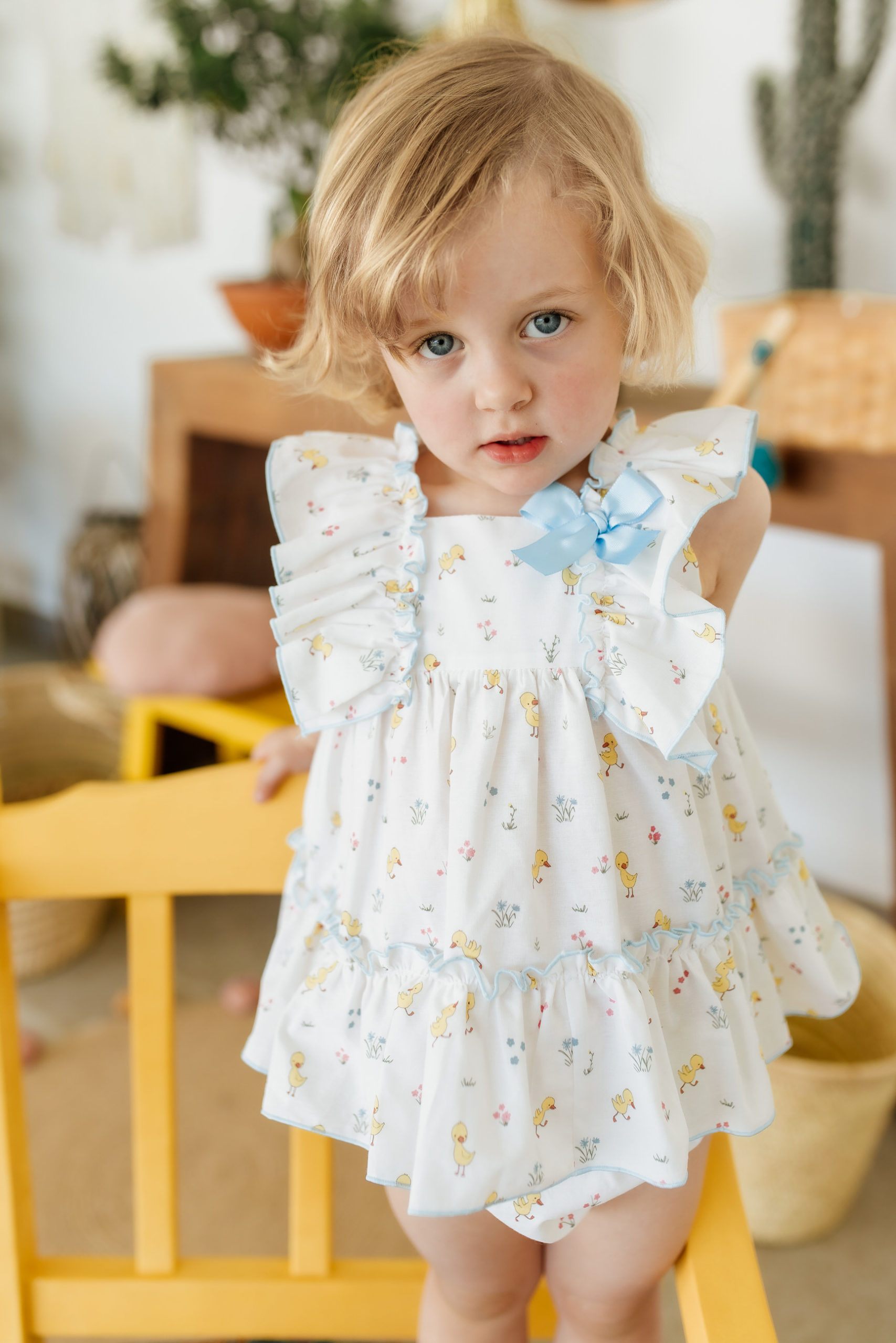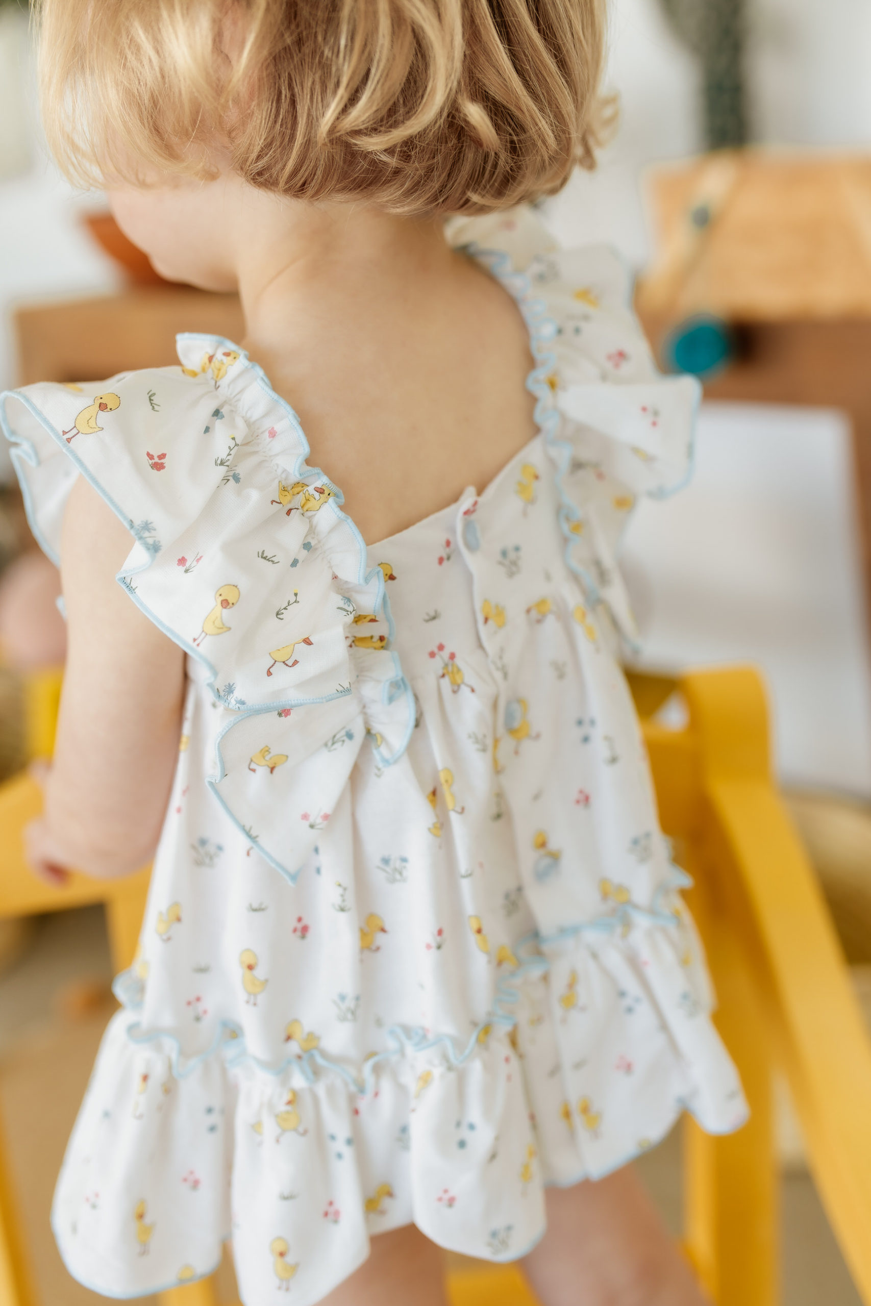 Jesusito blanco en estampado de patitos, volantes en hombros, bordado y lazo en color azul celeste. Abertura en espalda con botones celestes.