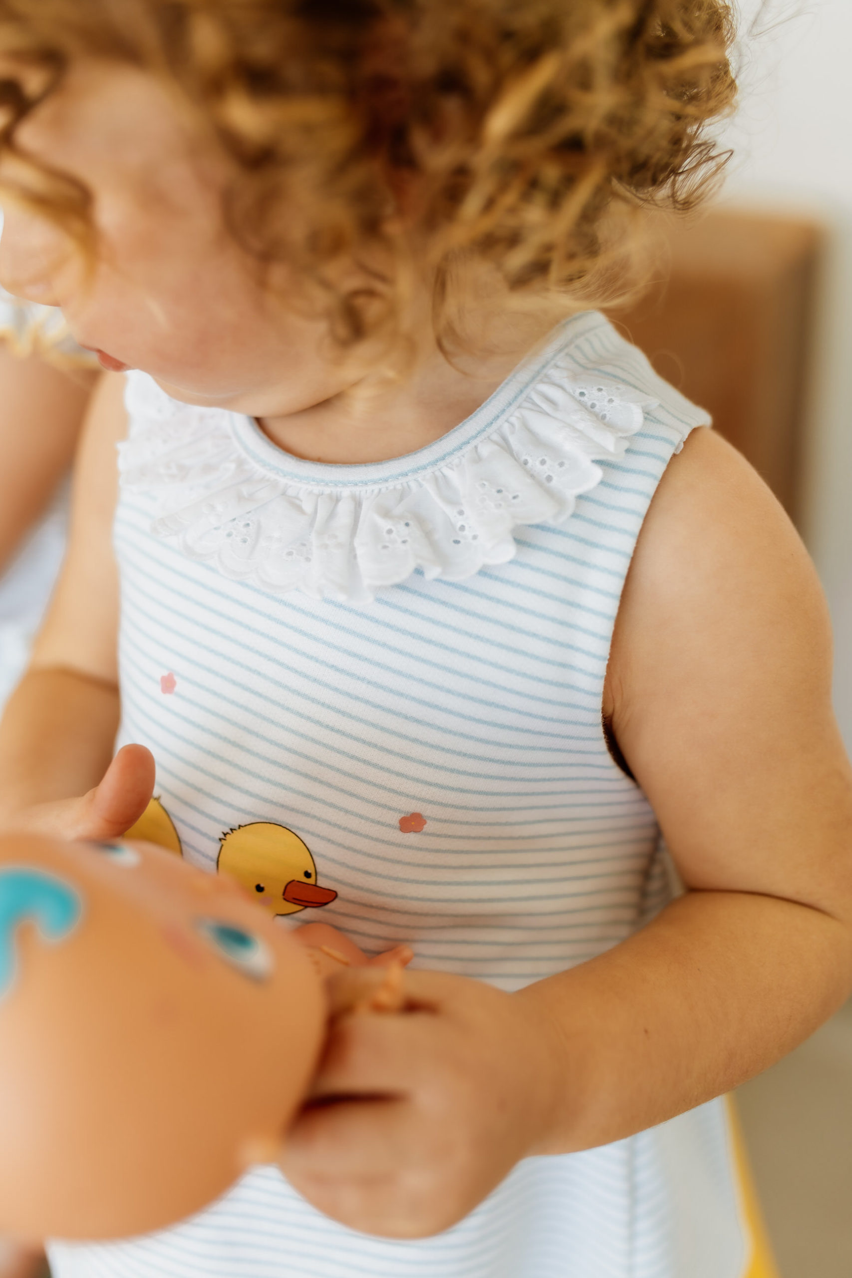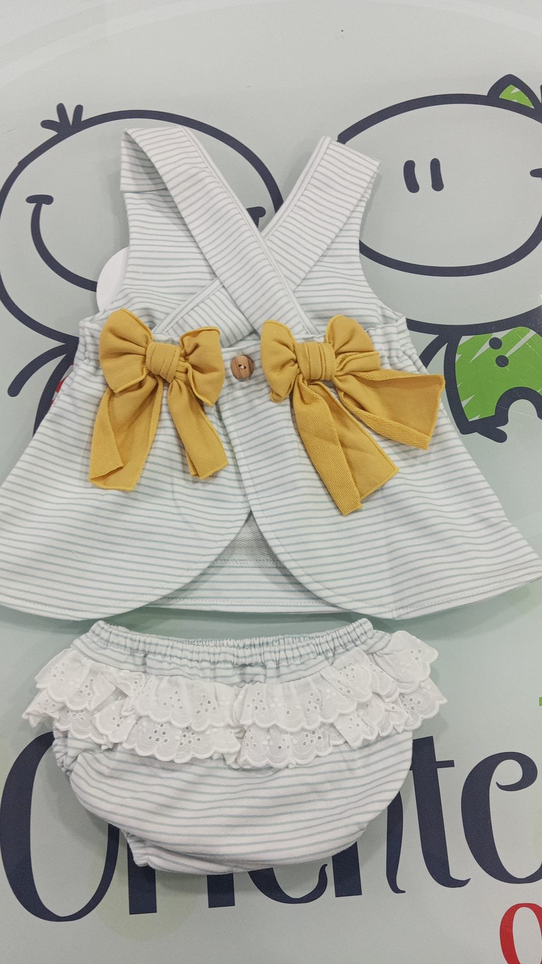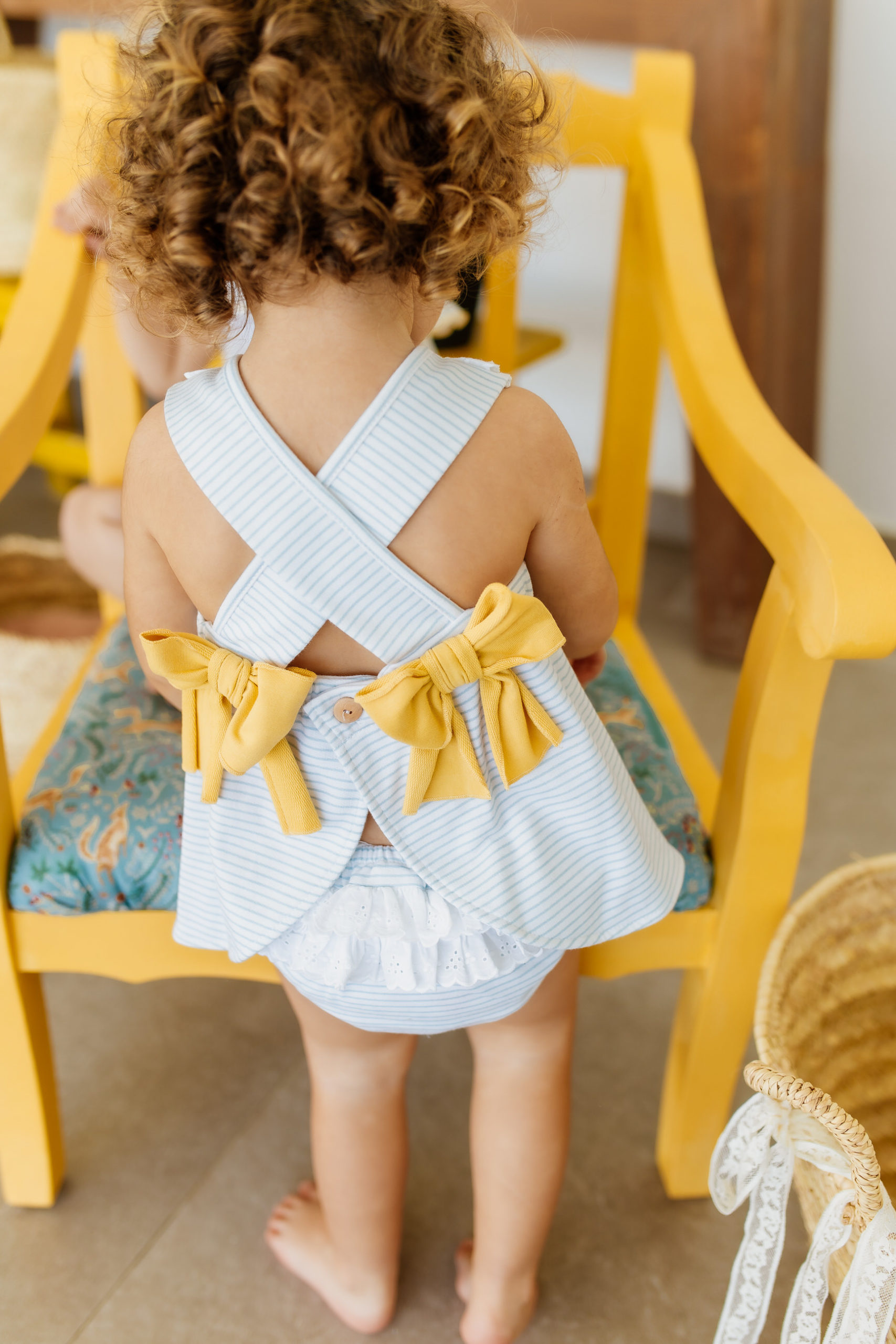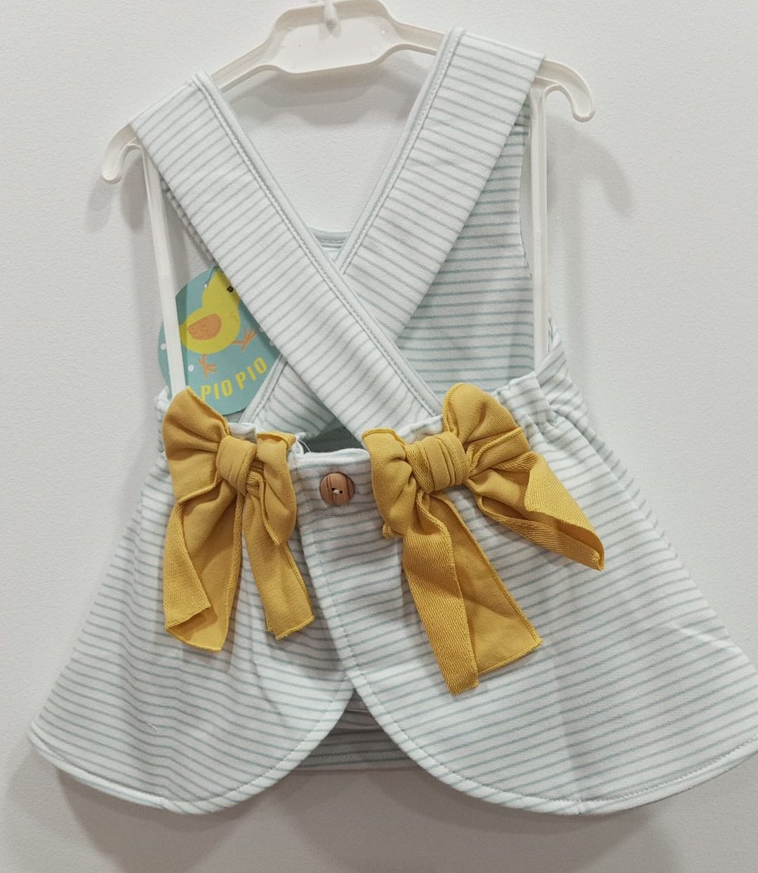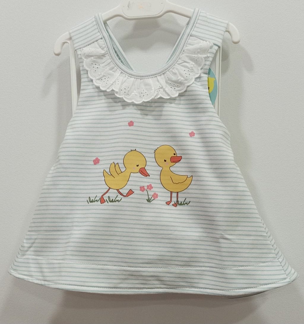 Jesusito de rayas en color blanco y azul, cuello bordado en color blanco, ilustración de patitos y lazos en espalda amarillos. Abertura en espalda con botones. 100% algodón.