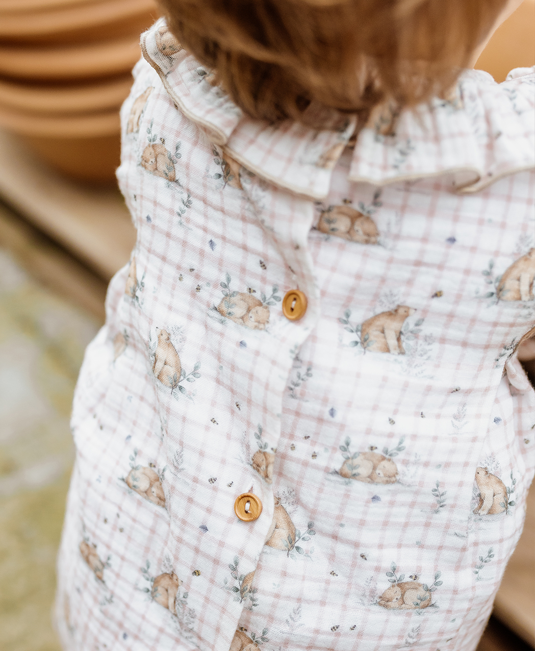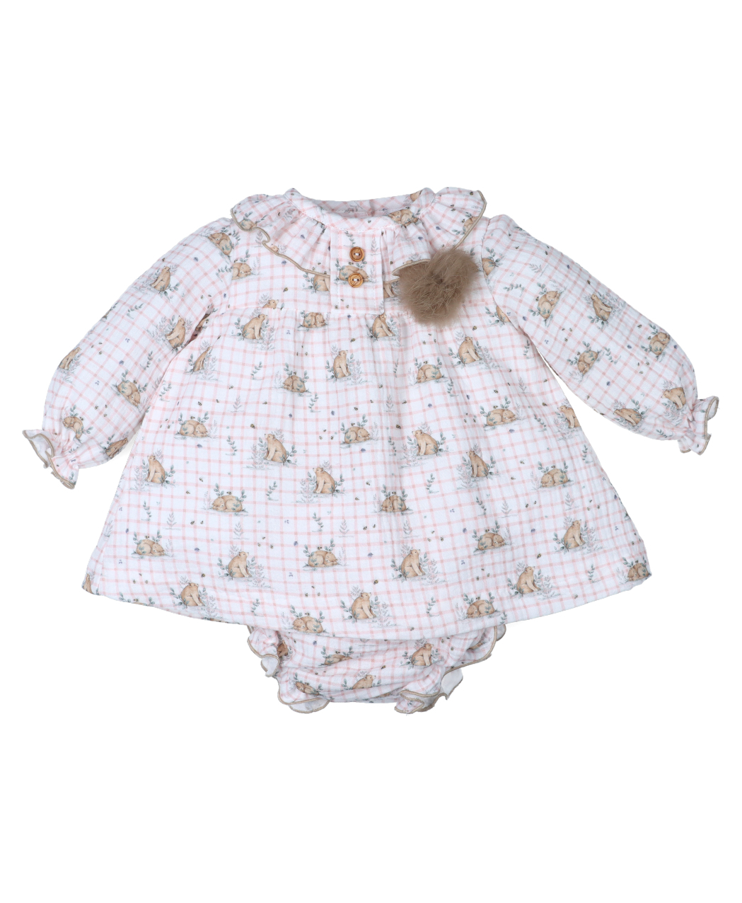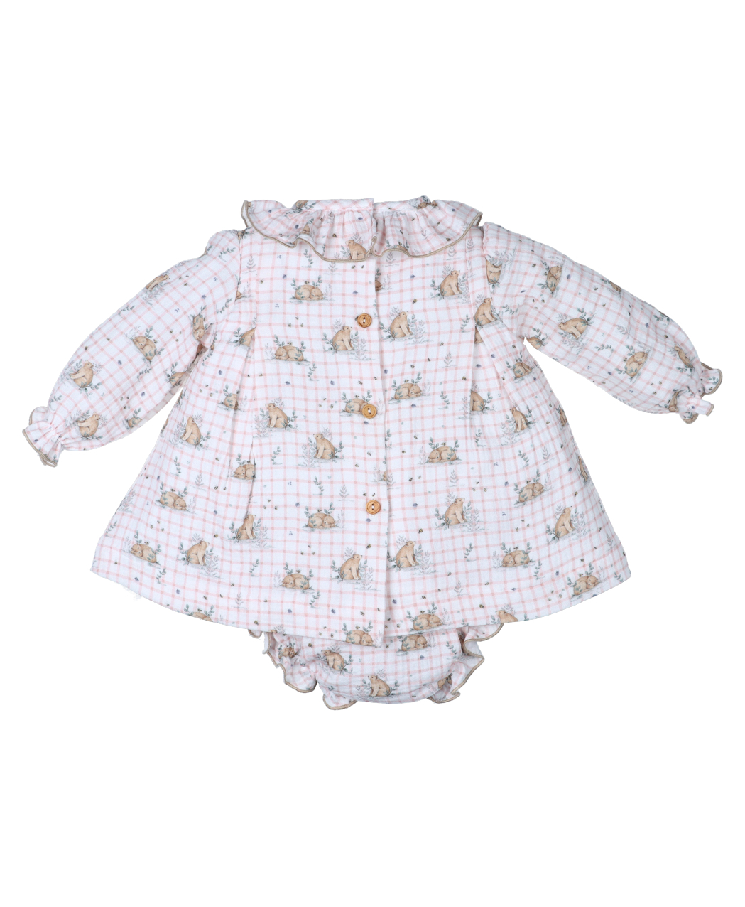 Jesusito bambula de cuadros en tono blanco y rosa. con estampado de osos. Volantes en el cuello en mismo estampado ribeteado en color marrón. Pompón en el pecho y falsos botones en madera. Elástico en manga y abertura en espalda con botones en madera. Braguita de bambula en mismo estampado,