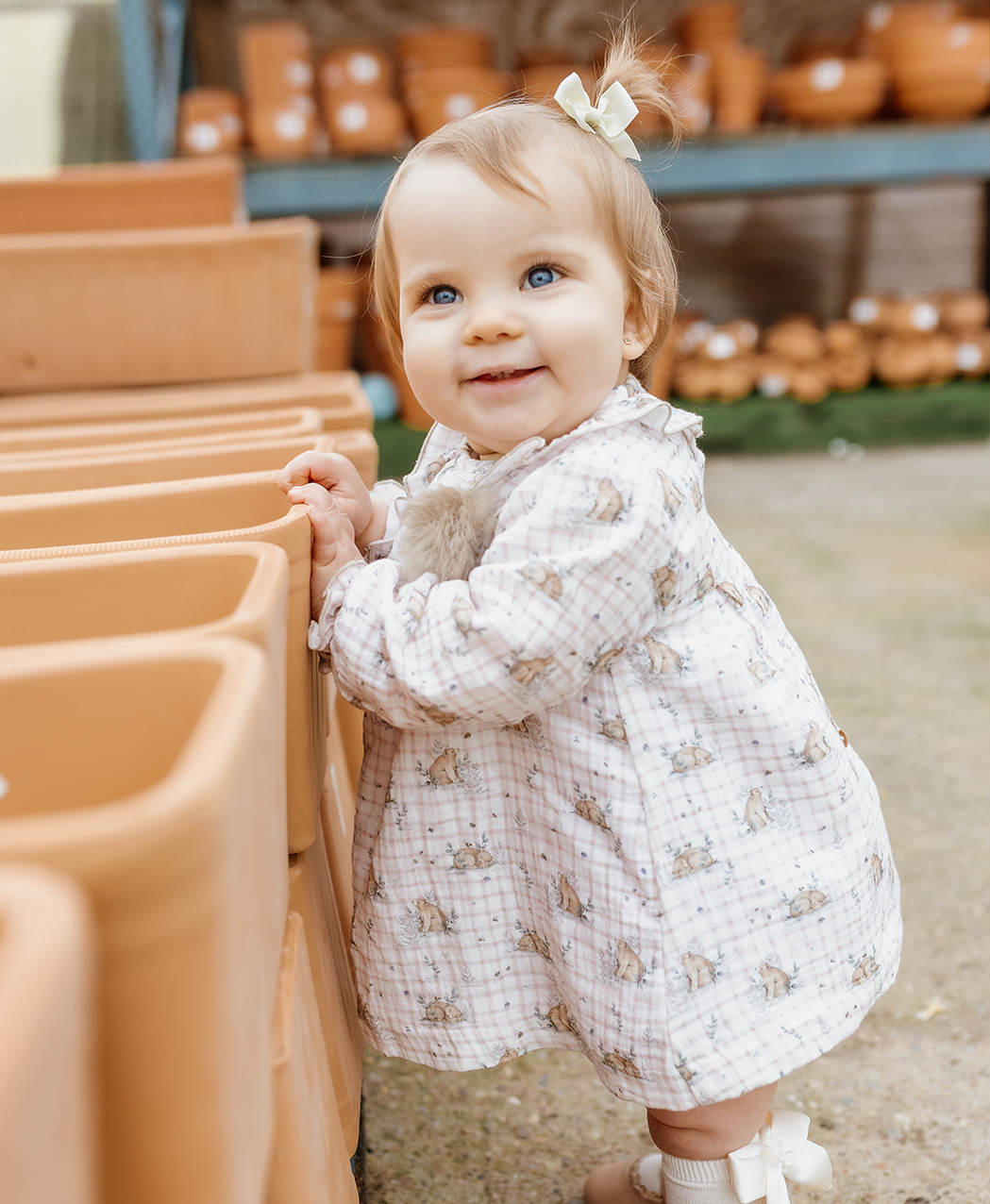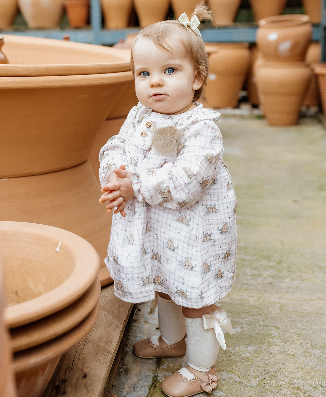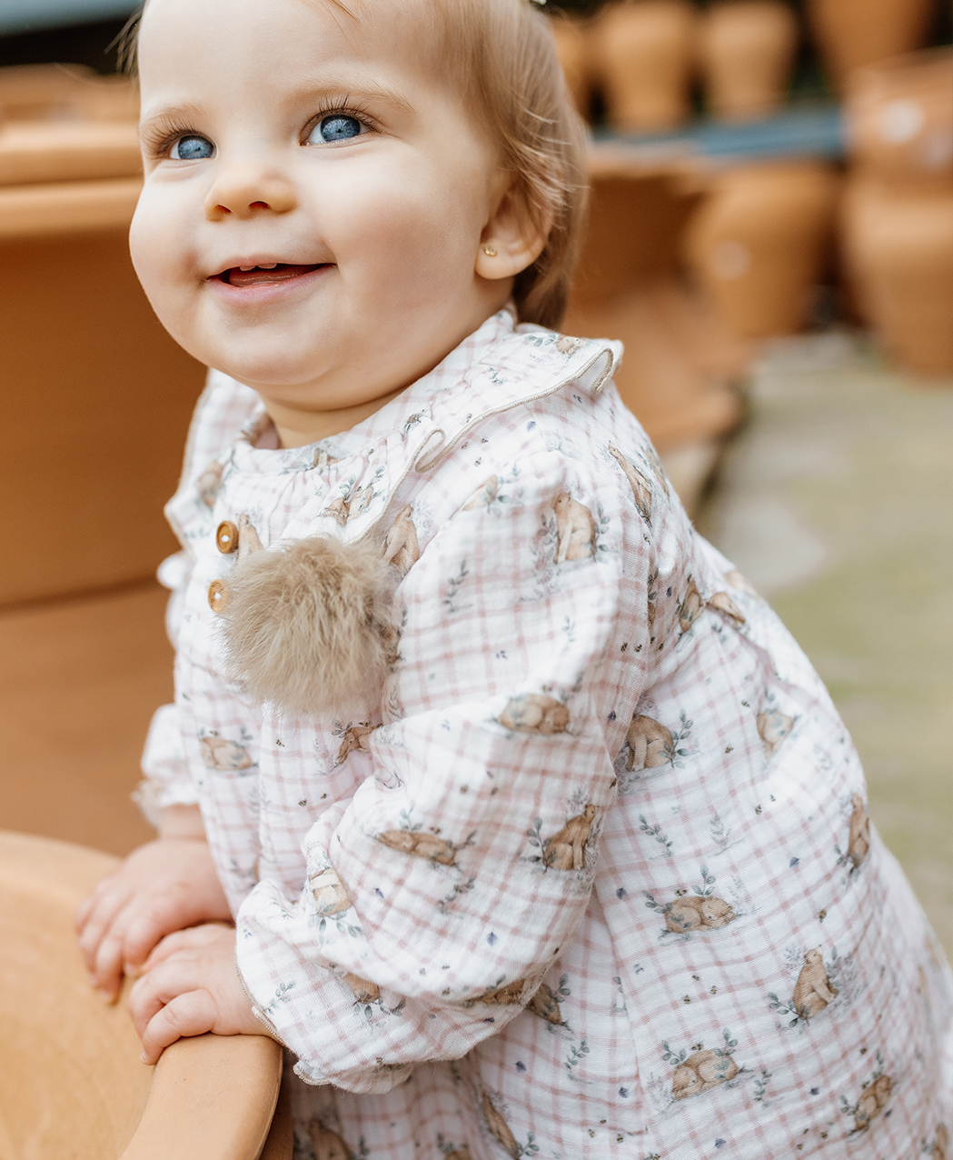 Jesusito bambula de cuadros en tono blanco y rosa. con estampado de osos. Volantes en el cuello en mismo estampado ribeteado en color marrón. Pompón en el pecho y falsos botones en madera. Elástico en manga y abertura en espalda con botones en madera. Braguita de bambula en mismo estampado,