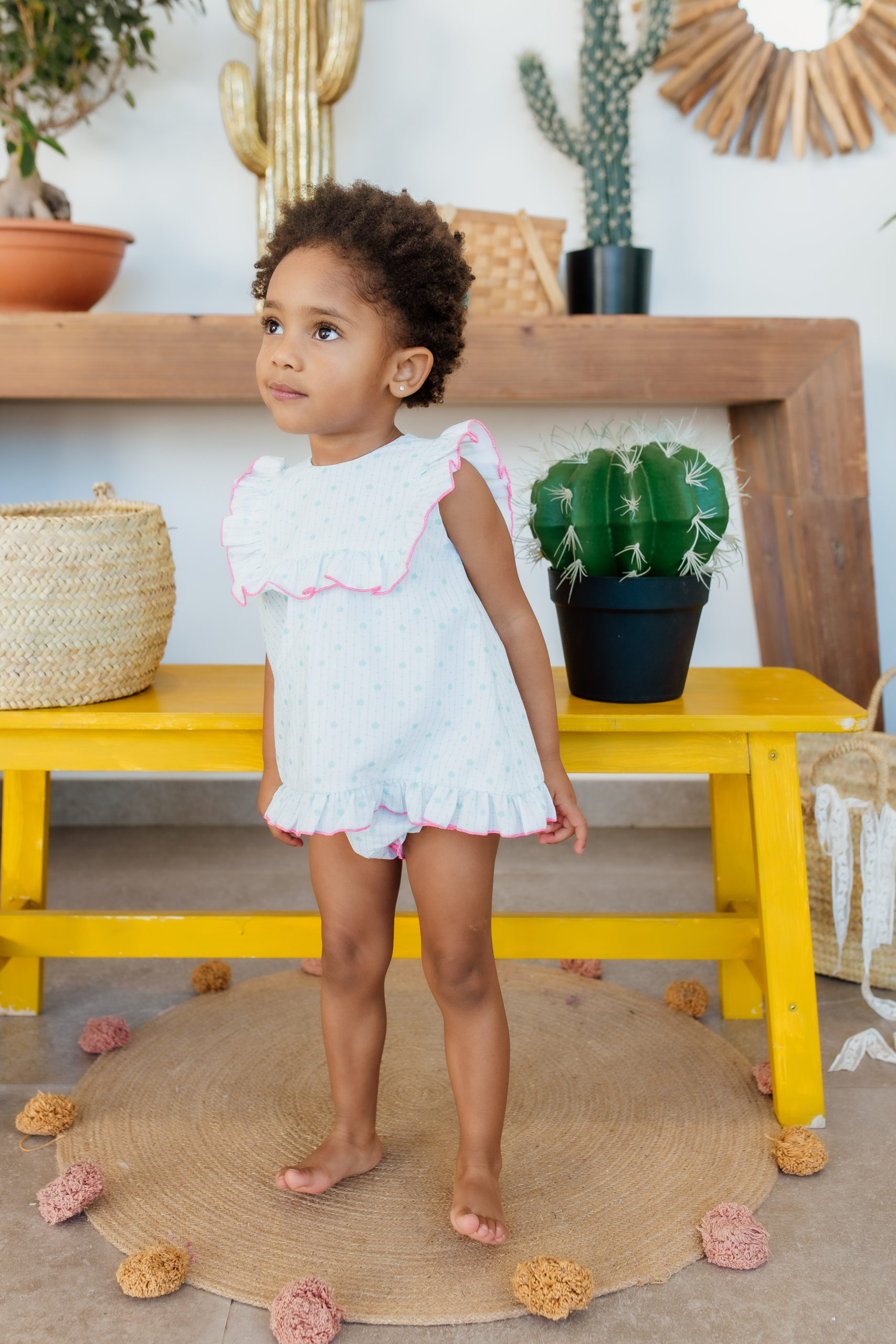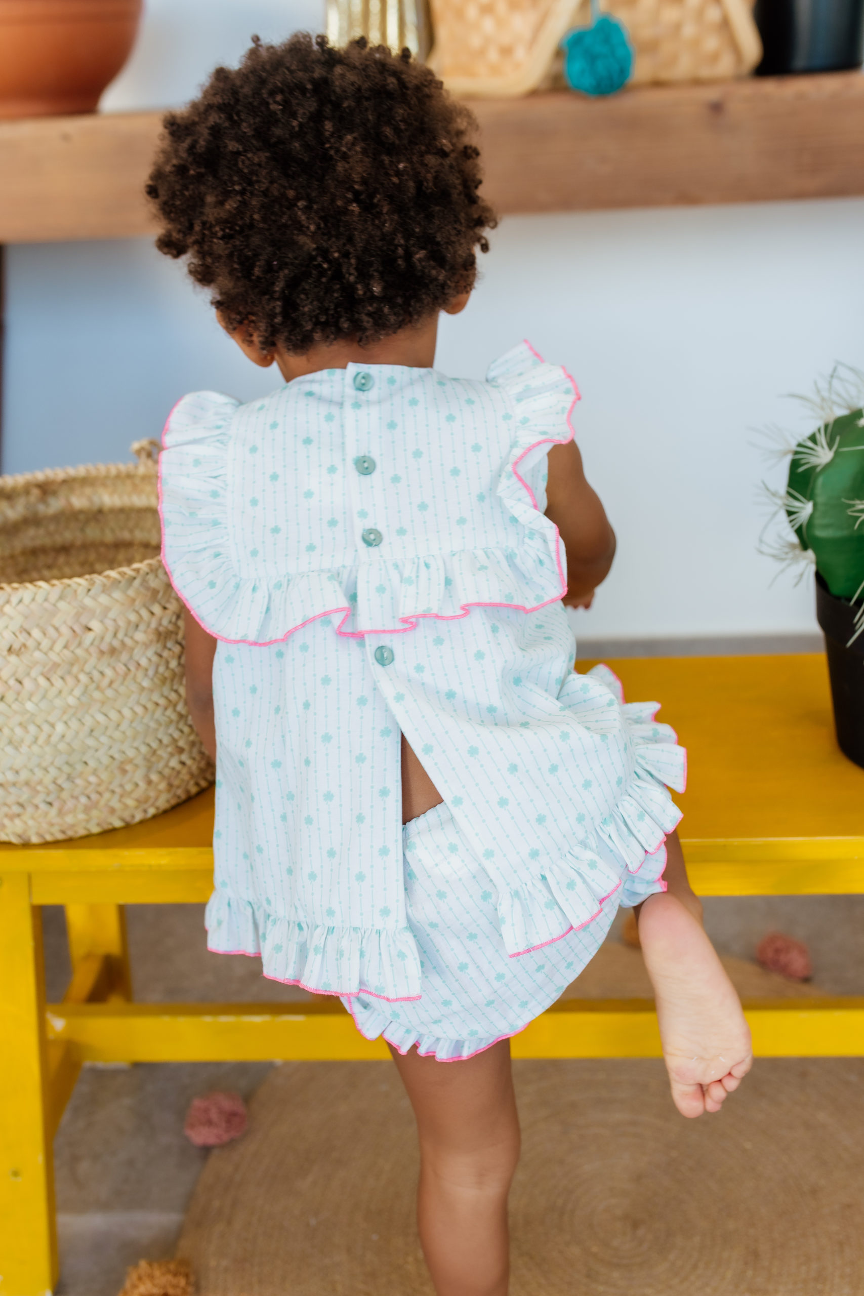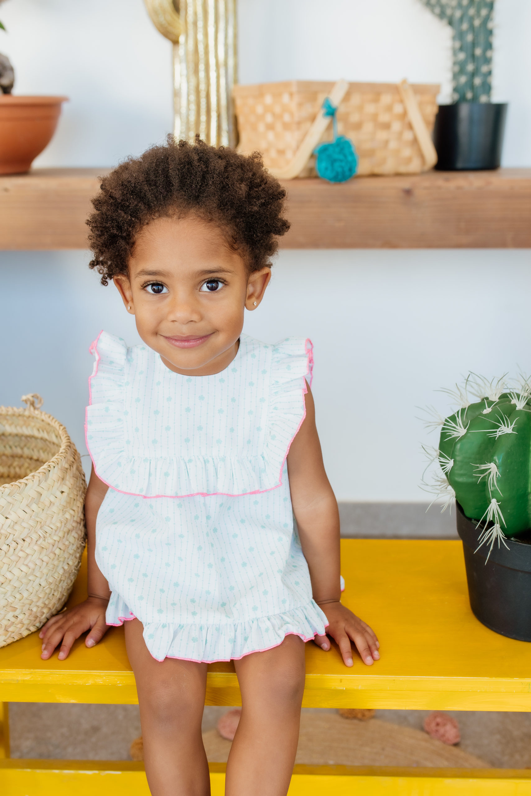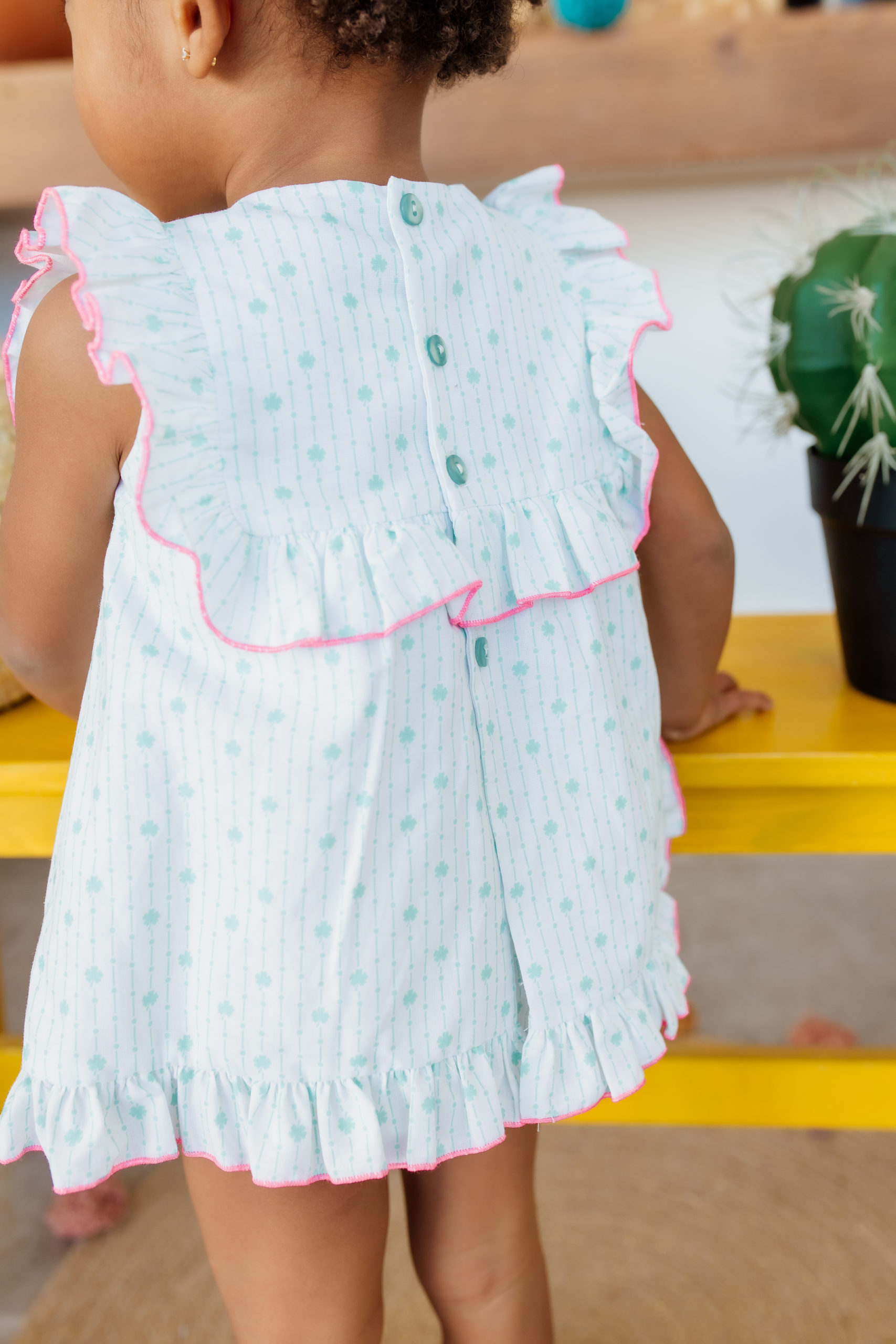 Jesusito color blanco en estampado de hojas color verde agua y bordado en color rosa. 100% algodón. Abertura en espalda con botones color verde.