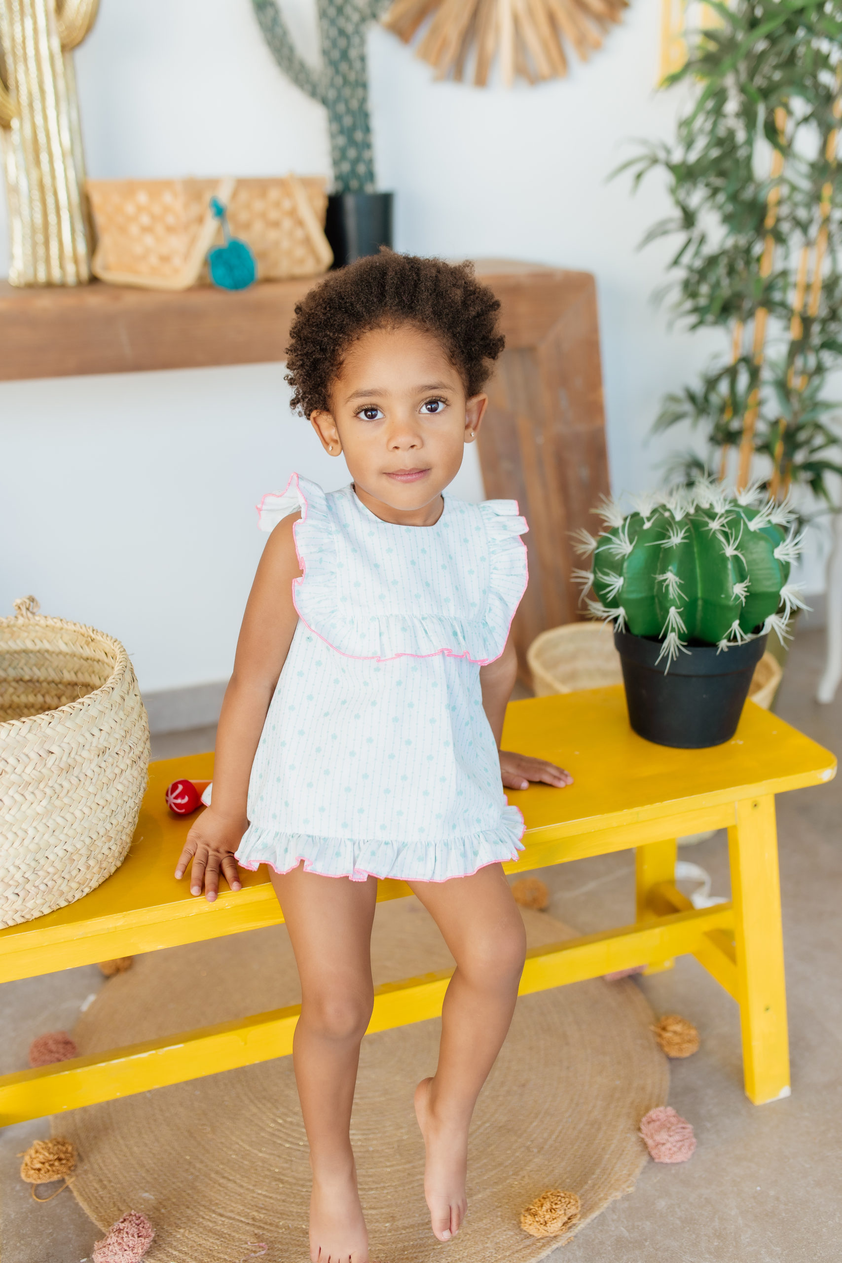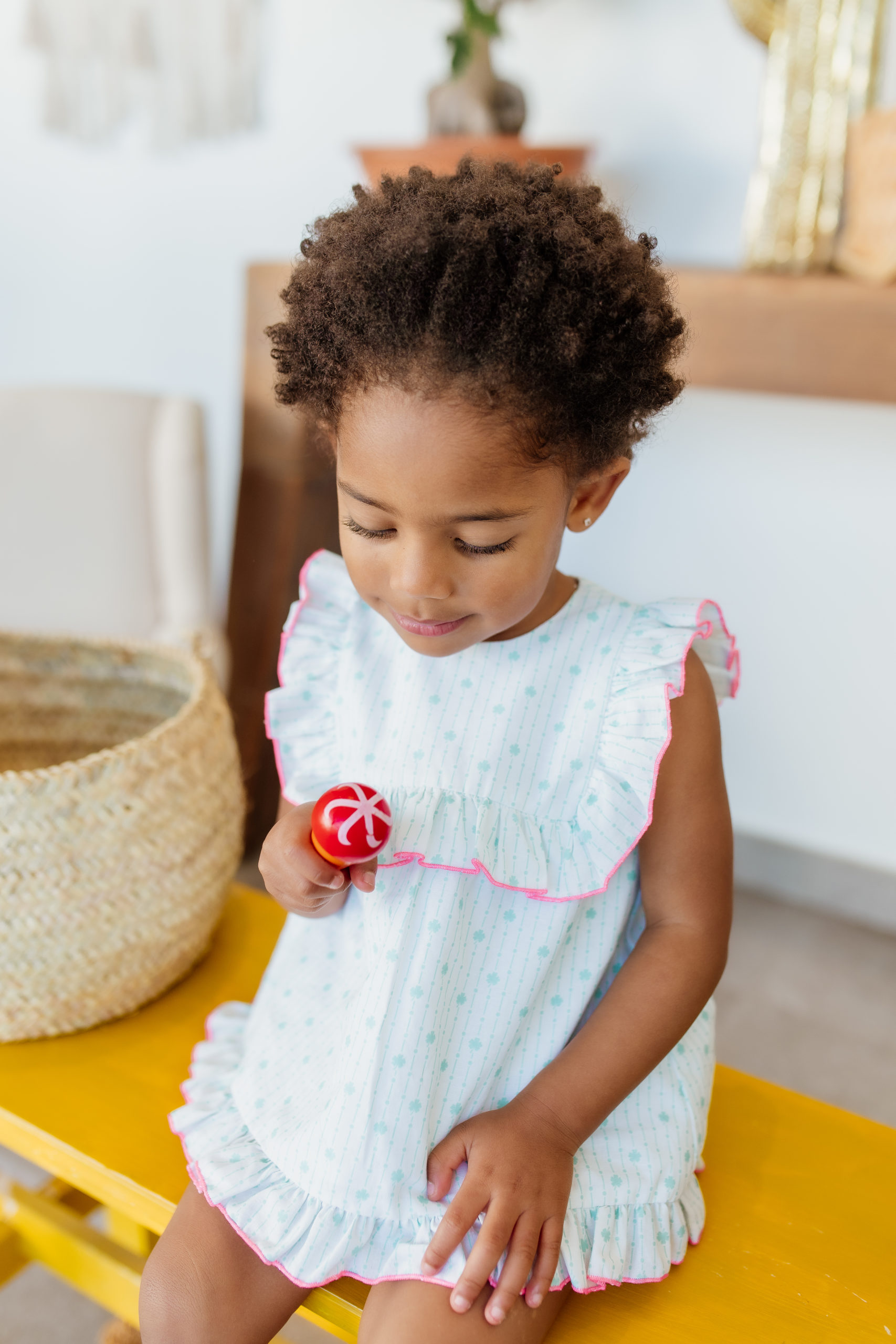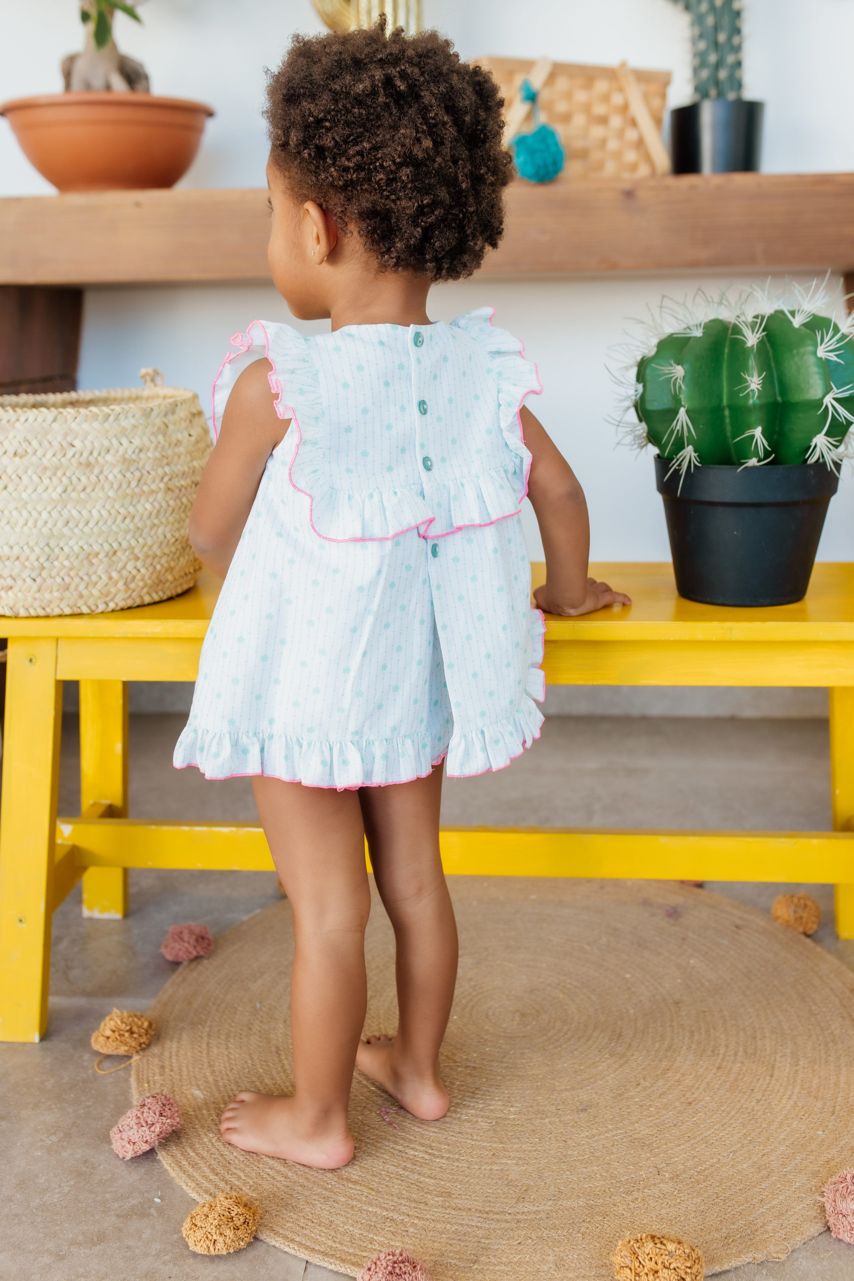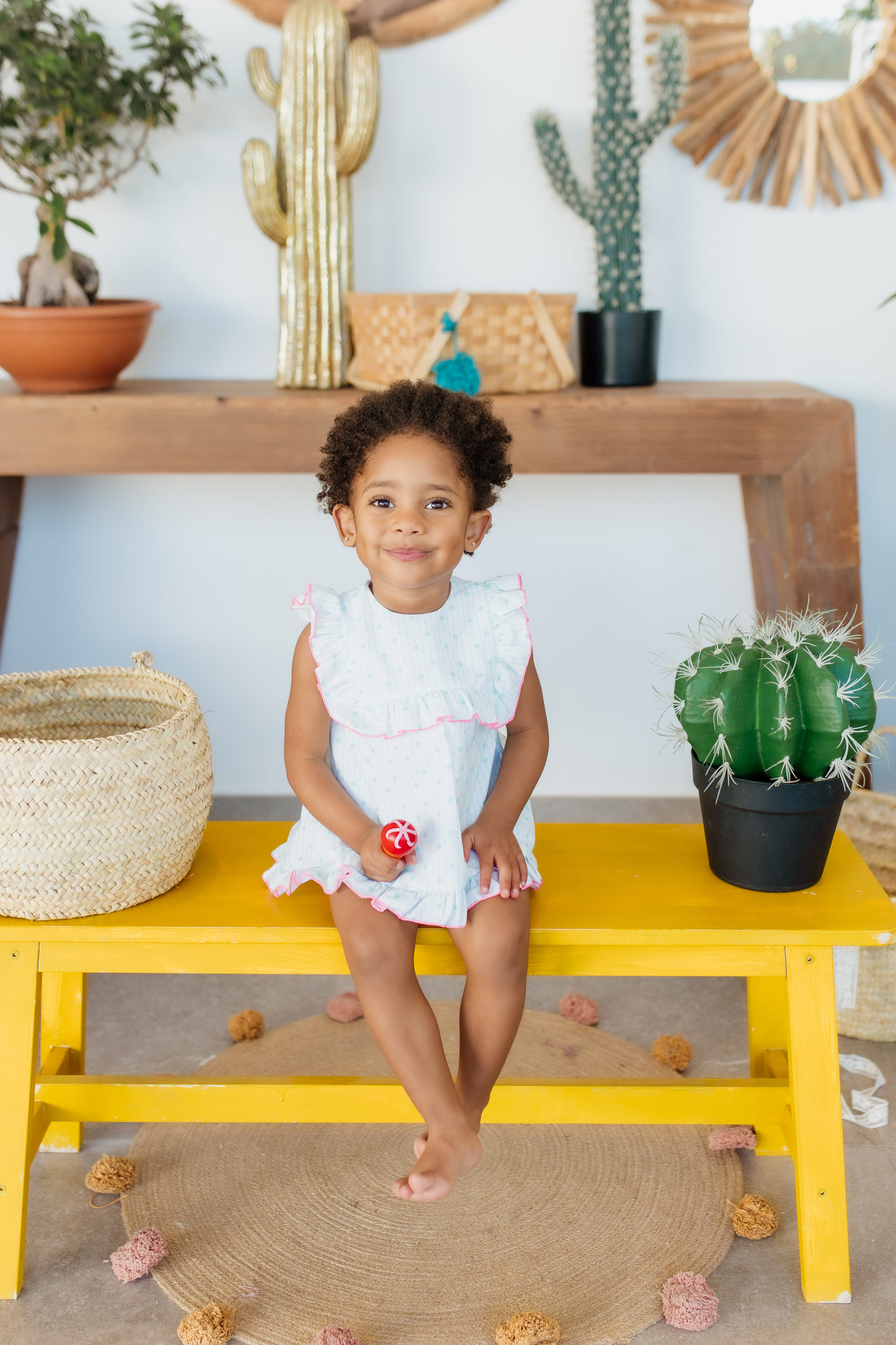 Jesusito color blanco en estampado de hojas color verde agua y bordado en color rosa. 100% algodón. Abertura en espalda con botones color verde.