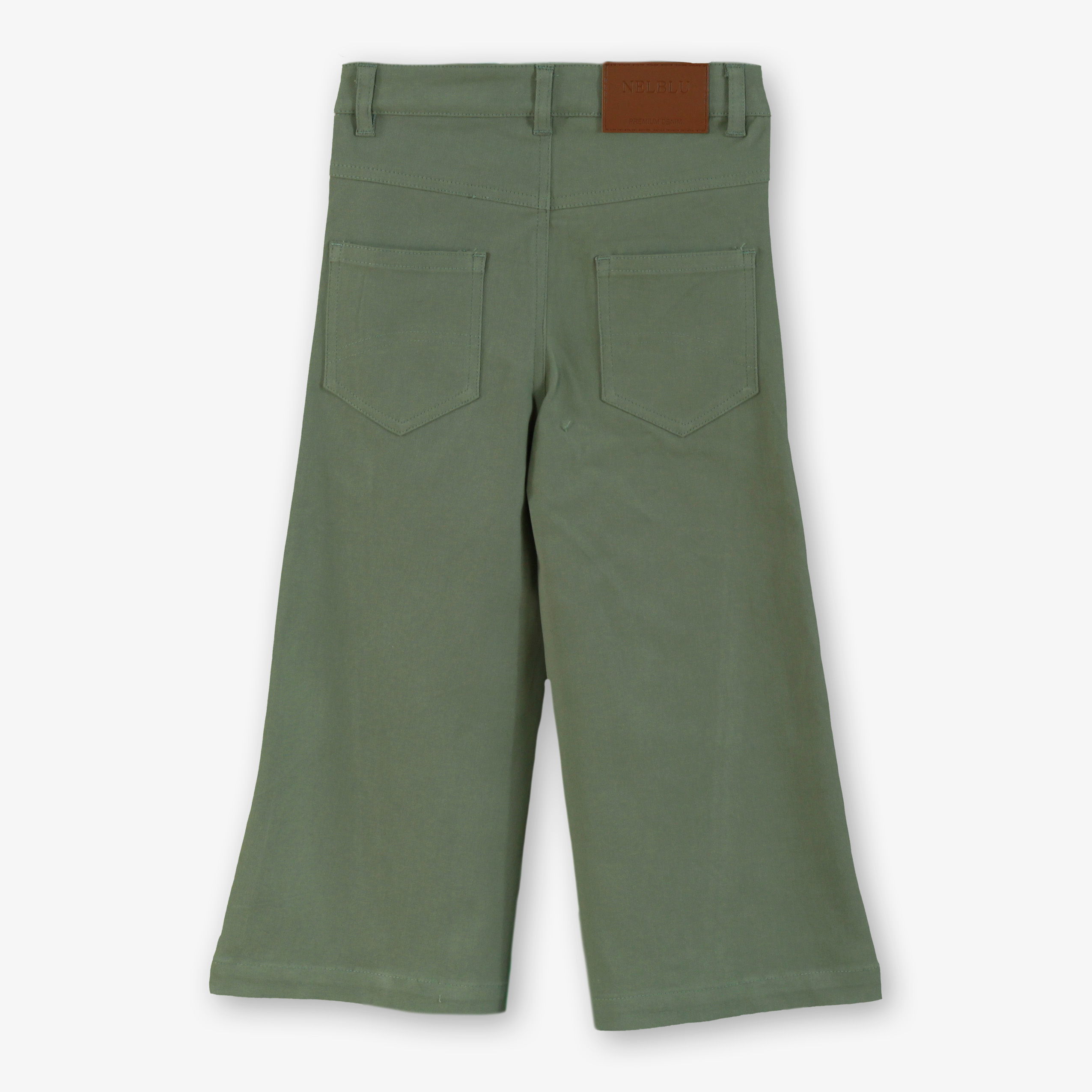 Pantalón vaquero en color verde, acampanado con dos bolsillos delanteros  y dos bolsillos traseros. Cintura ajustable.