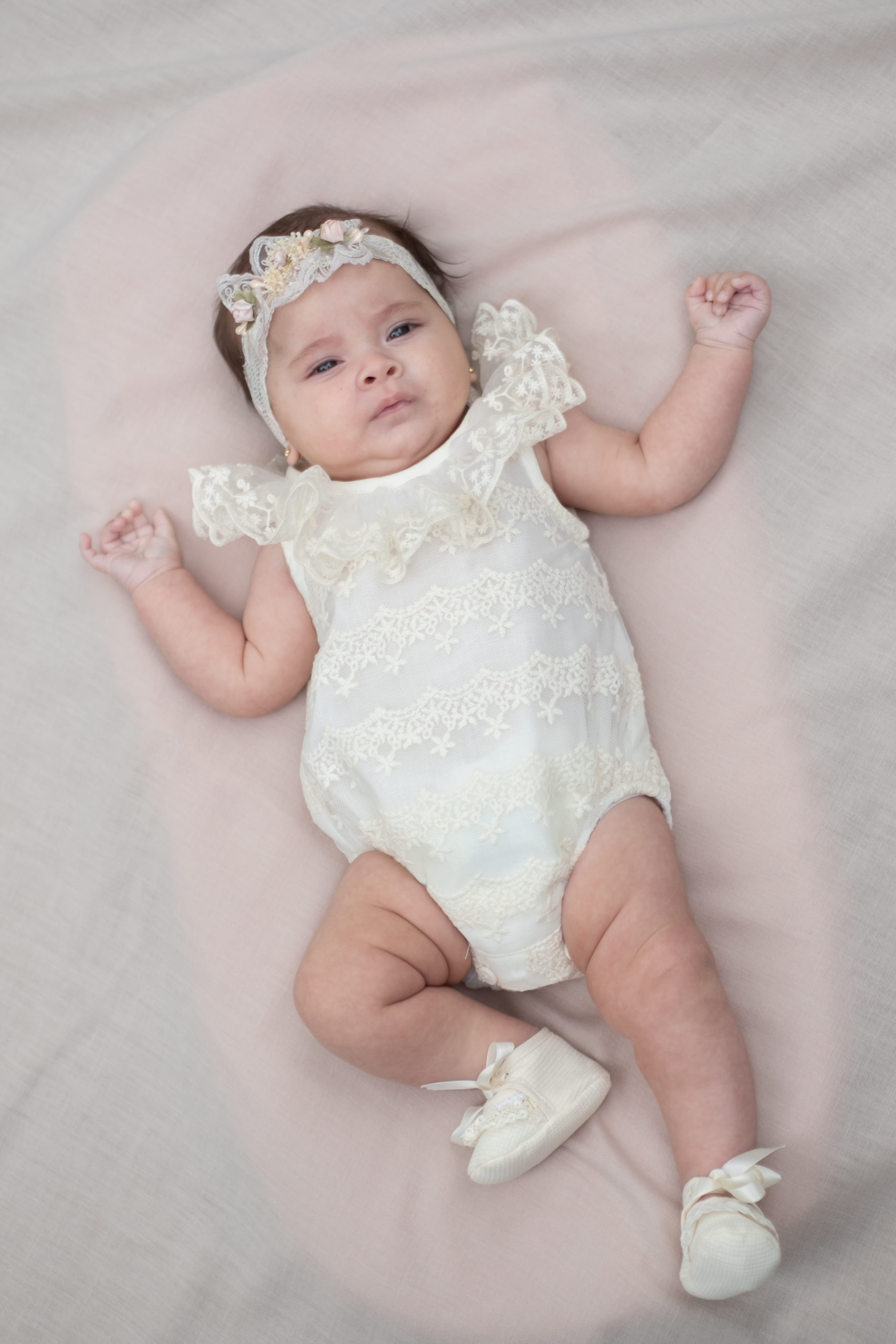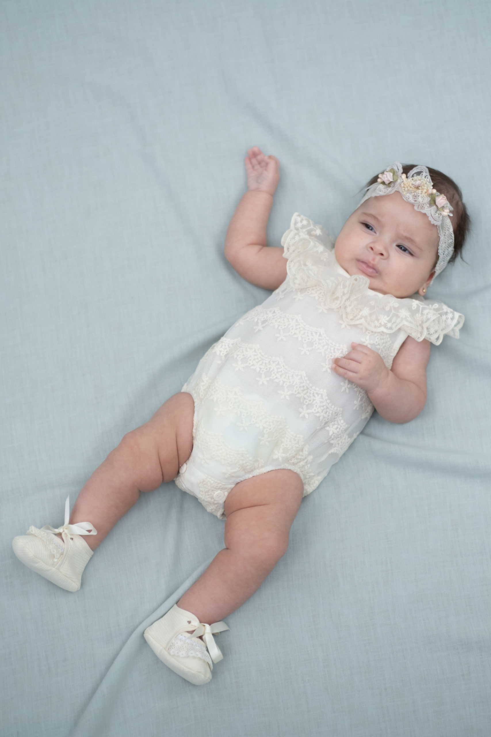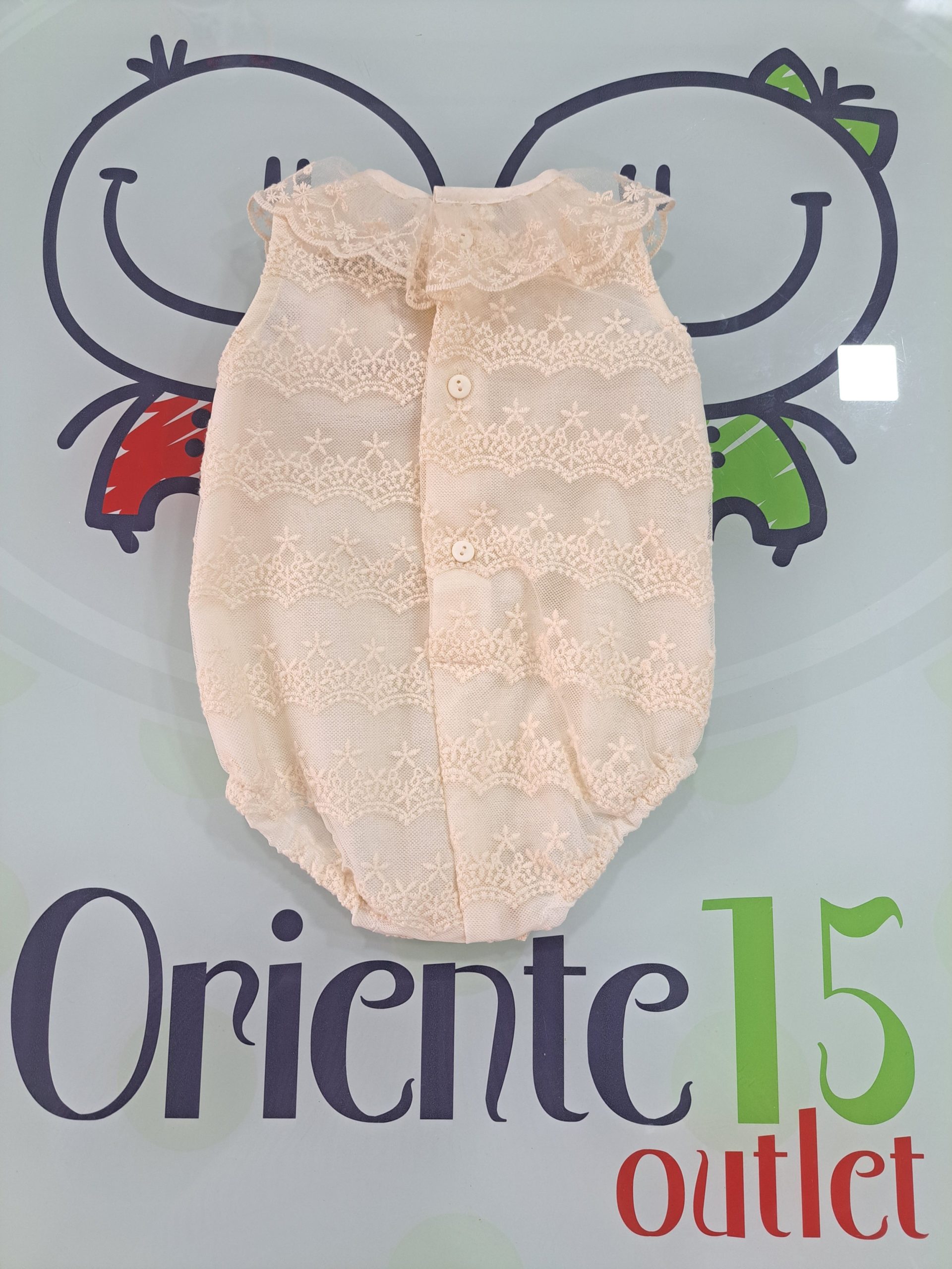 Pelele con encaje de flores en color marfil, cuello volante y abertura en espalda y zona del pañal. Ideal para bautizo o ceremonia por su elegancia.