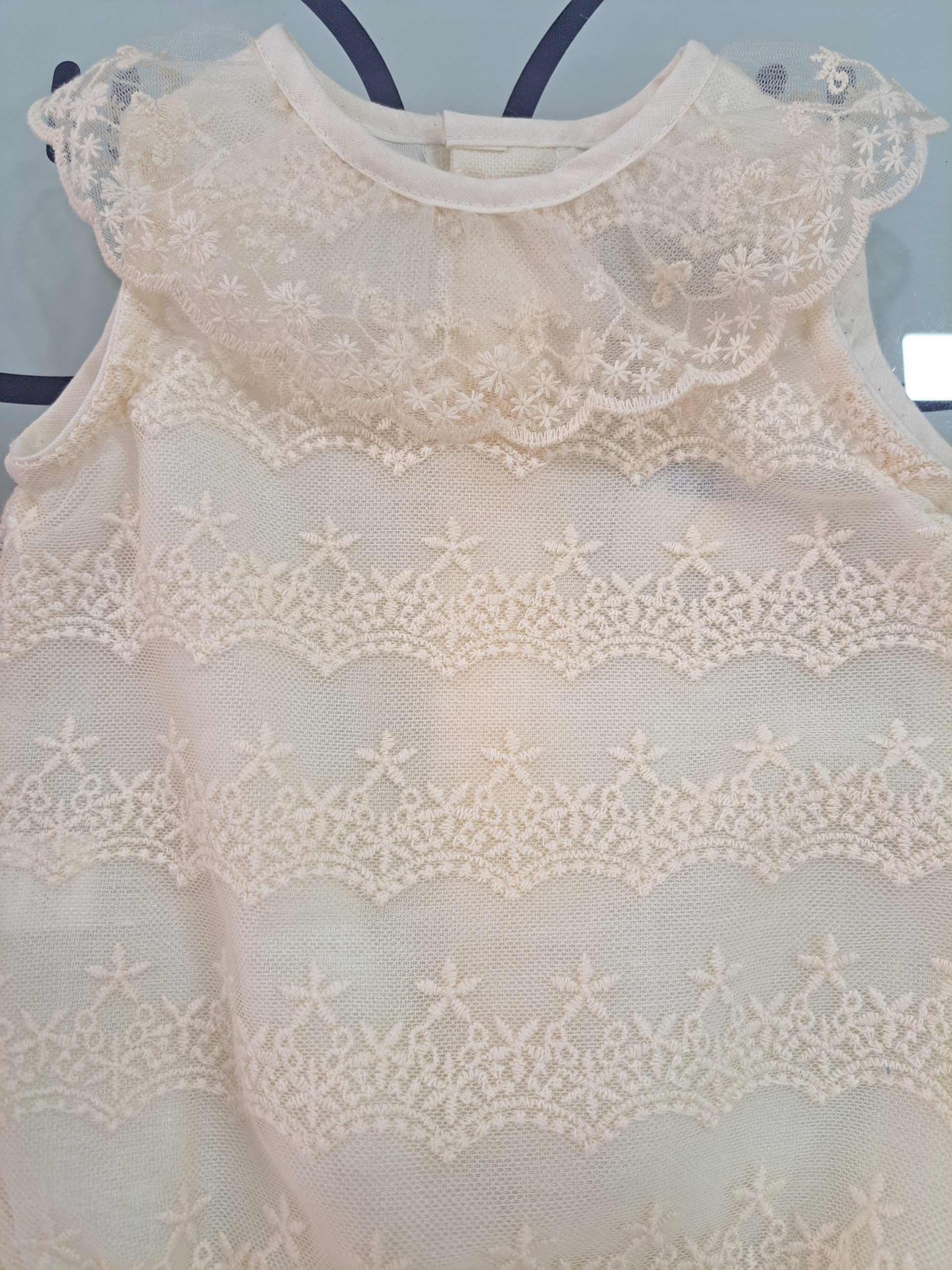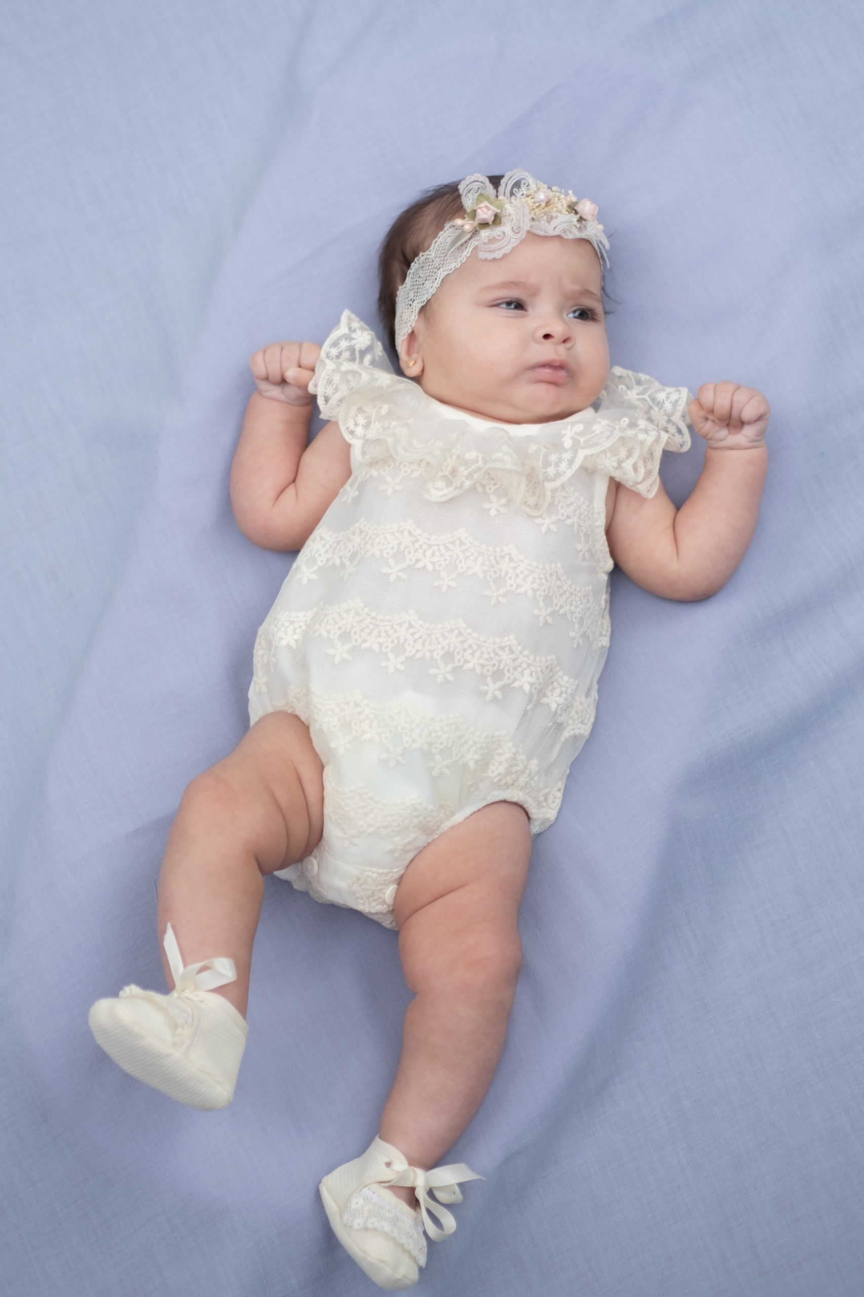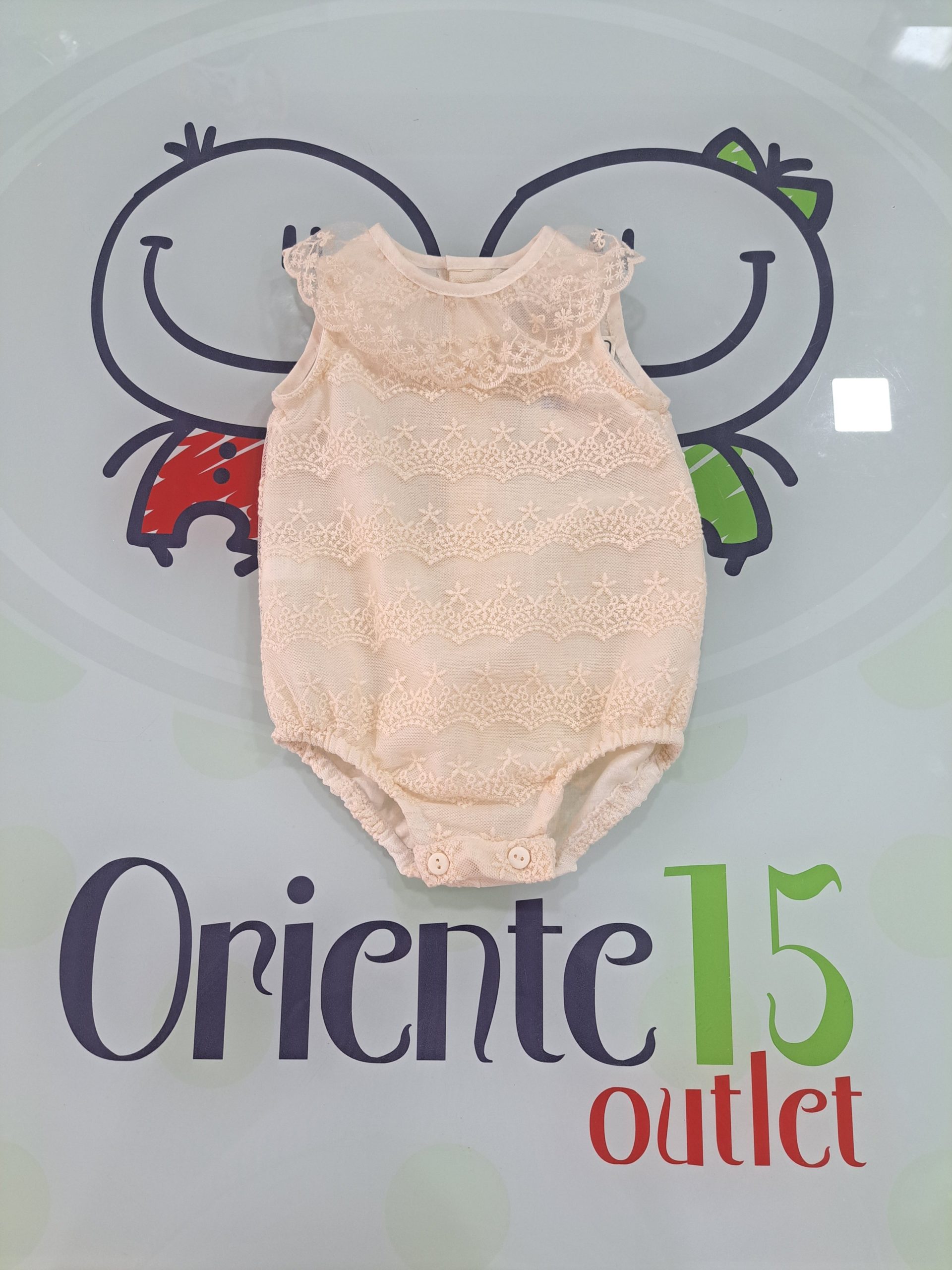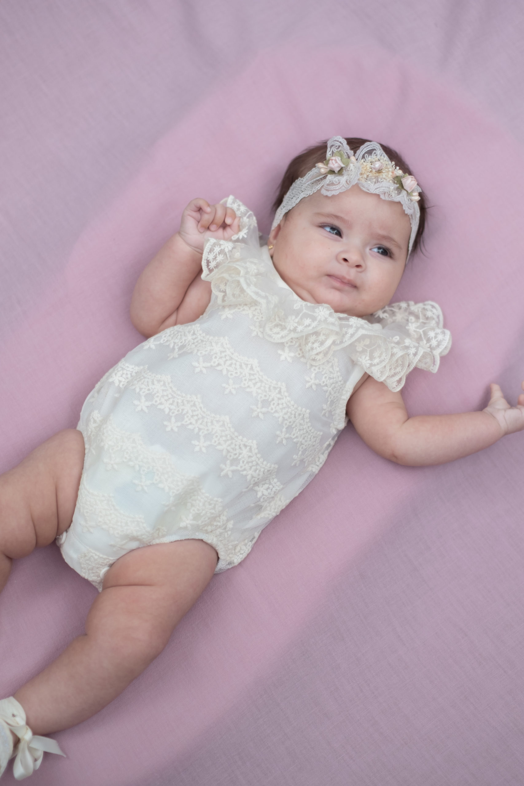 Pelele con encaje de flores en color marfil, cuello volante y abertura en espalda y zona del pañal. Ideal para bautizo o ceremonia por su elegancia.