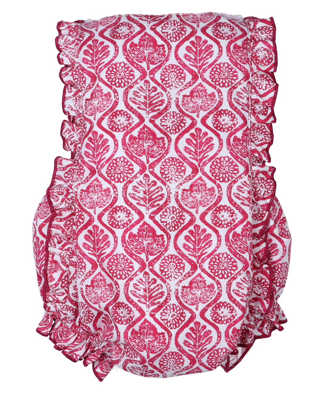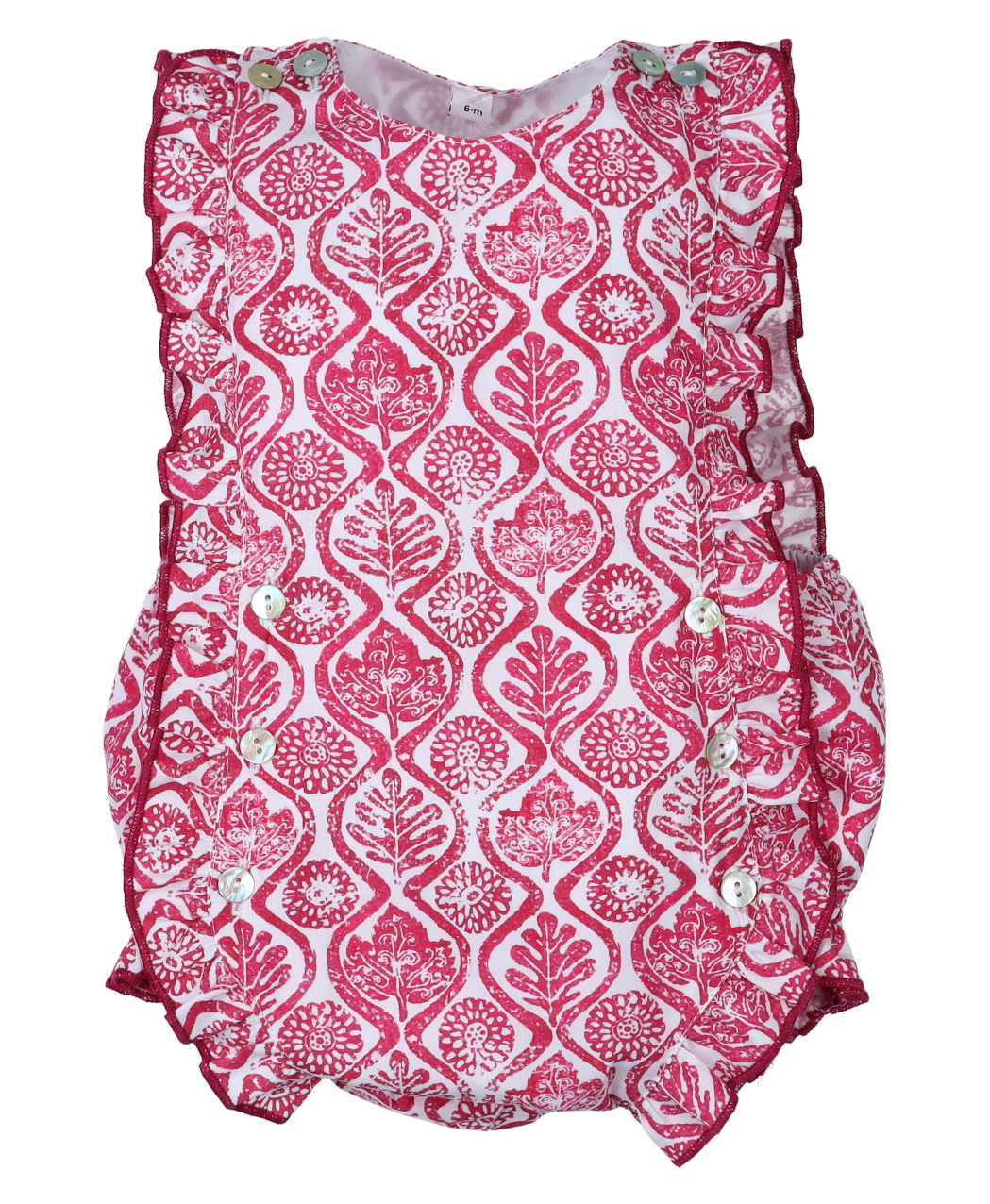 Pelele en estampado de hojas y flores, tono rosa y blanco, volantes y abertura en la zona del pañal.