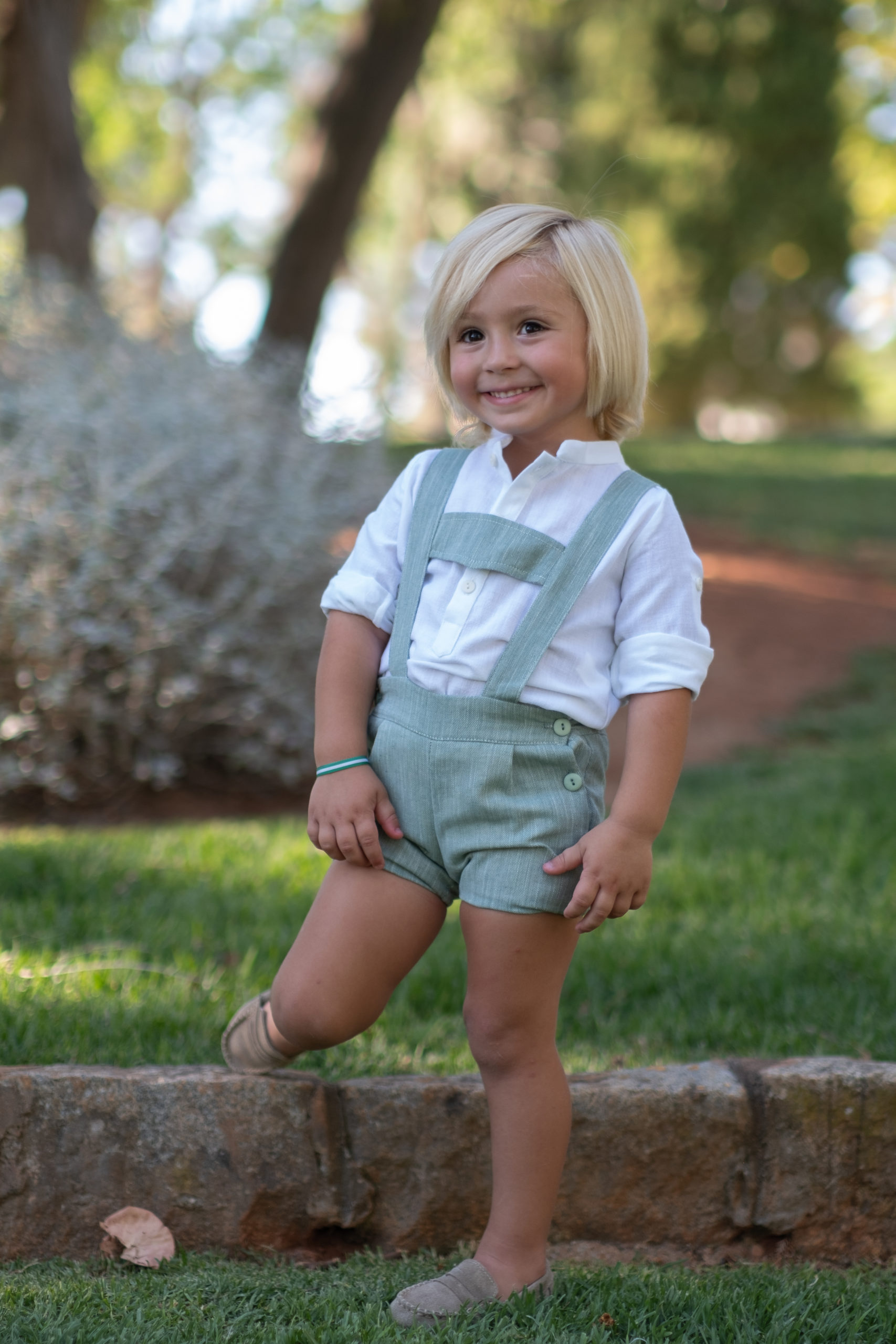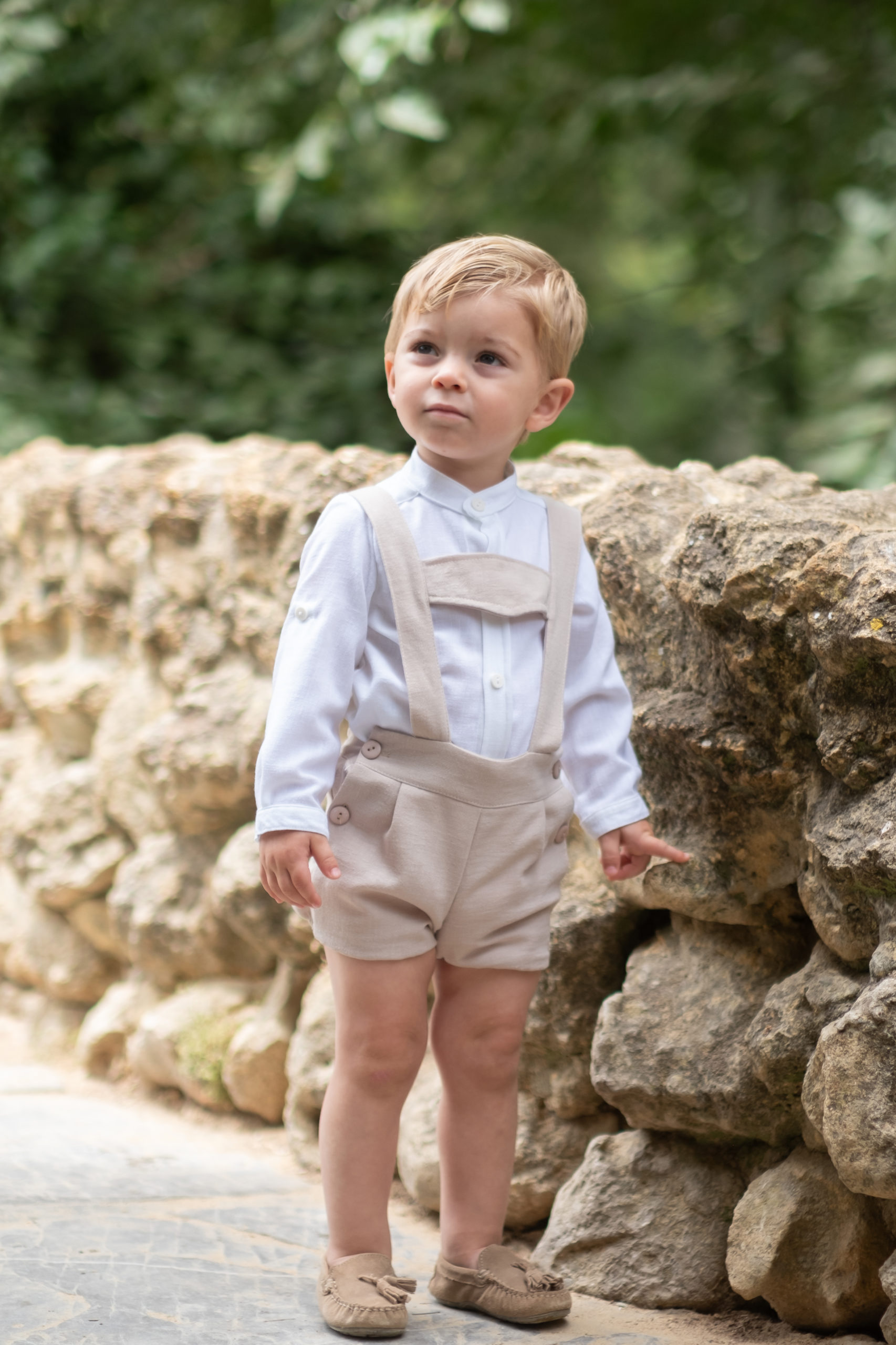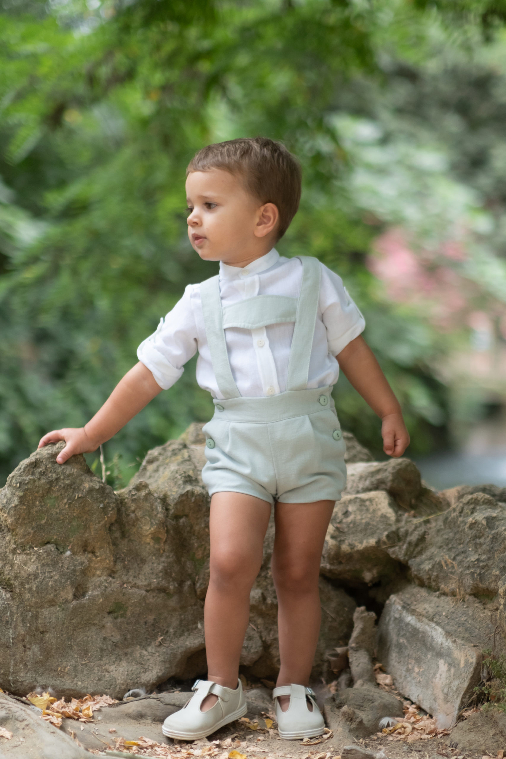 Conjunto de lino formado por camisa blanca con cuello bebé hasta los 18 meses y cuello mao a partir de los 2 años + peto. Camisa con cuello bebé, manga remangable con botón y abertura en espalda con botones de nácar. Camisa con cuello mao, manga remangable con botón y abertura delantera hasta zona ombligo con botón de nácar. Peto con tirantes y tira en pecho. Abertura tanto con los tirantes en espalda como con botones laterales, cintura ajustable con elástico y botón.