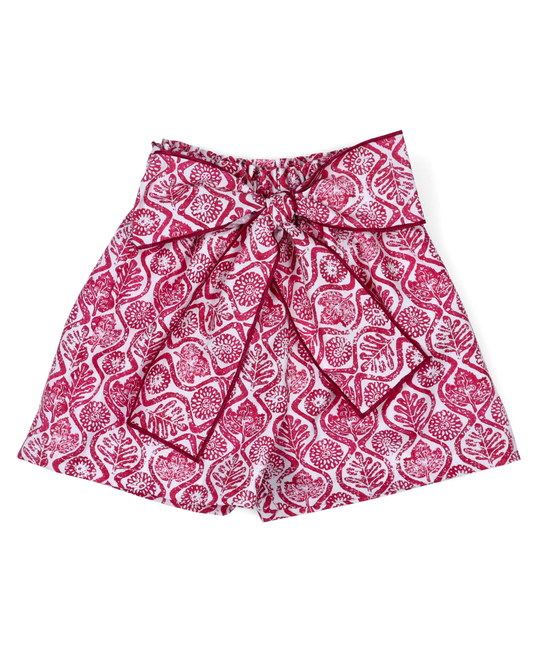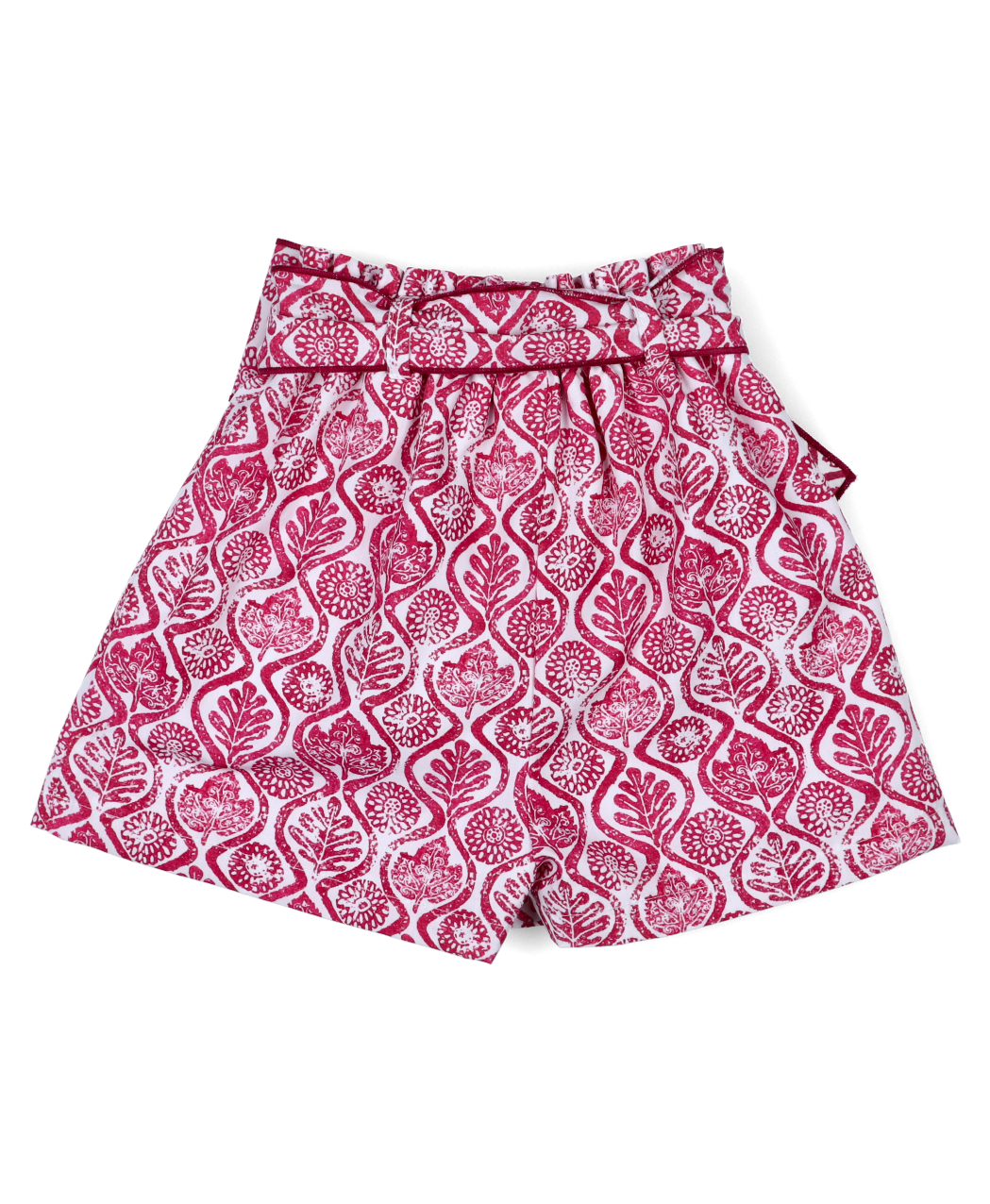 Short en tono blanco y rosa, con estampado de flores y hojas, cintura elástica con cinturón.