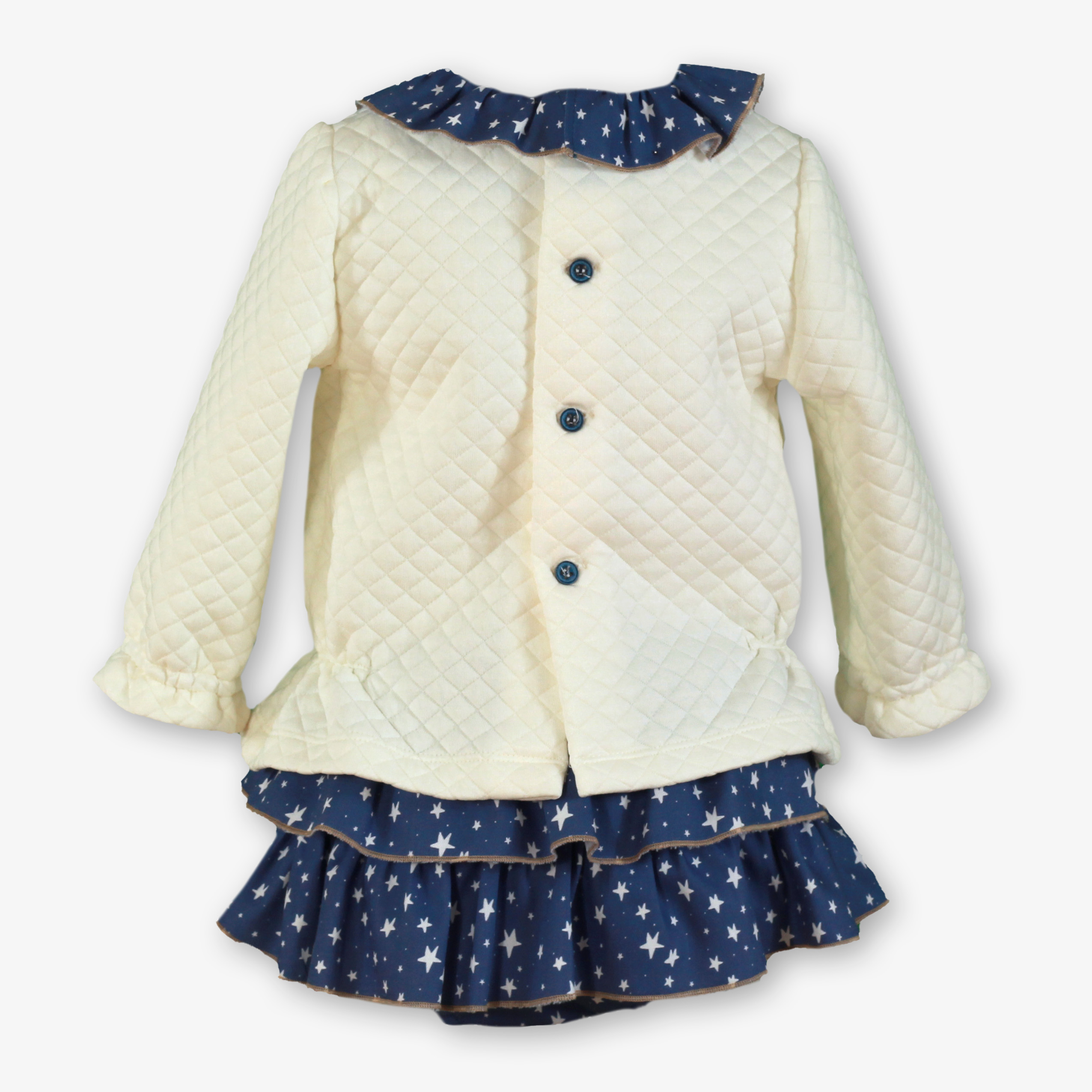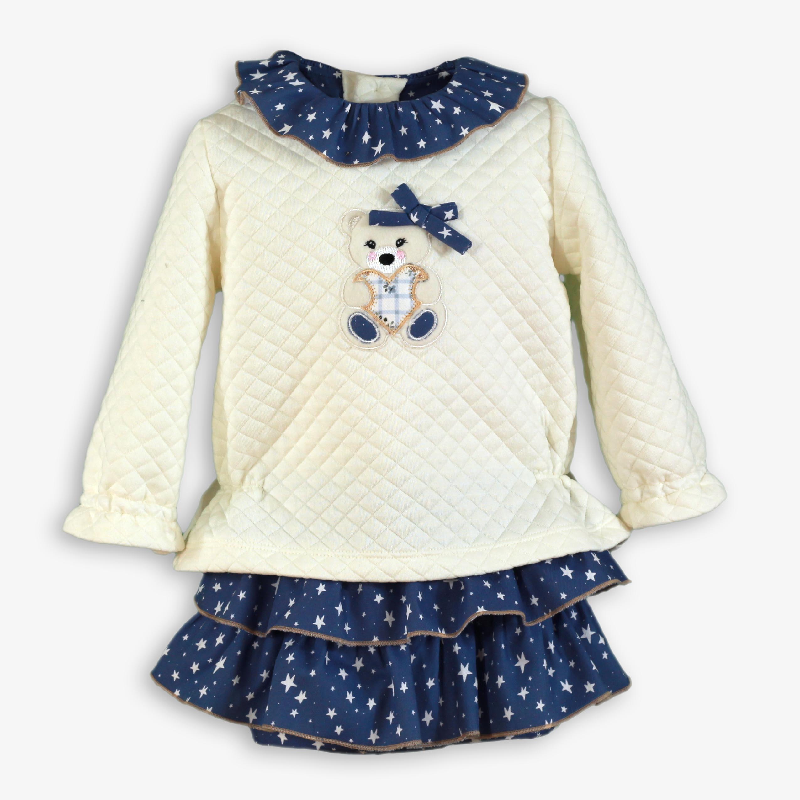 Sudadera en color blanco hueso con ilustración de oso bordado en tonos marfil, celeste, rosa y azul. Con lazo y cuello en color azul con estampado de estrellitas en tonos blanco, manga elástica. Abertura trasera por botones. Braga falda en color azul con estampado de estrellitas en tonos blanco, cintura elástica.